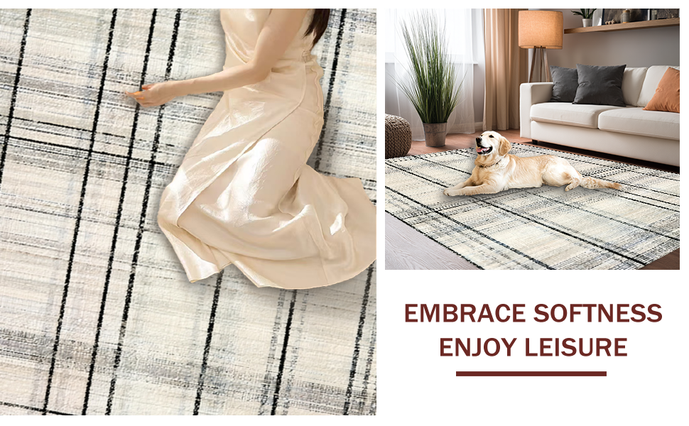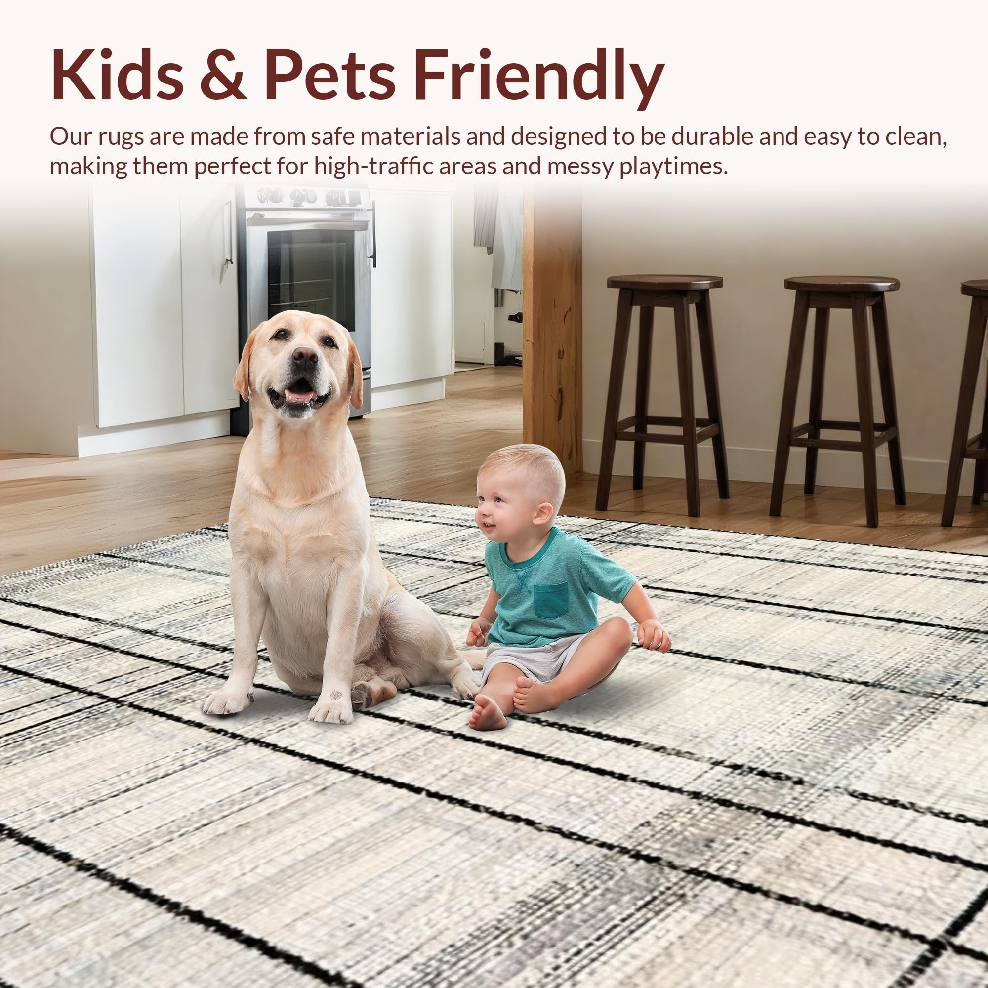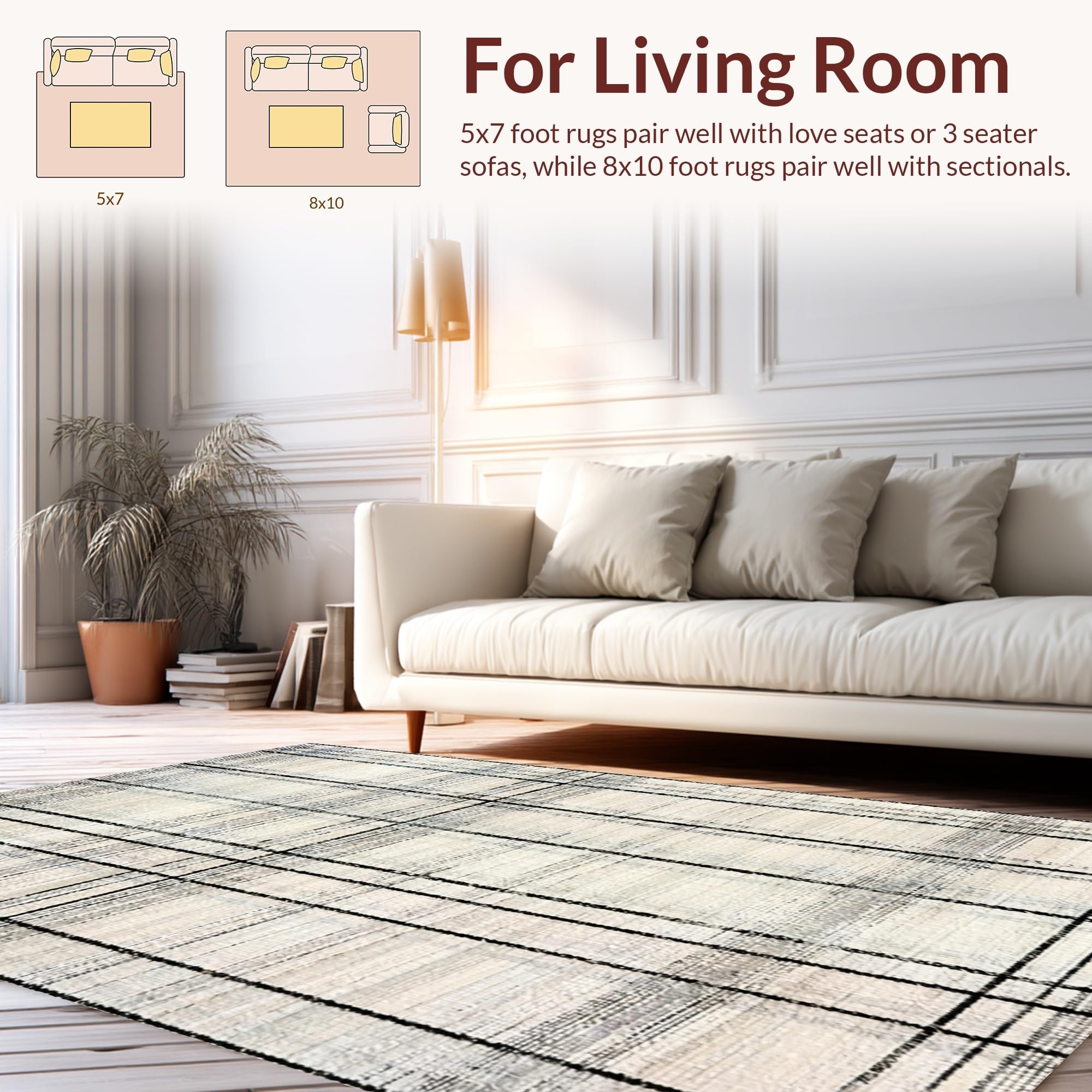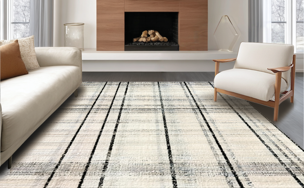 Ultra Soft Area Rug, Non Slip, Stain Resistant, Washable Area Rugs for Living Room, Bedroom, Classic Accent Rug with Striking Alternating Lines and Minimalist Stripe Design(Beige) Overview: