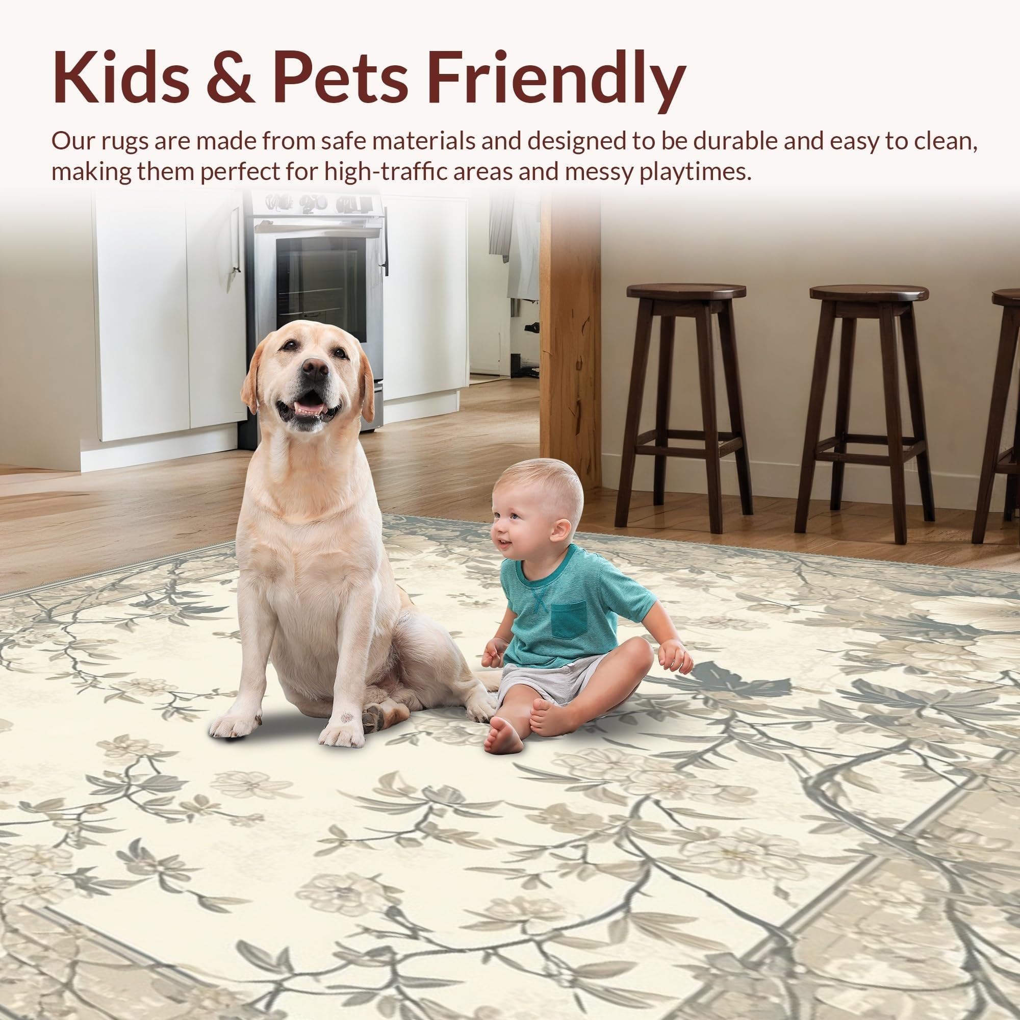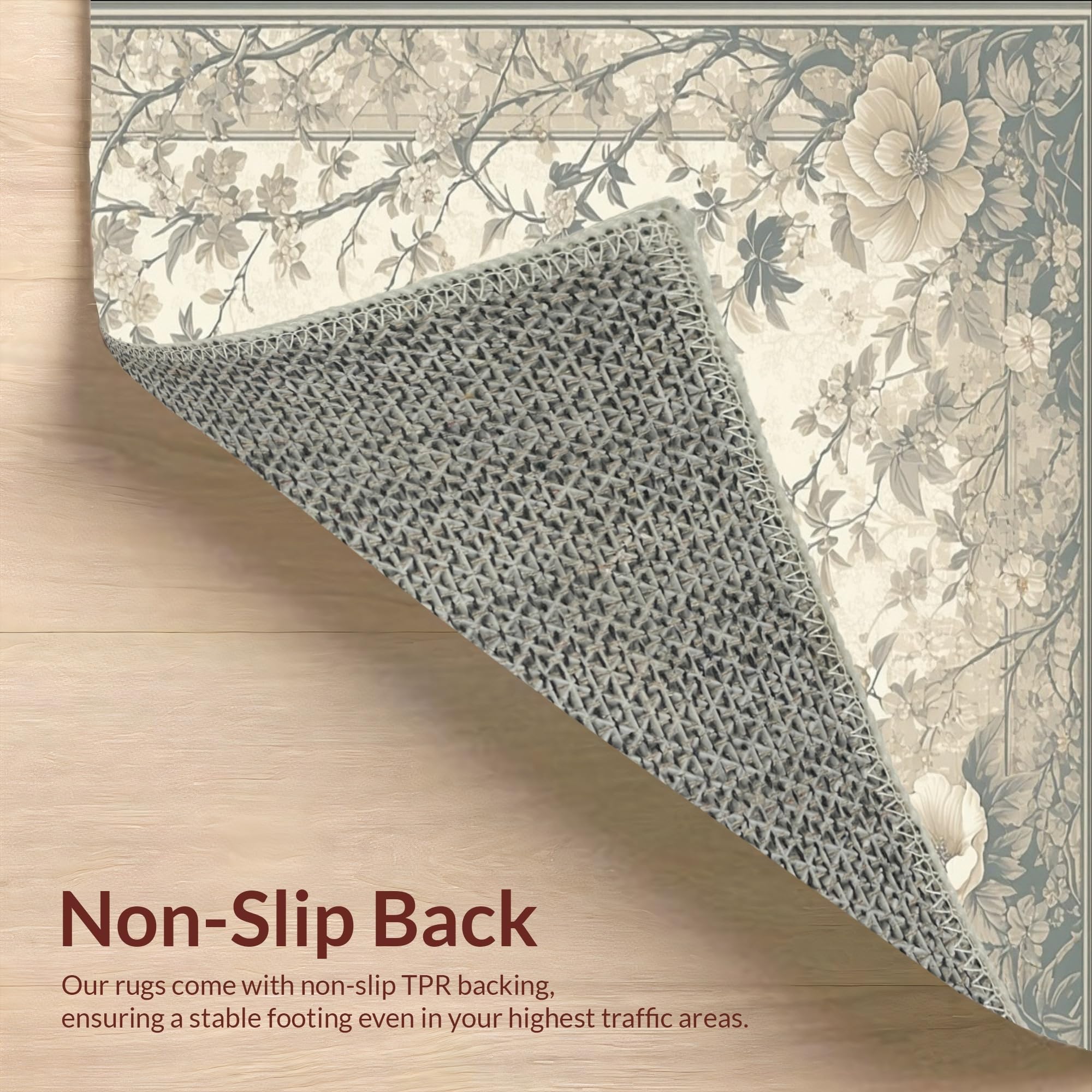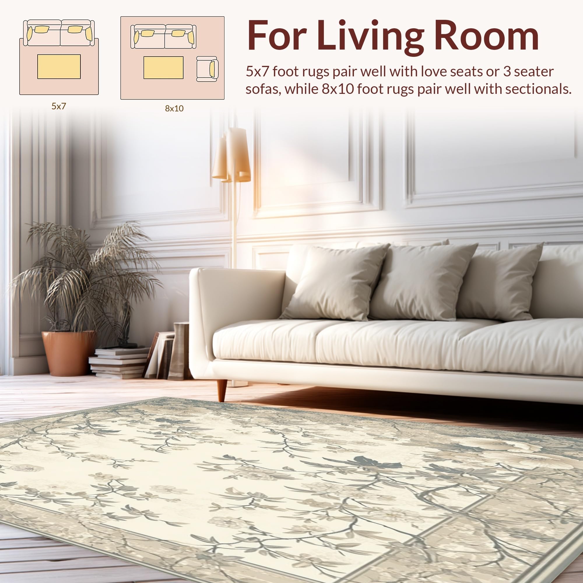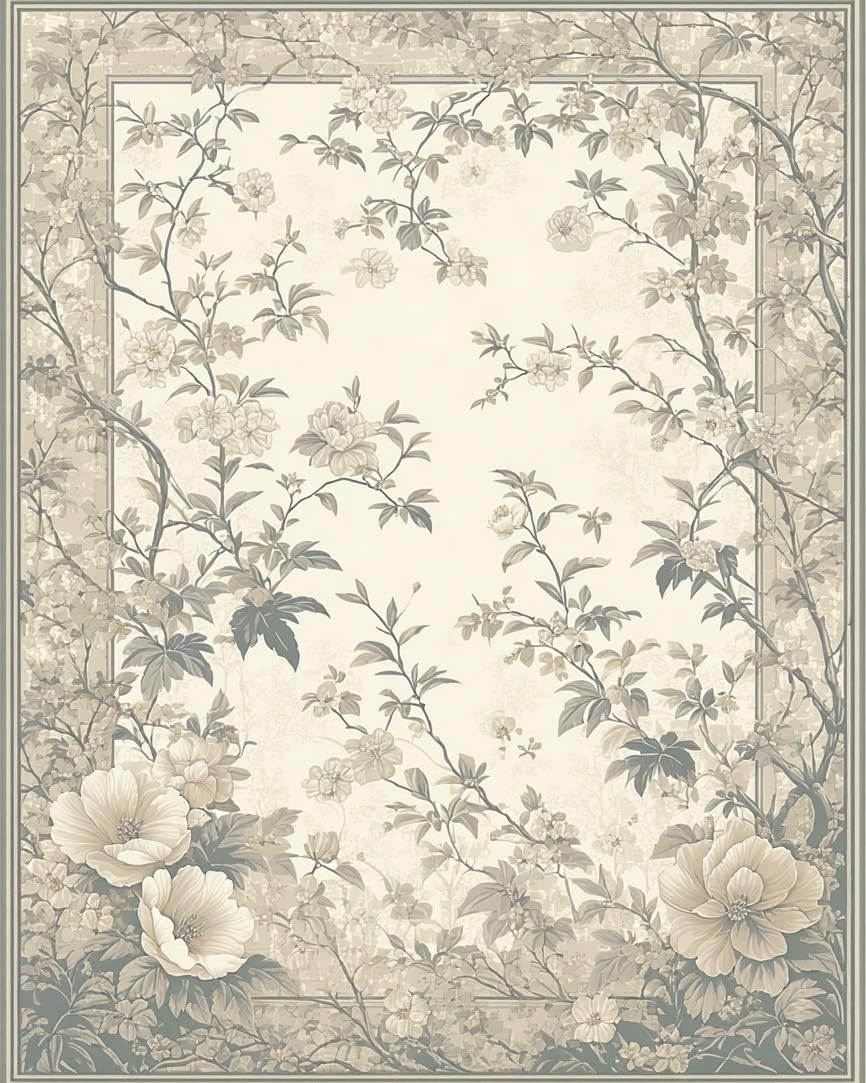 Ultra Soft Area Rug, Non Slip, Stain Resistant, Washable Area Rugs for Living Room, Bedroom, Classic Botanical in Smoke and Beige with Refined Floral Silhouettes(Beige) Overview: