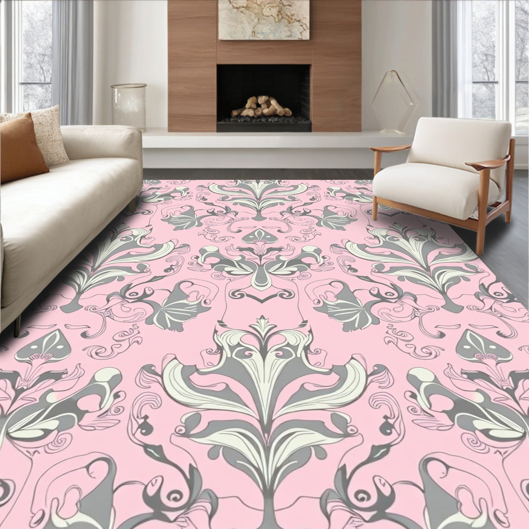 Flatwoven High Traffic Area Rug, Classic Floral Damask Motif Enhanced by Subtle Pastel Filigree Detailing, Non Slip, Stain Resistant, Washable Area Rugs for Living Room, Bedroom (Pink) Overview: