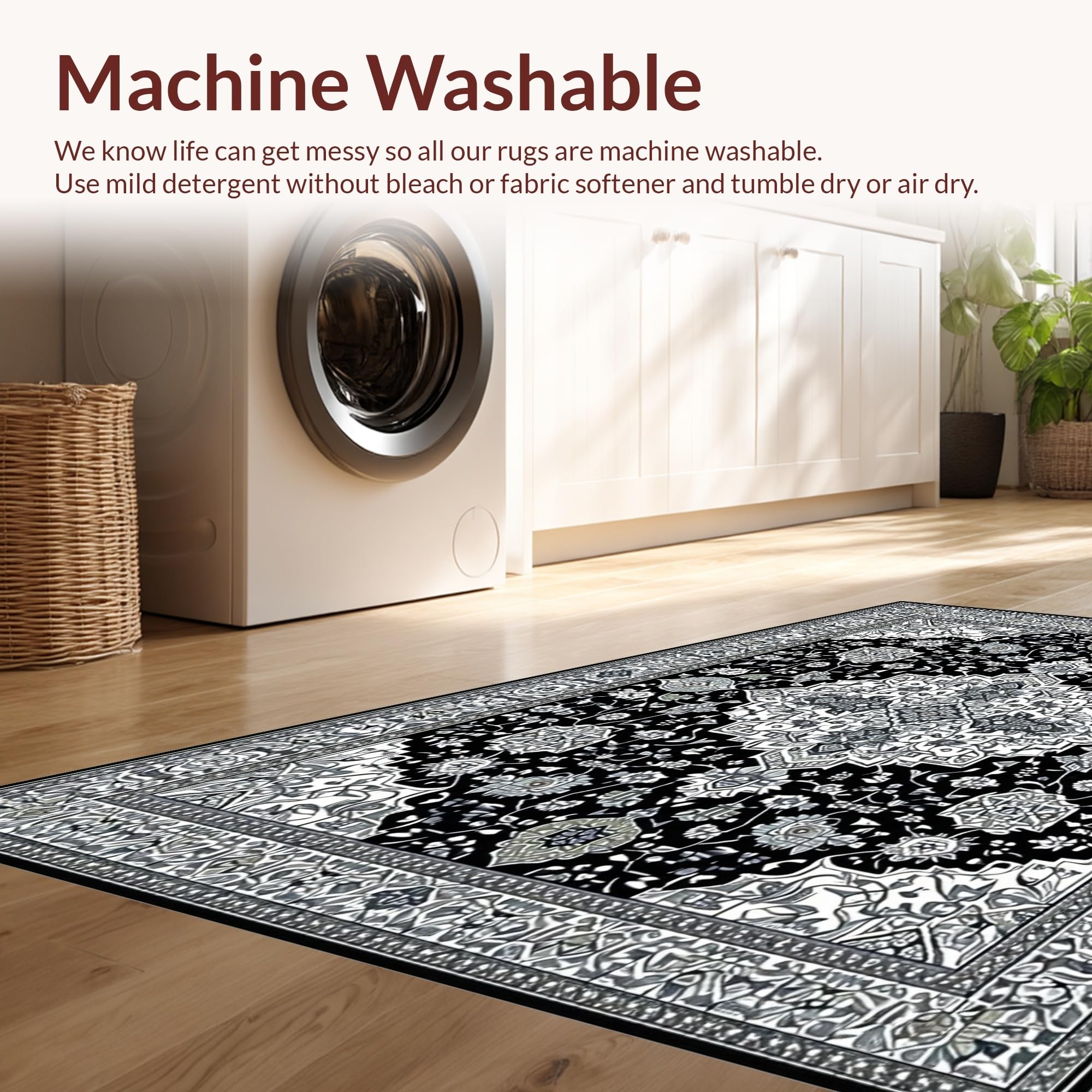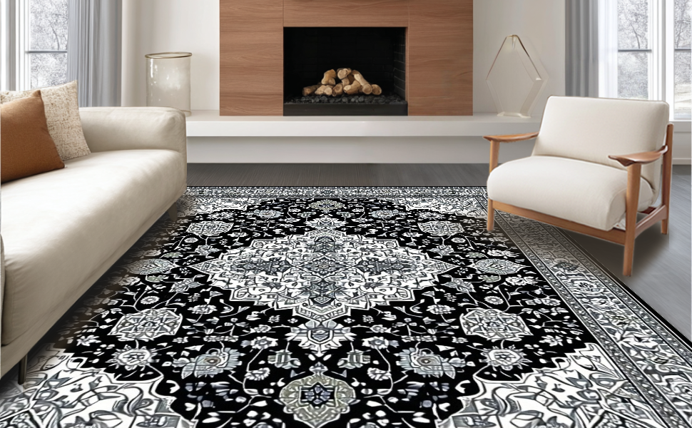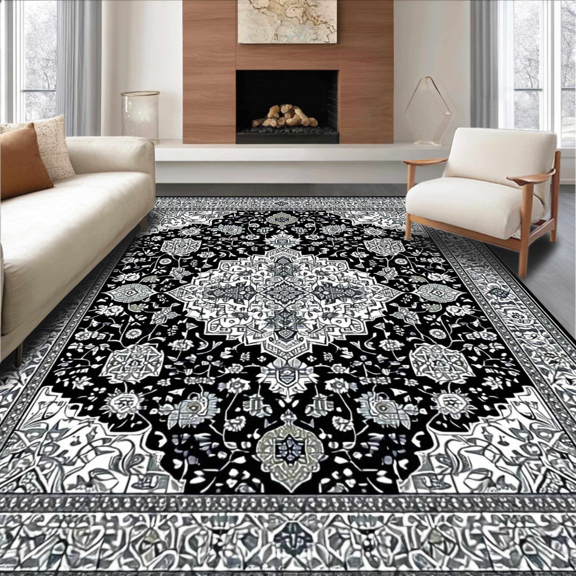 Ultra Soft Area Rug, Non Slip, Stain Resistant, Washable Area Rugs for Living Room, Bedroom, Classic Monochrome Medallion Style(Black) Overview: