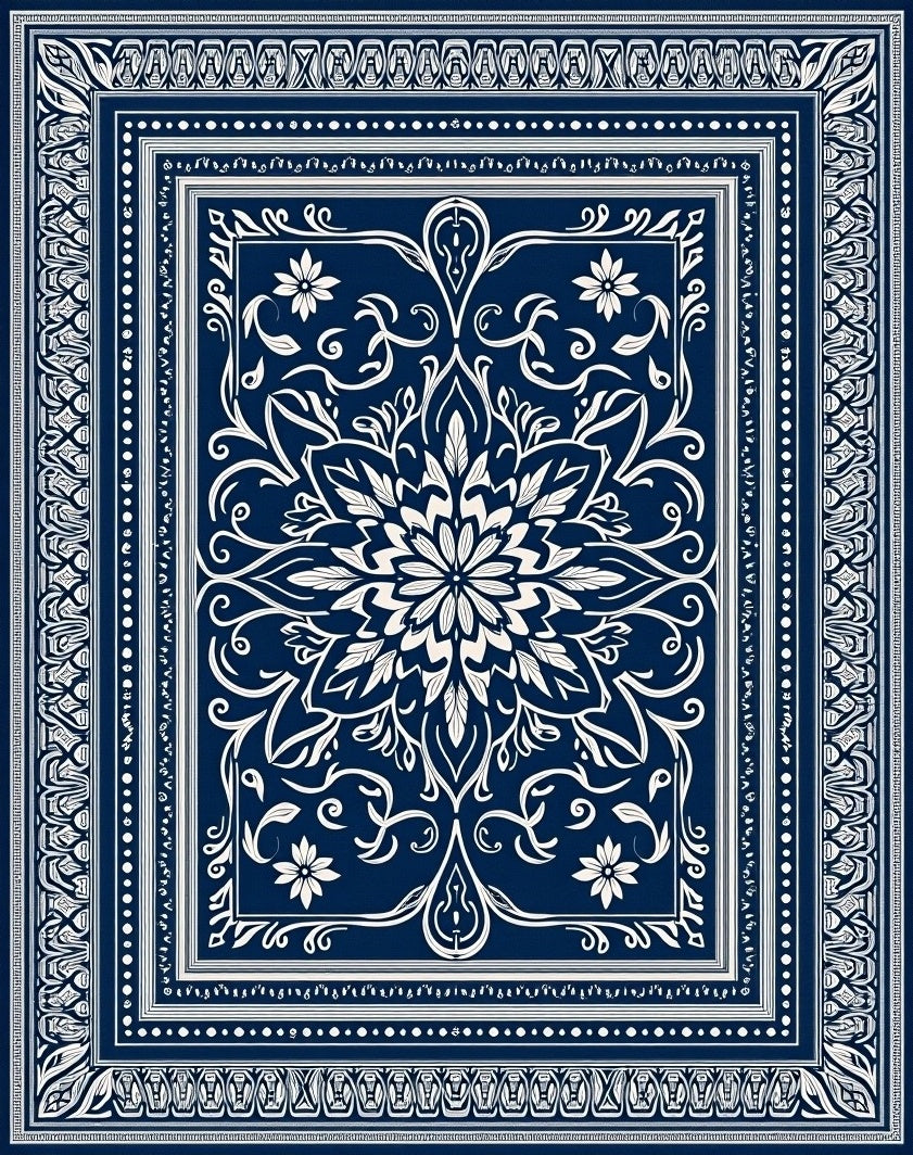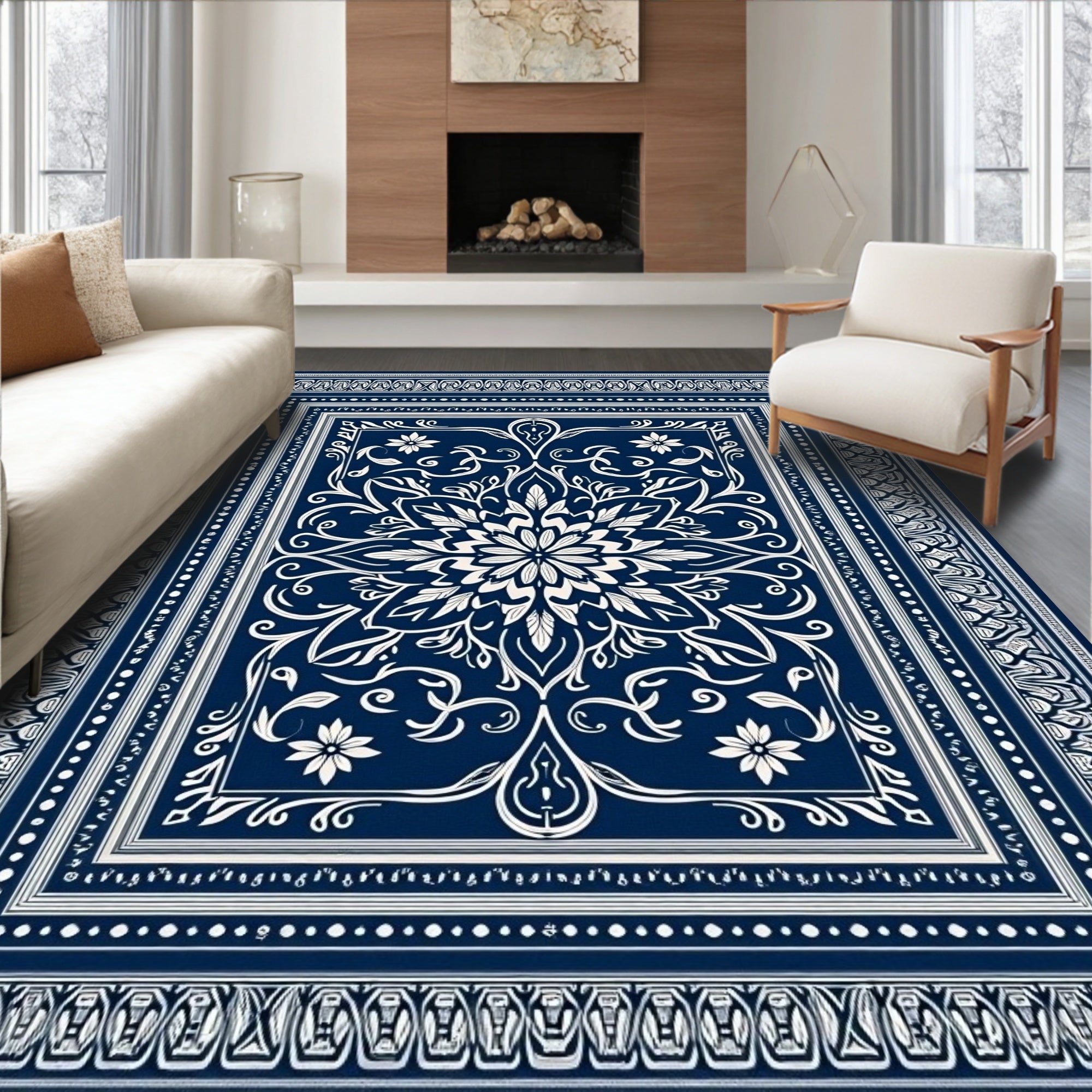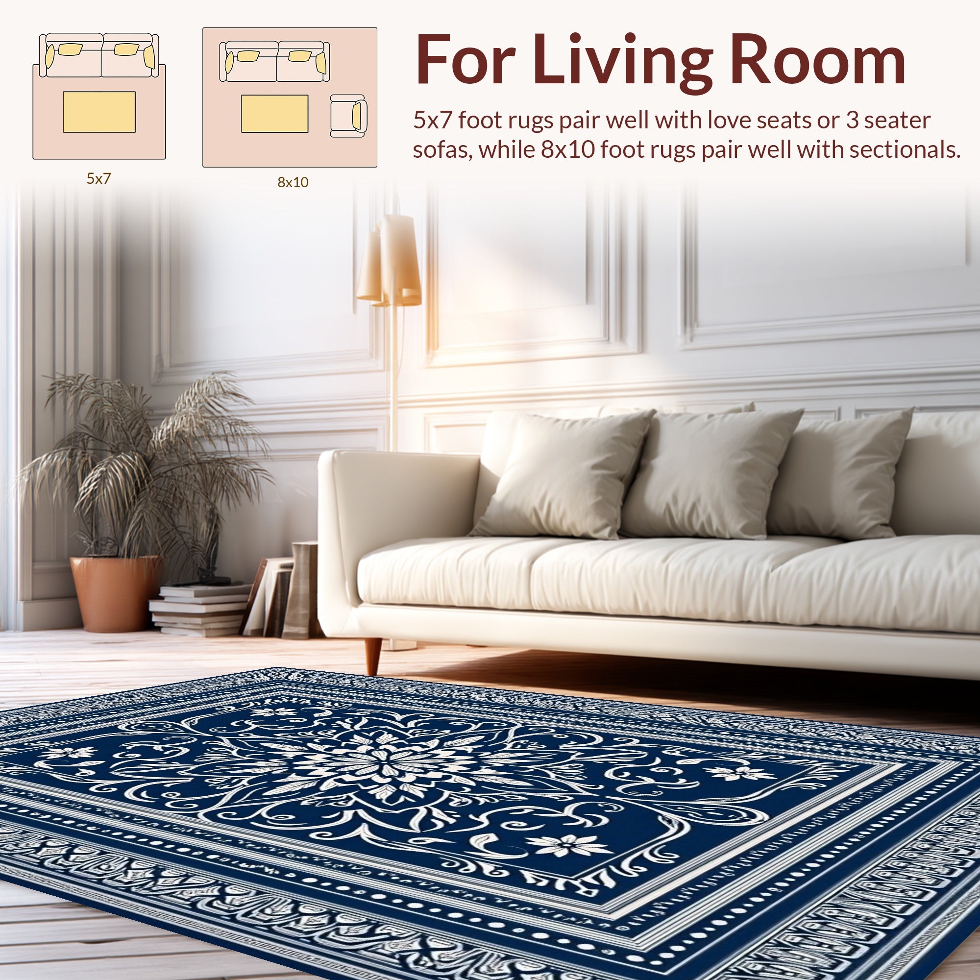 Ultra Soft Area Rug, Non Slip, Stain Resistant, Washable Area Rugs for Living Room, Bedroom, Classic Oriental Floral Motif with Intricate Vine Embroidery(Blue) Overview: