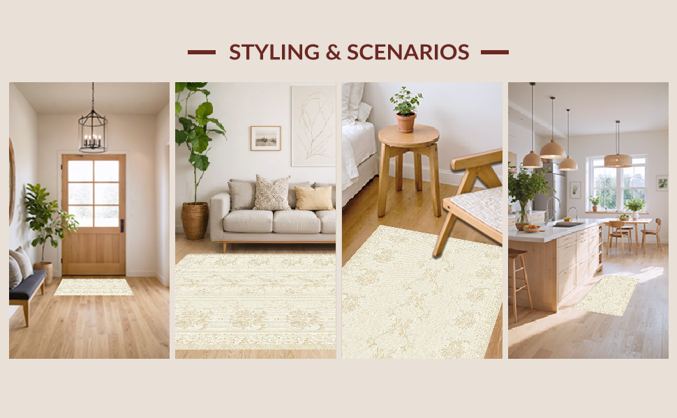 Ultra Soft Area Rug, Non Slip, Stain Resistant, Washable Area Rugs for Living Room, Bedroom, Classic Scrollwork in Warm Neutrals(Beige) Overview:
