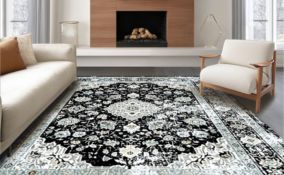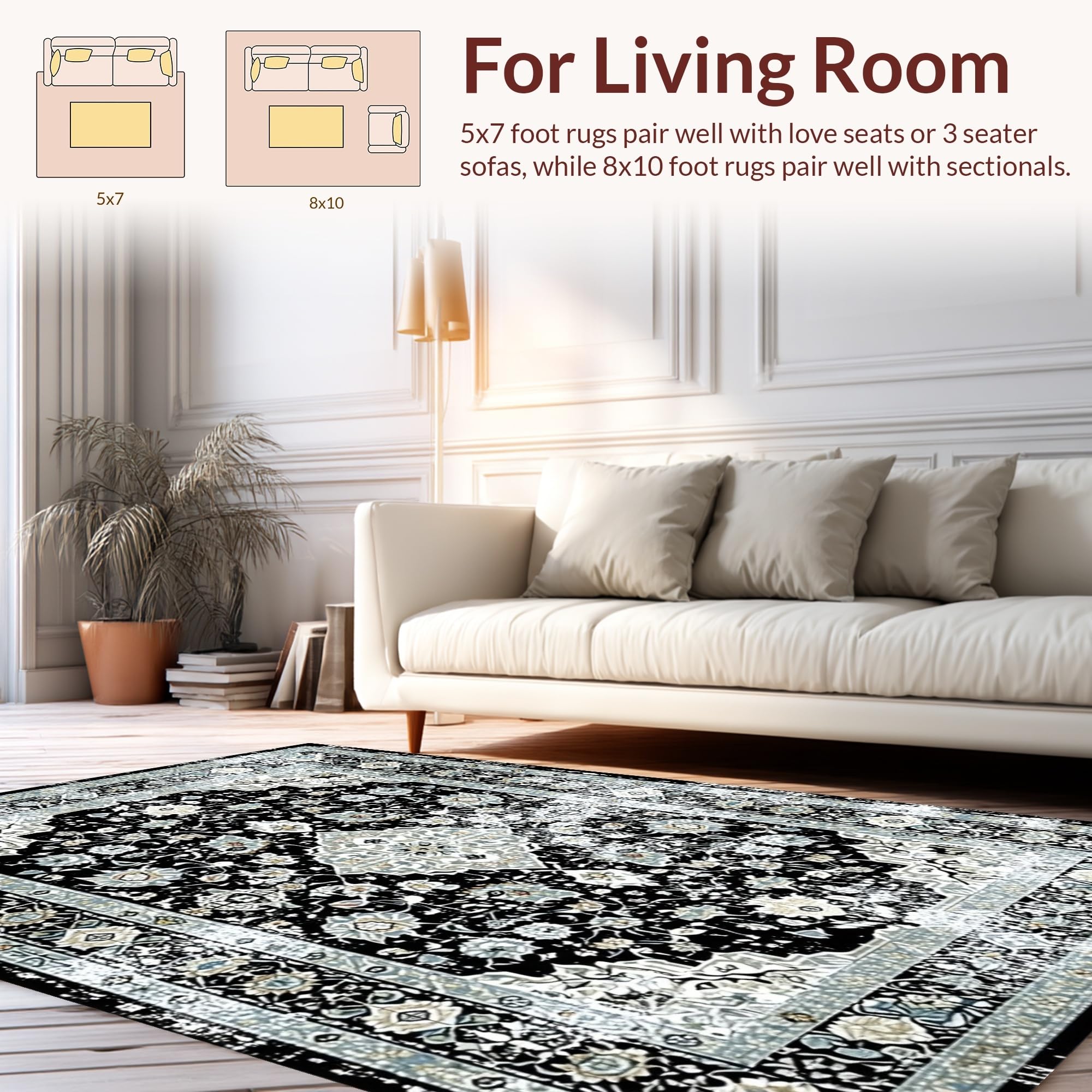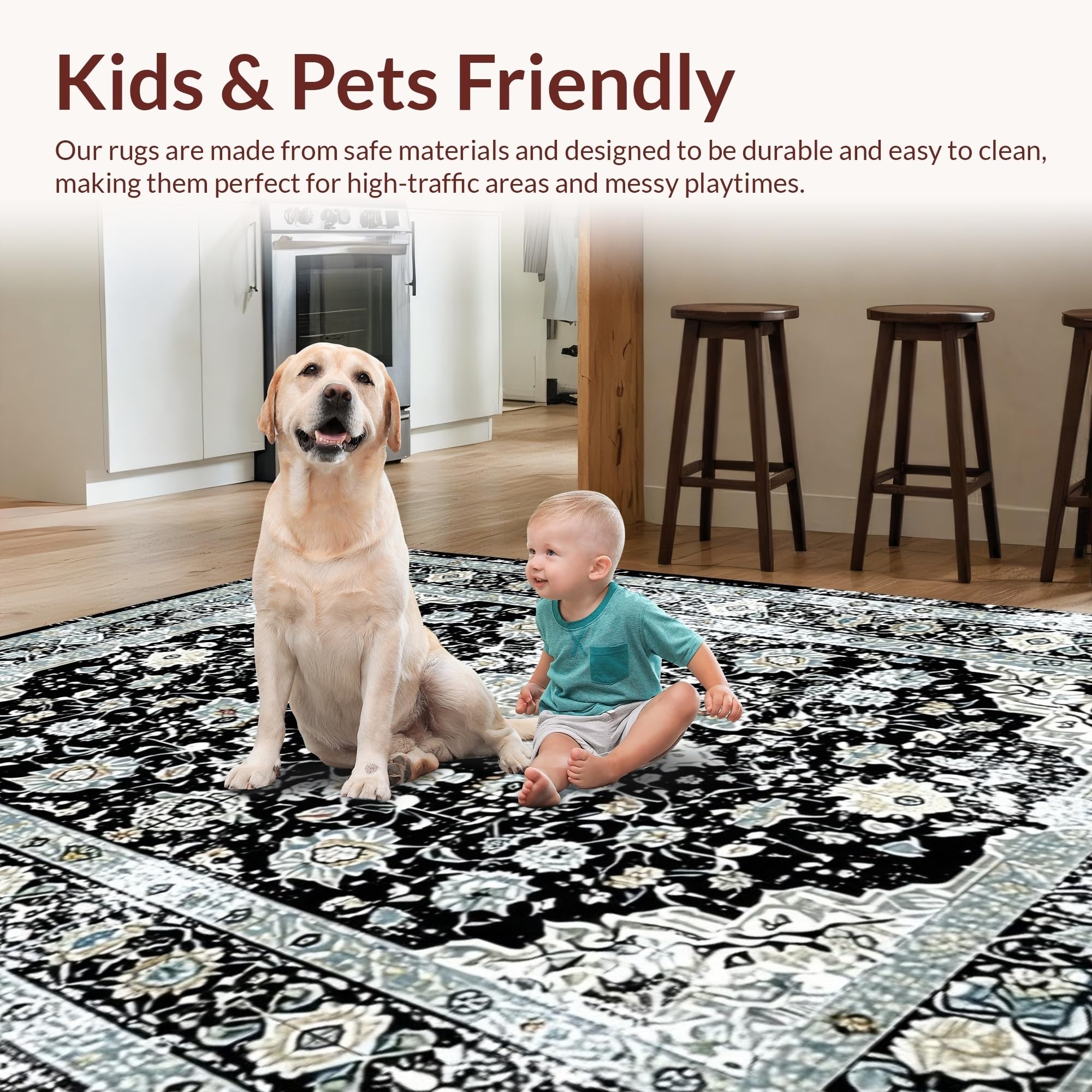 Ultra Soft Area Rug, Non Slip, Stain Resistant, Washable Area Rugs for Living Room, Bedroom, Classic Trellis Design with Grey Accents(Black) Overview: