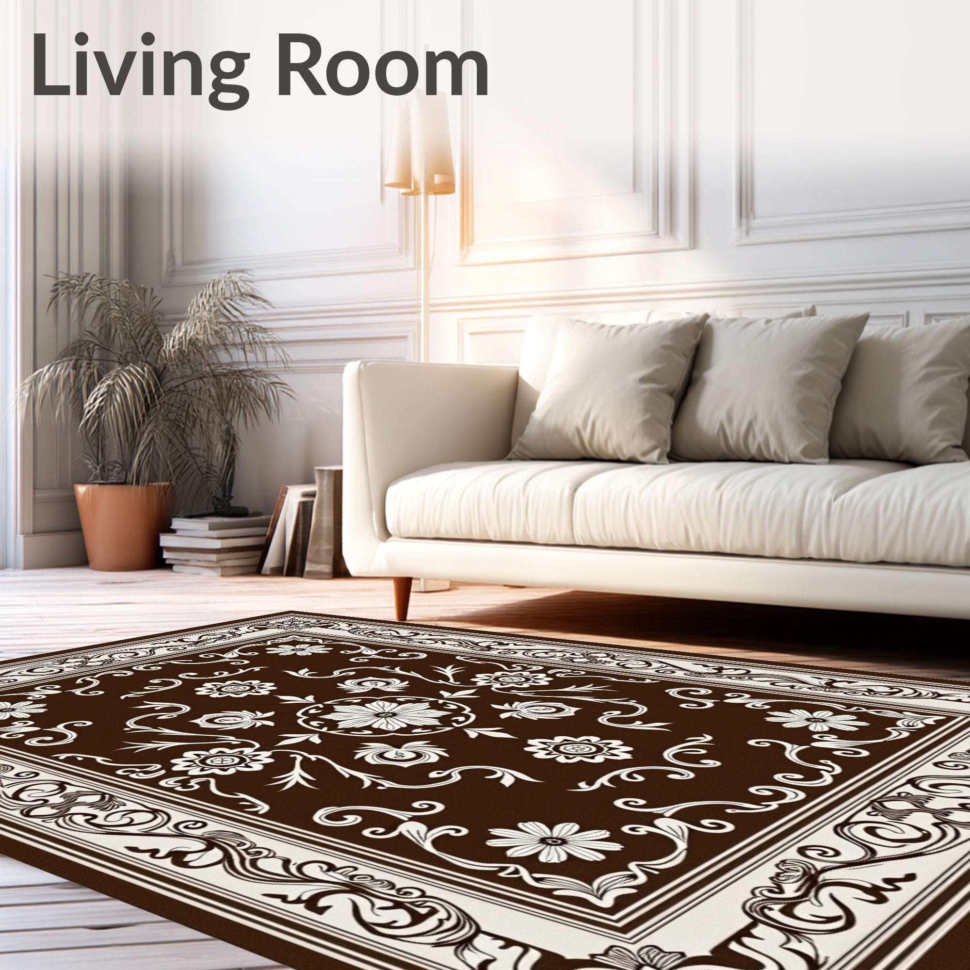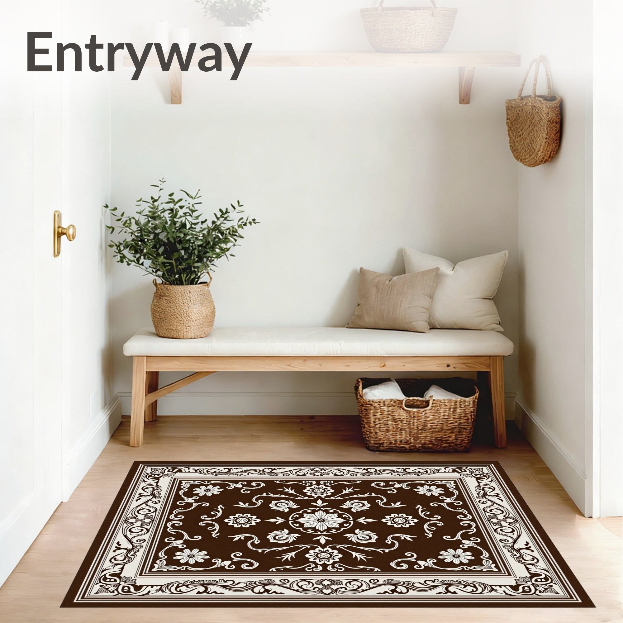 Flatwoven High Traffic Area Rug, Classic Vinework Scroll with Ornamental Medallion Accents, Non Slip, Stain Resistant, Washable Area Rugs for Living Room, Bedroom (Brown) Overview: