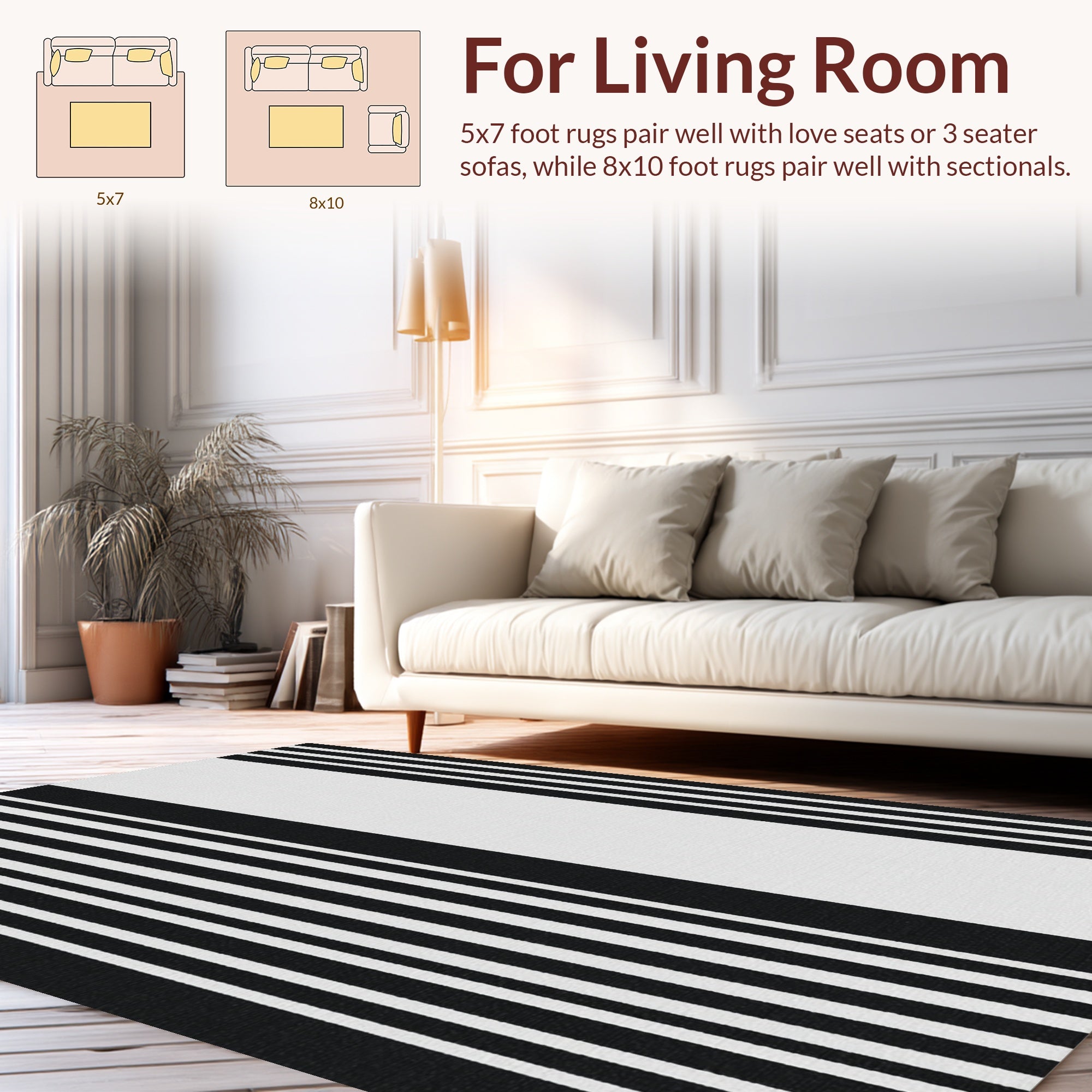 Ultra Soft Area Rug, Non Slip, Stain Resistant, Washable Area Rugs for Living Room, Bedroom, Coastal Cabana Dual Tone Horizontal Lined All Weather Durable Mat(Black) Overview: