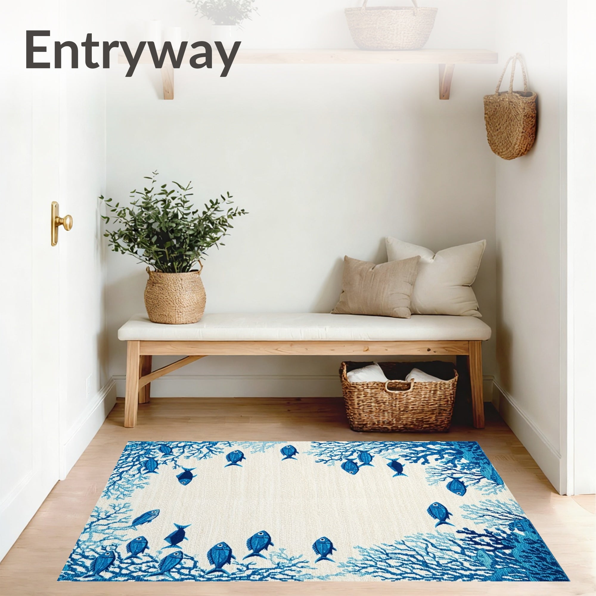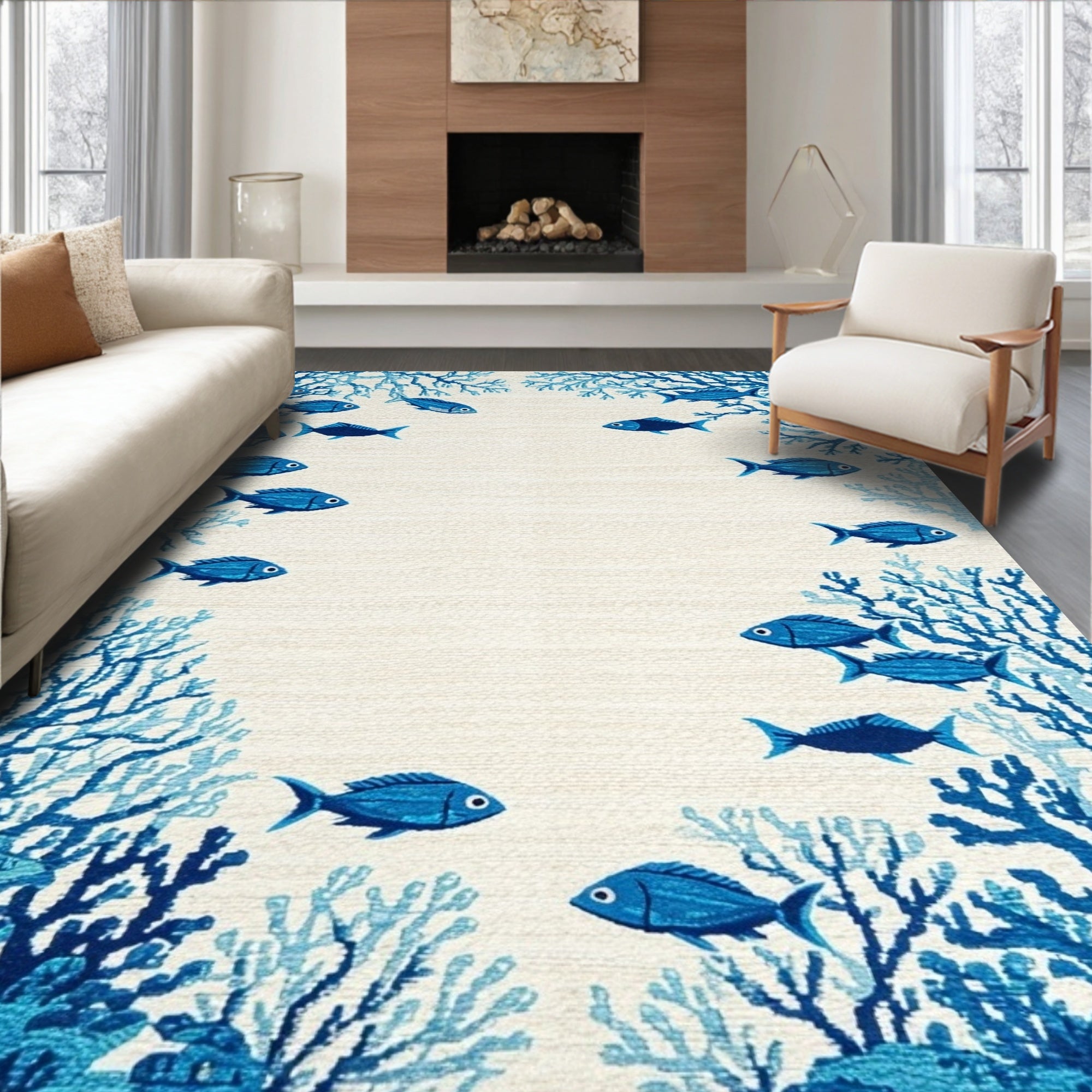 Ultra Soft Area Rug, Non Slip, Stain Resistant, Washable Area Rugs for Living Room, Bedroom, Coastal Reef Inspired Area Bright Colors Fish Beige(Blue) Overview: