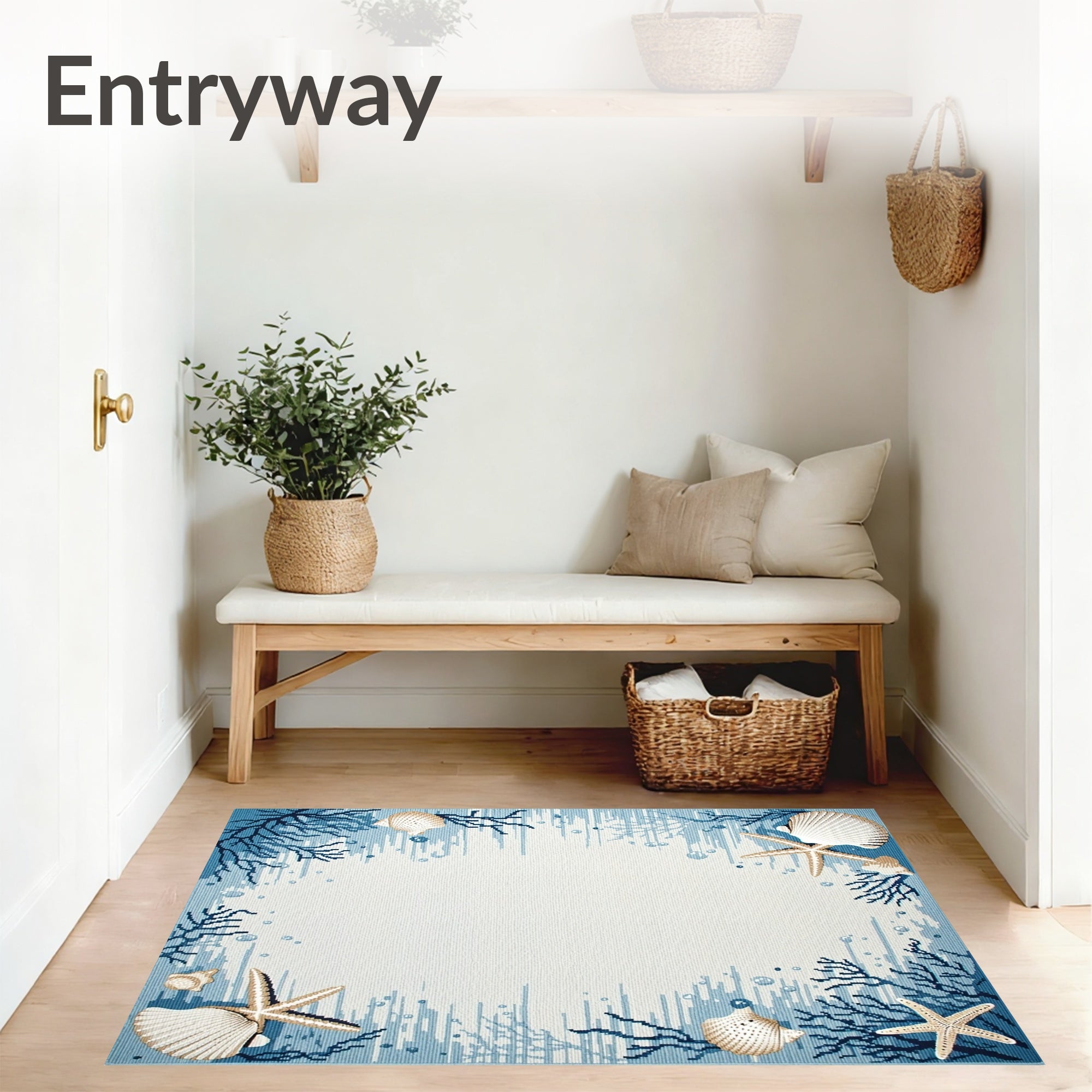 Ultra Soft Area Rug, Non Slip, Stain Resistant, Washable Area Rugs for Living Room, Bedroom, Coastal Serenity Area Blue Grey Seashells and Starfish(Blue) Overview: