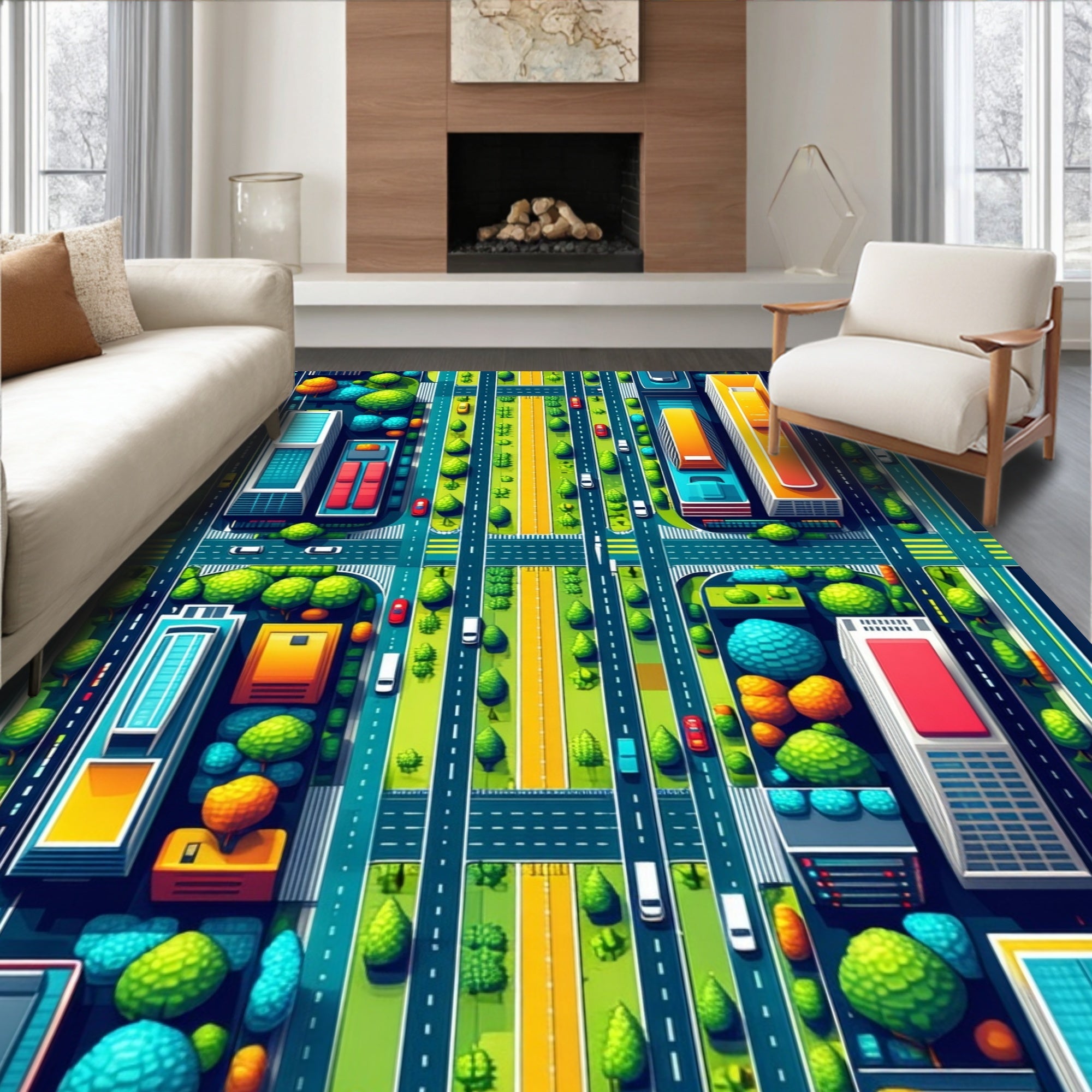 Flatwoven High Traffic Area Rug, Colorful City Traffic Playroom Educational, Non Slip, Stain Resistant, Washable Area Rugs for Living Room, Bedroom (Blue) Overview: