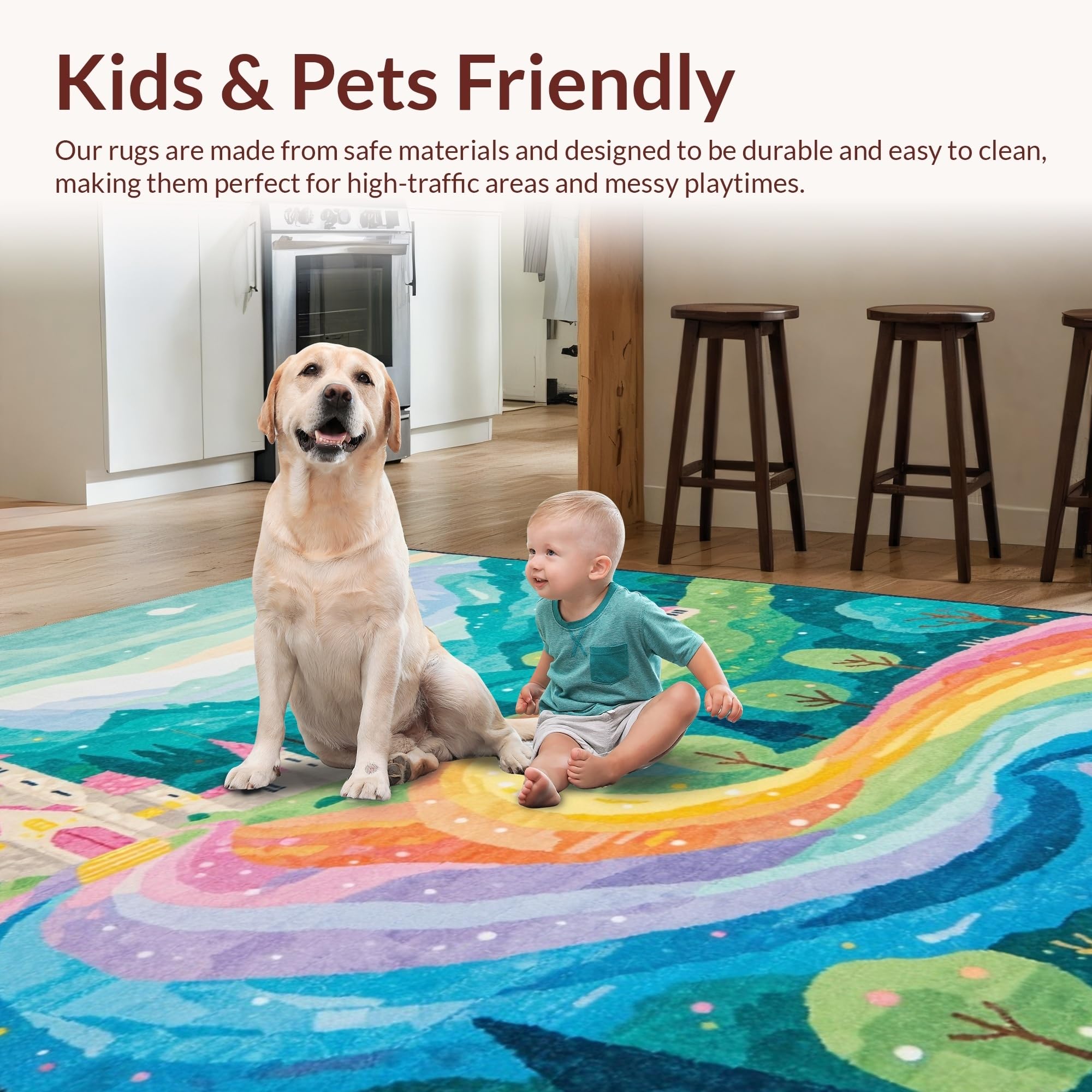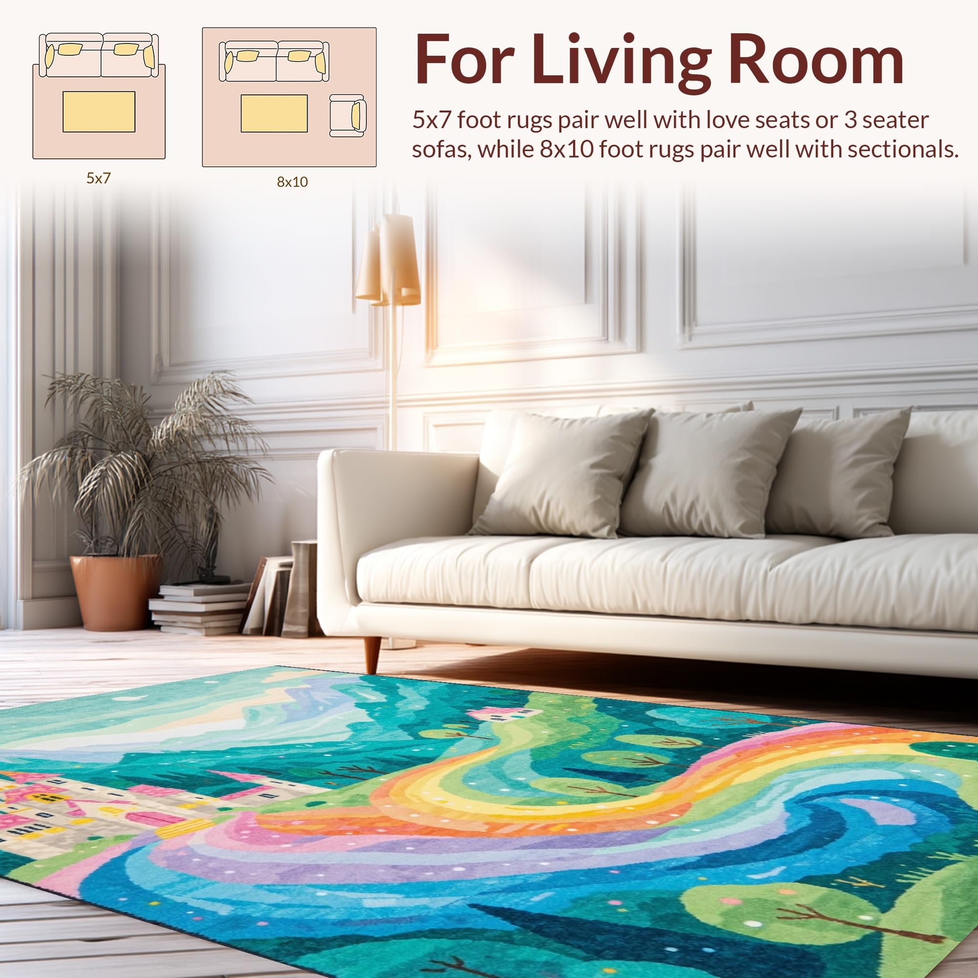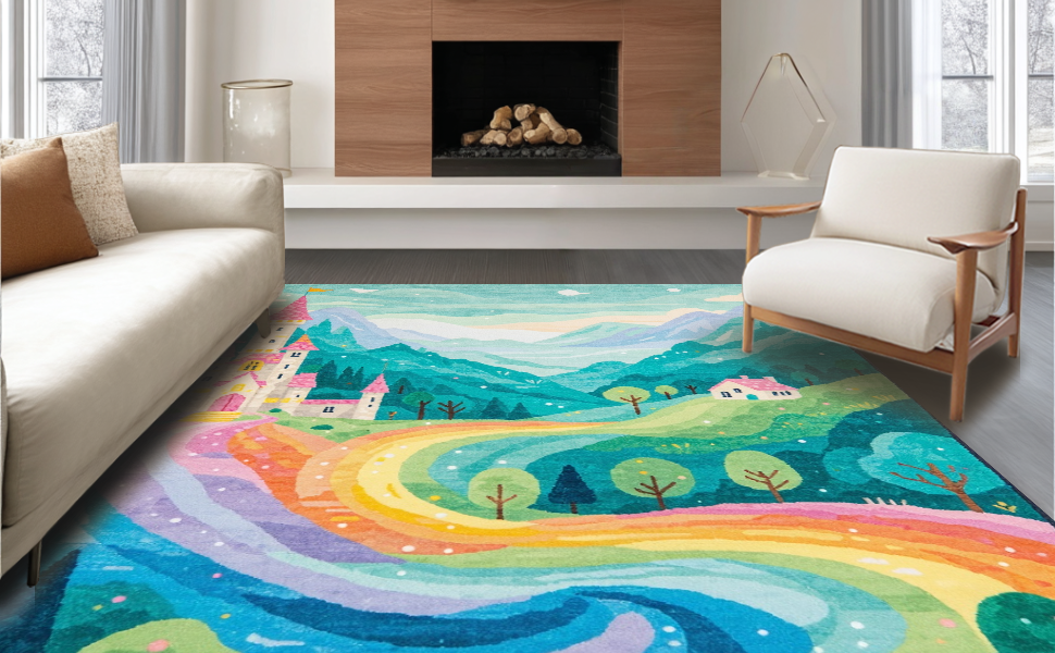 Ultra Soft Area Rug, Non Slip, Stain Resistant, Washable Area Rugs for Living Room, Bedroom, Colorful Rainbow Dreamscape Design(Blue) Overview: