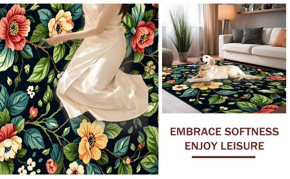 Ultra Soft Area Rug, Non Slip, Stain Resistant, Washable Area Rugs for Living Room, Bedroom, Contemporary Chic Floral Fusion(Black) Overview: