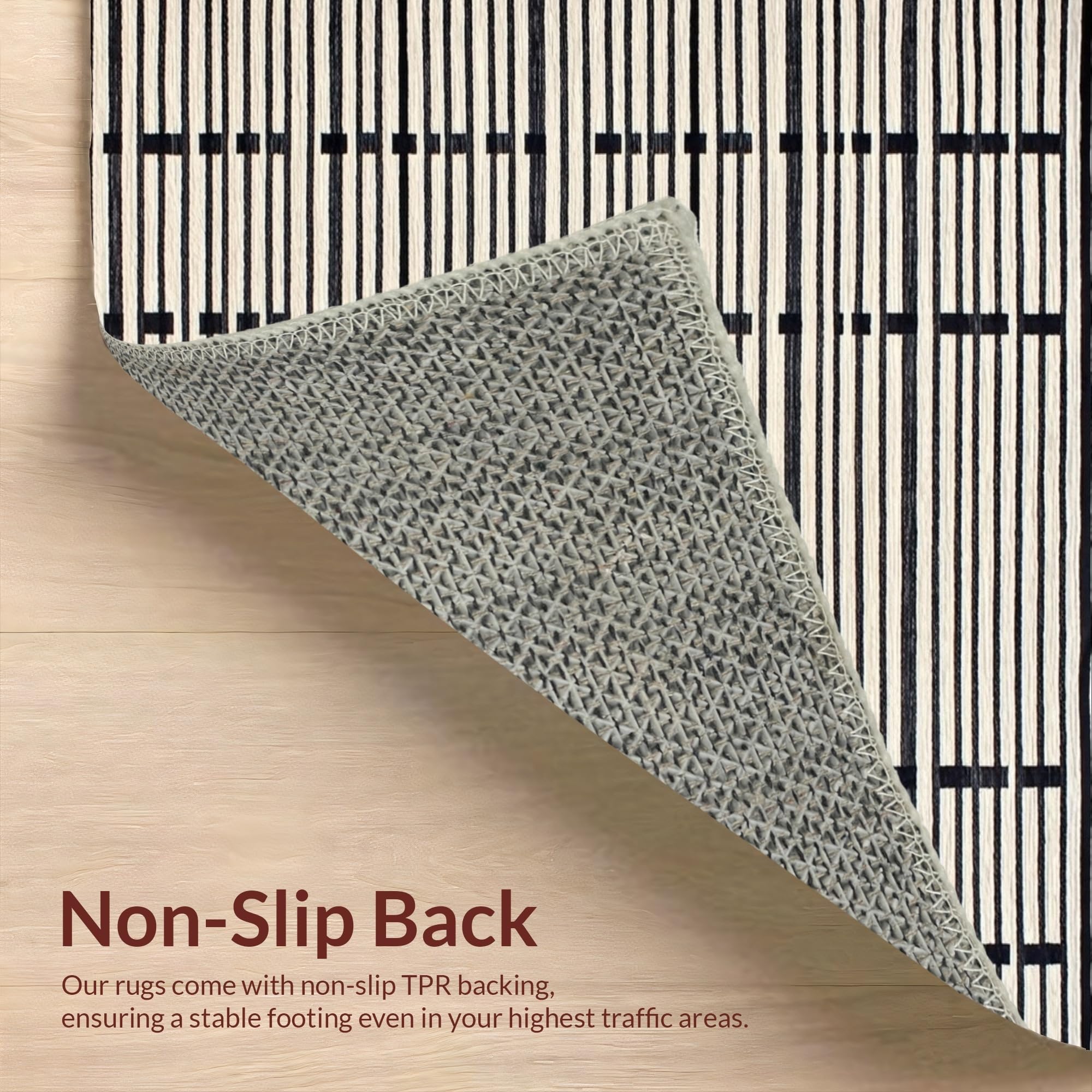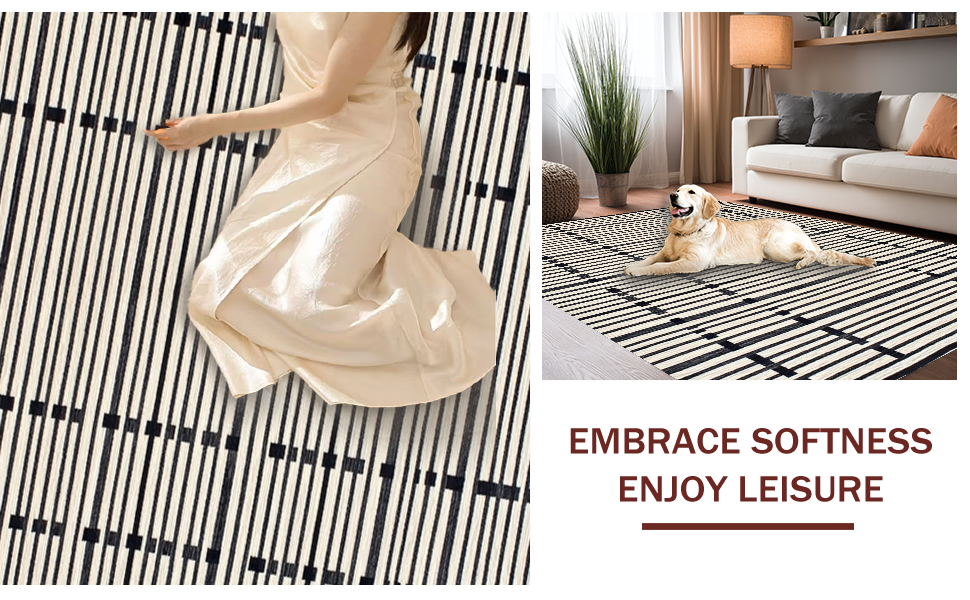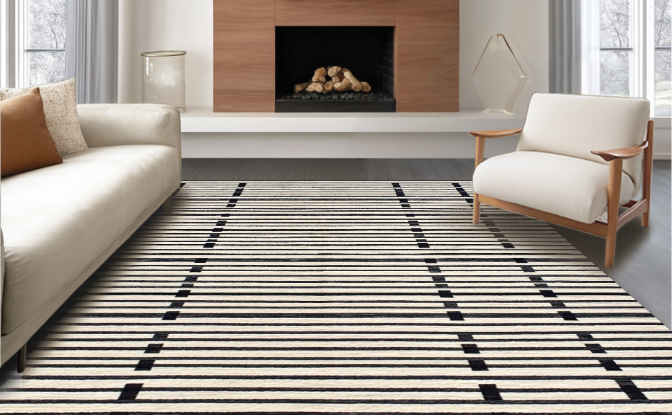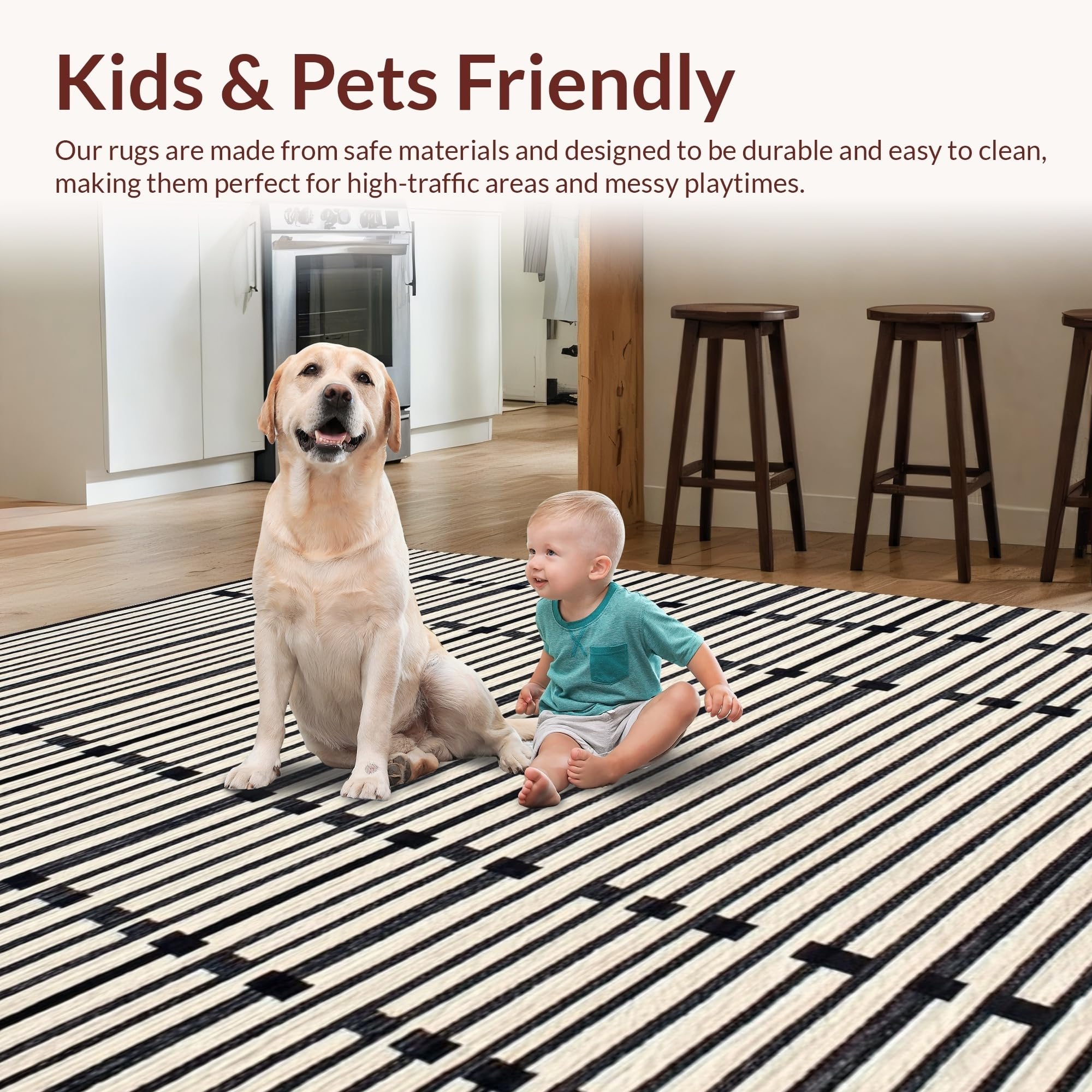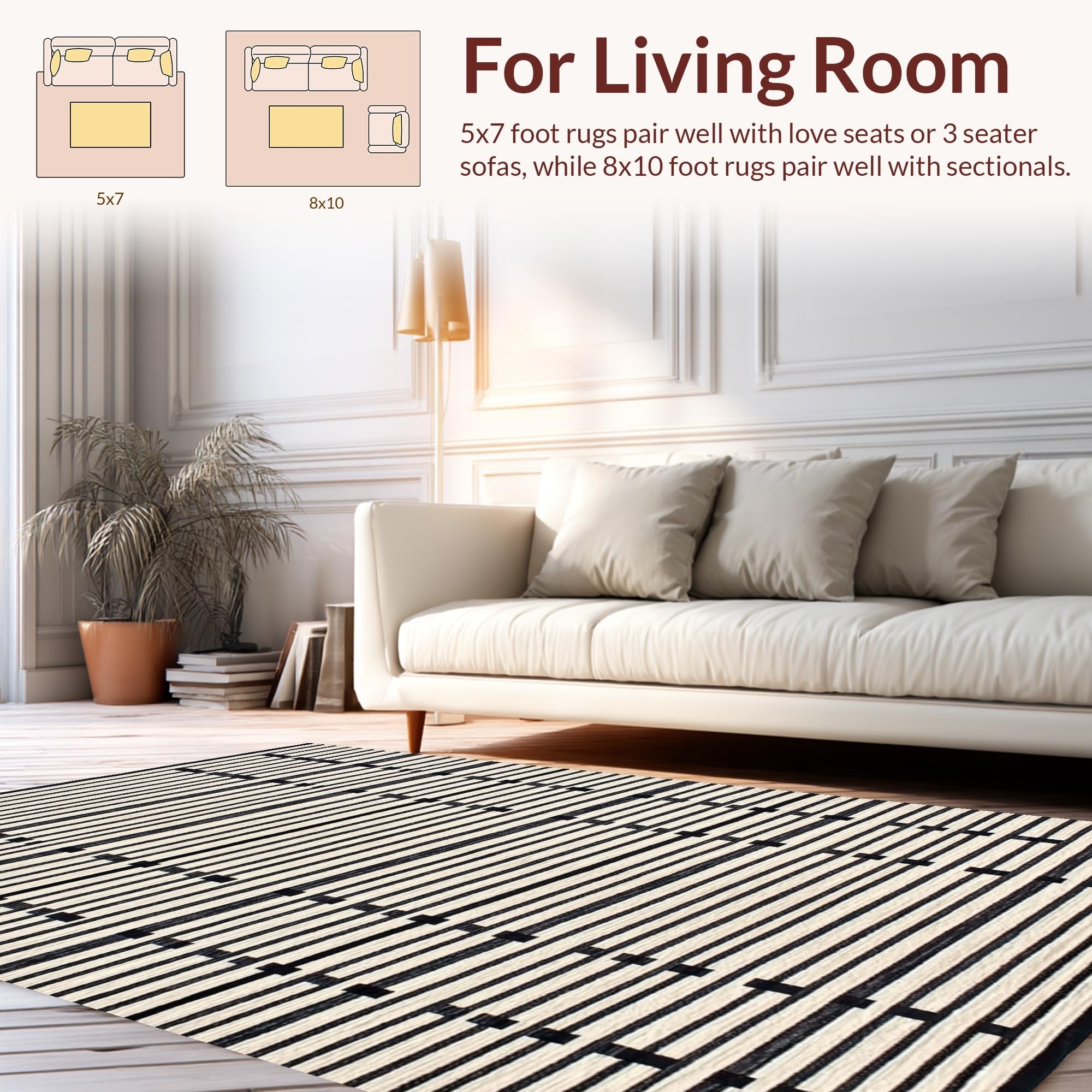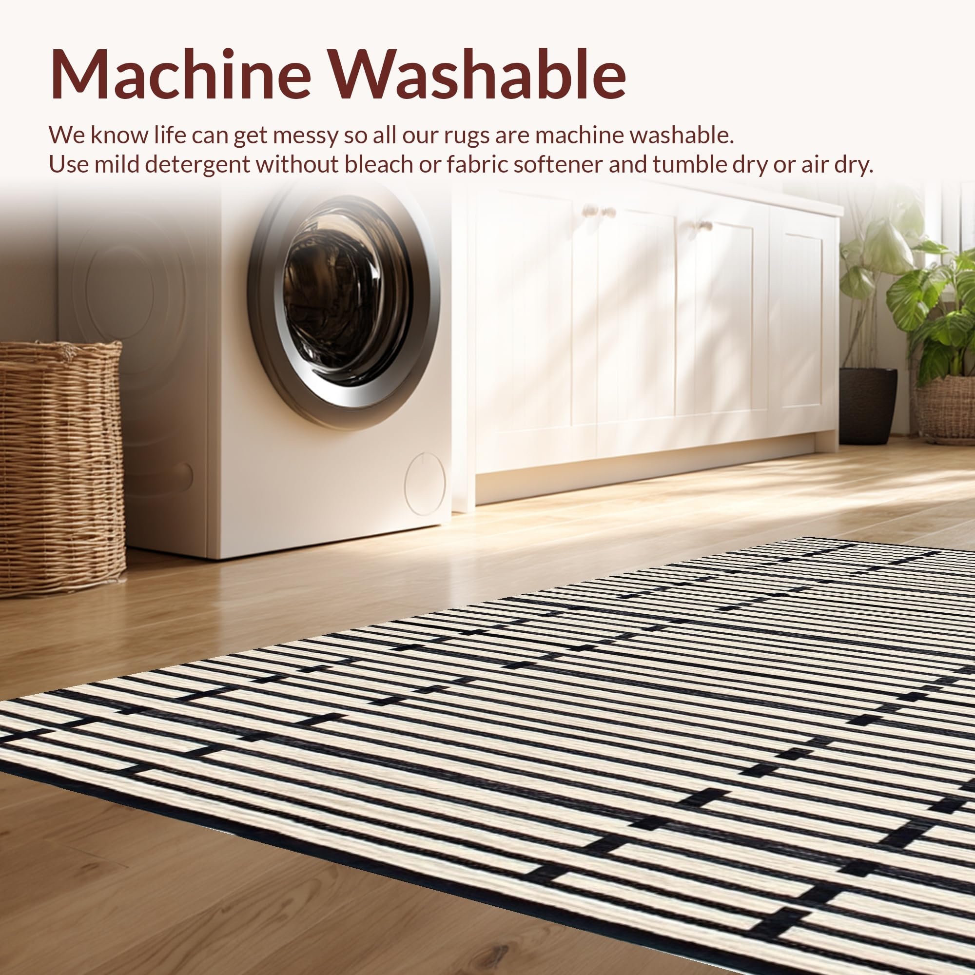 Ultra Soft Area Rug, Non Slip, Stain Resistant, Washable Area Rugs for Living Room, Bedroom, Contemporary Earthy Stripe Harmony(Black) Overview: