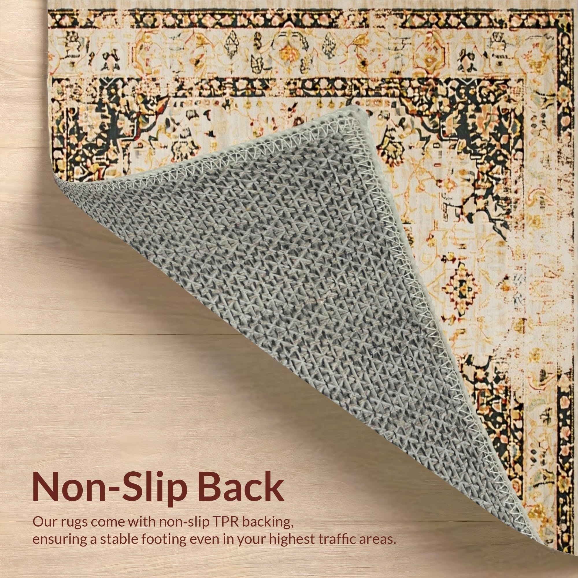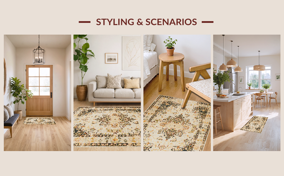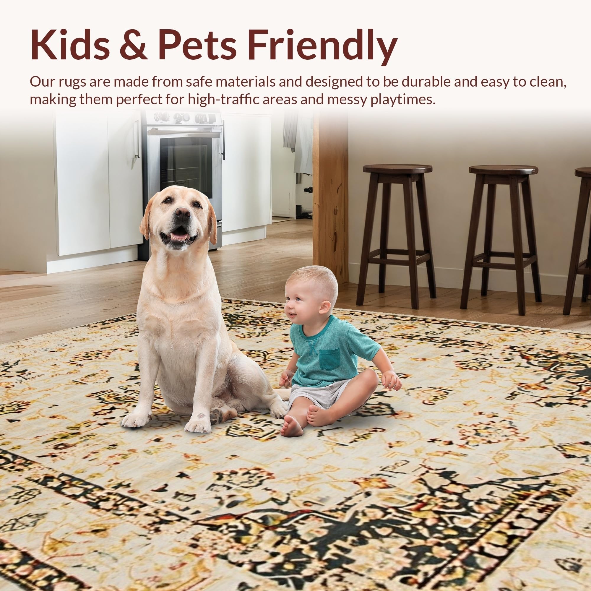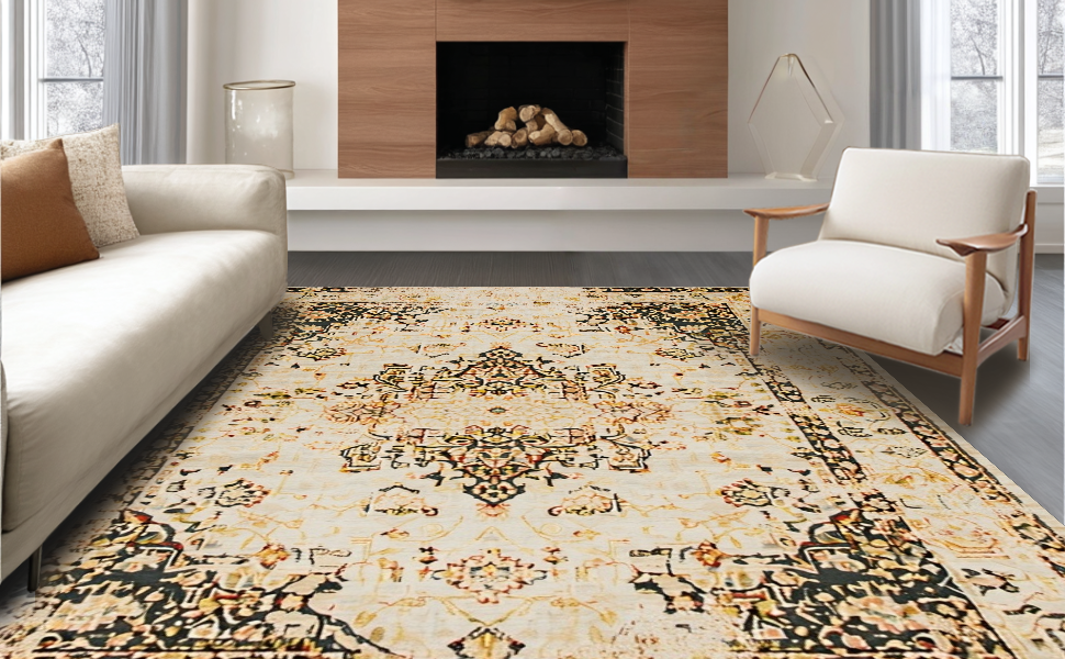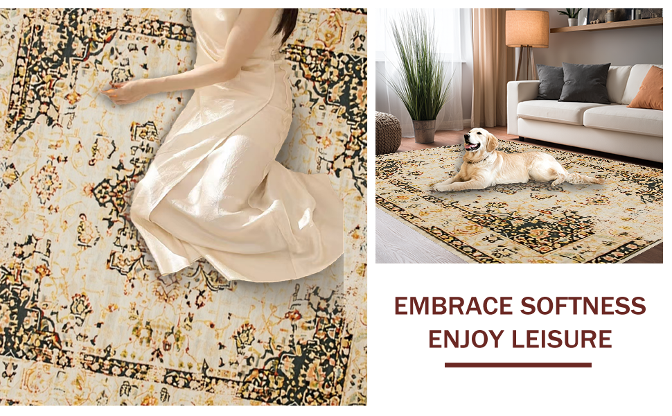 Ultra Soft Area Rug, Non Slip, Stain Resistant, Washable Area Rugs for Living Room, Bedroom, Contemporary Low-Pile Ogee Aesthetic(Beige) Overview: