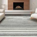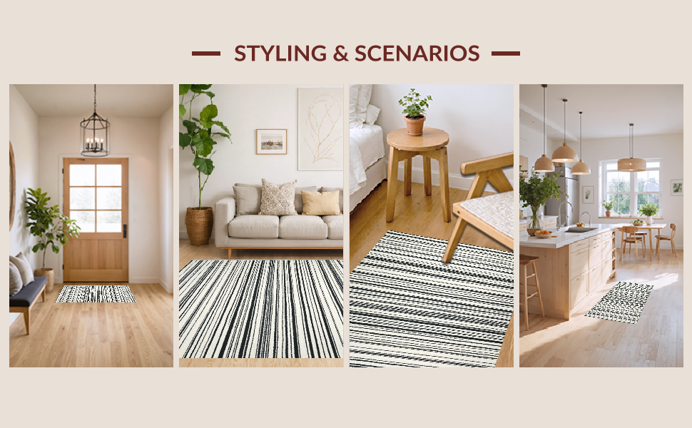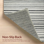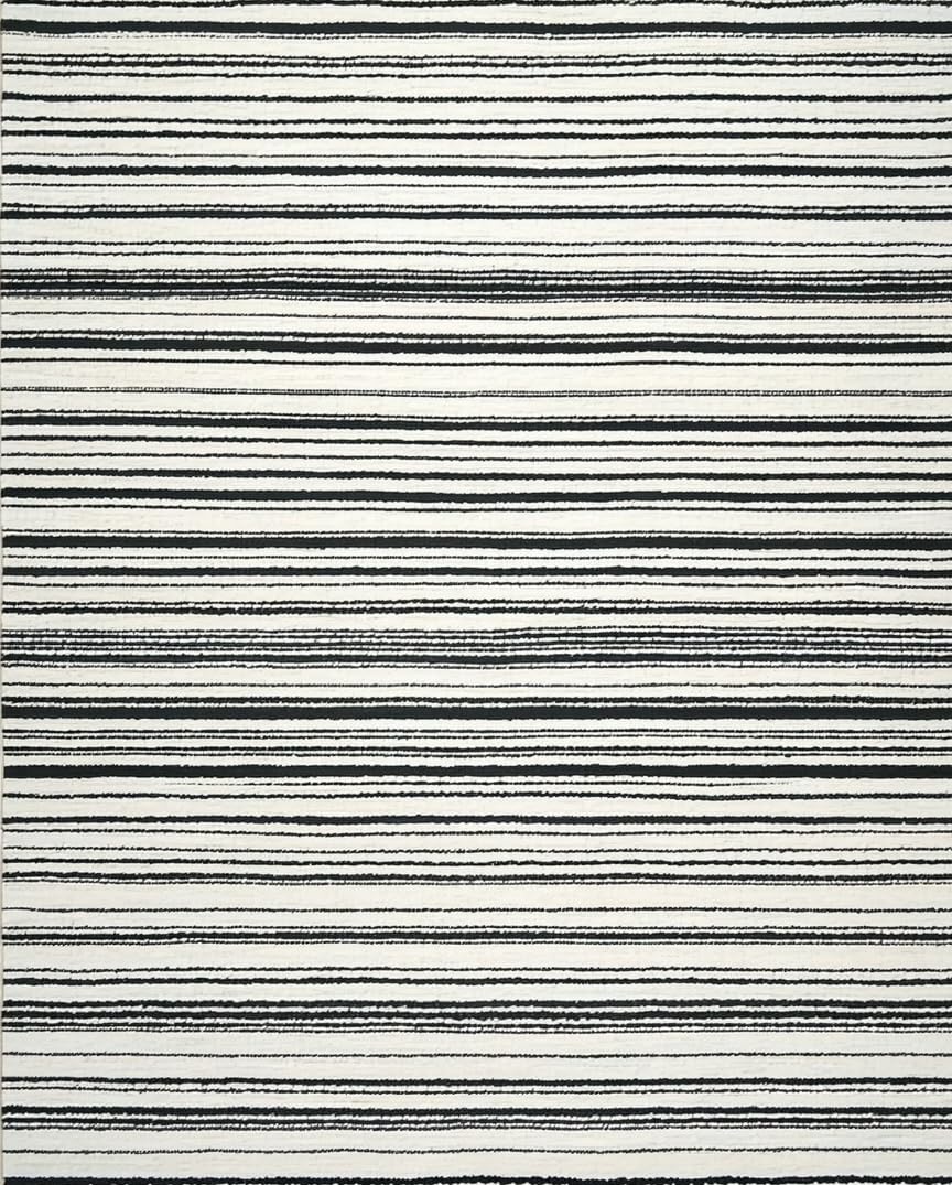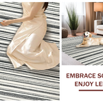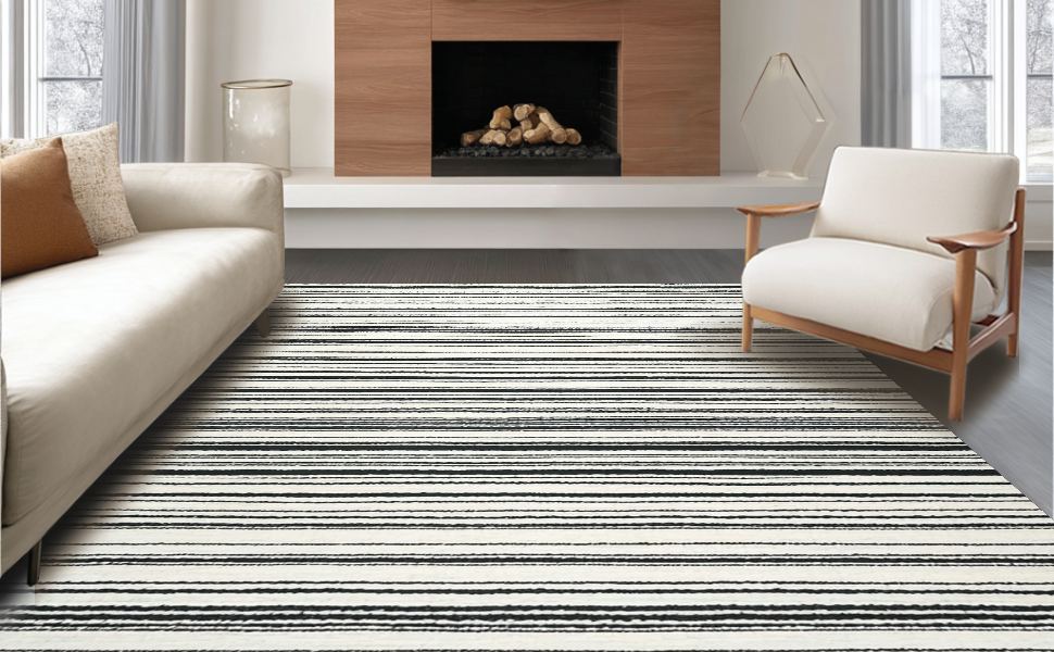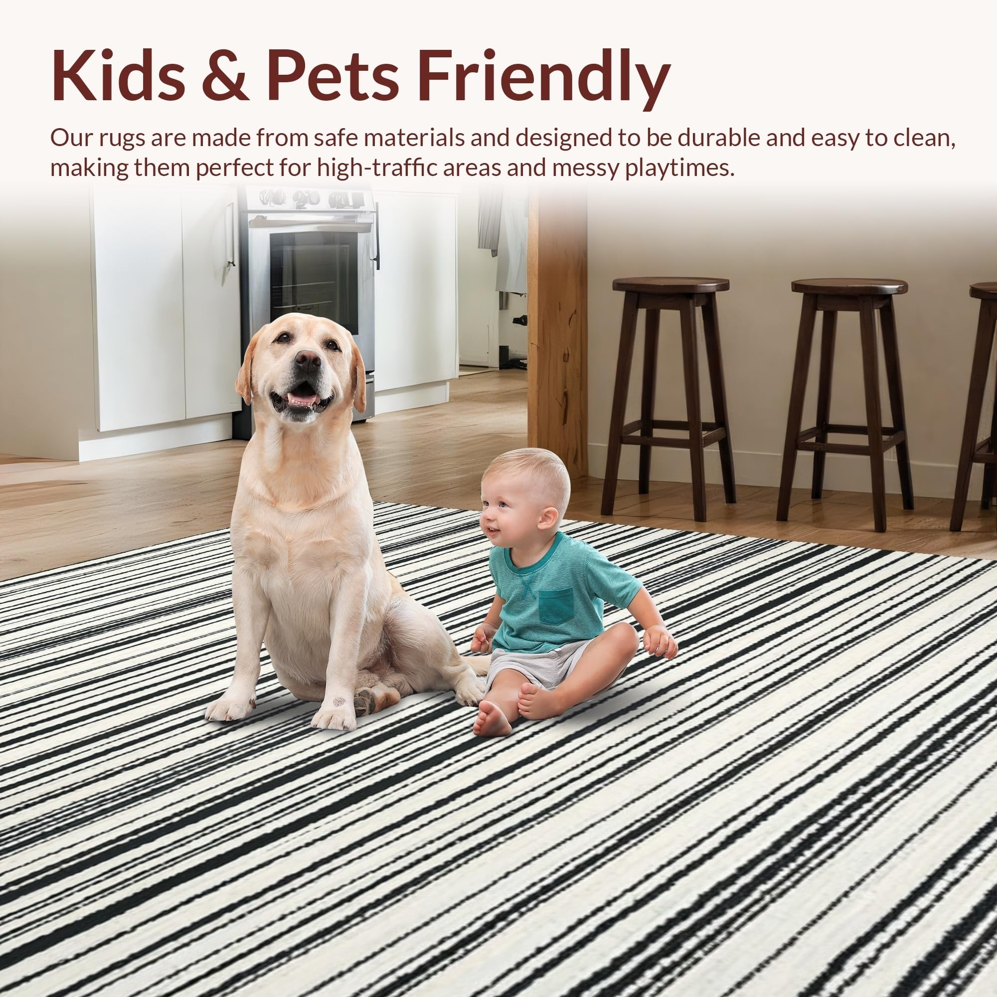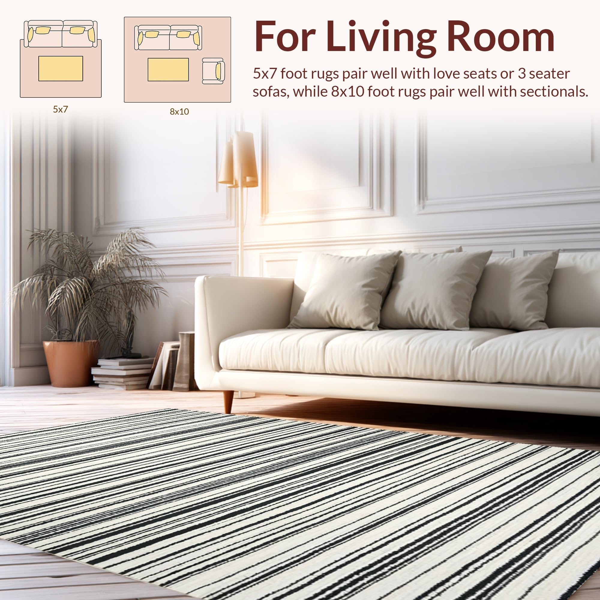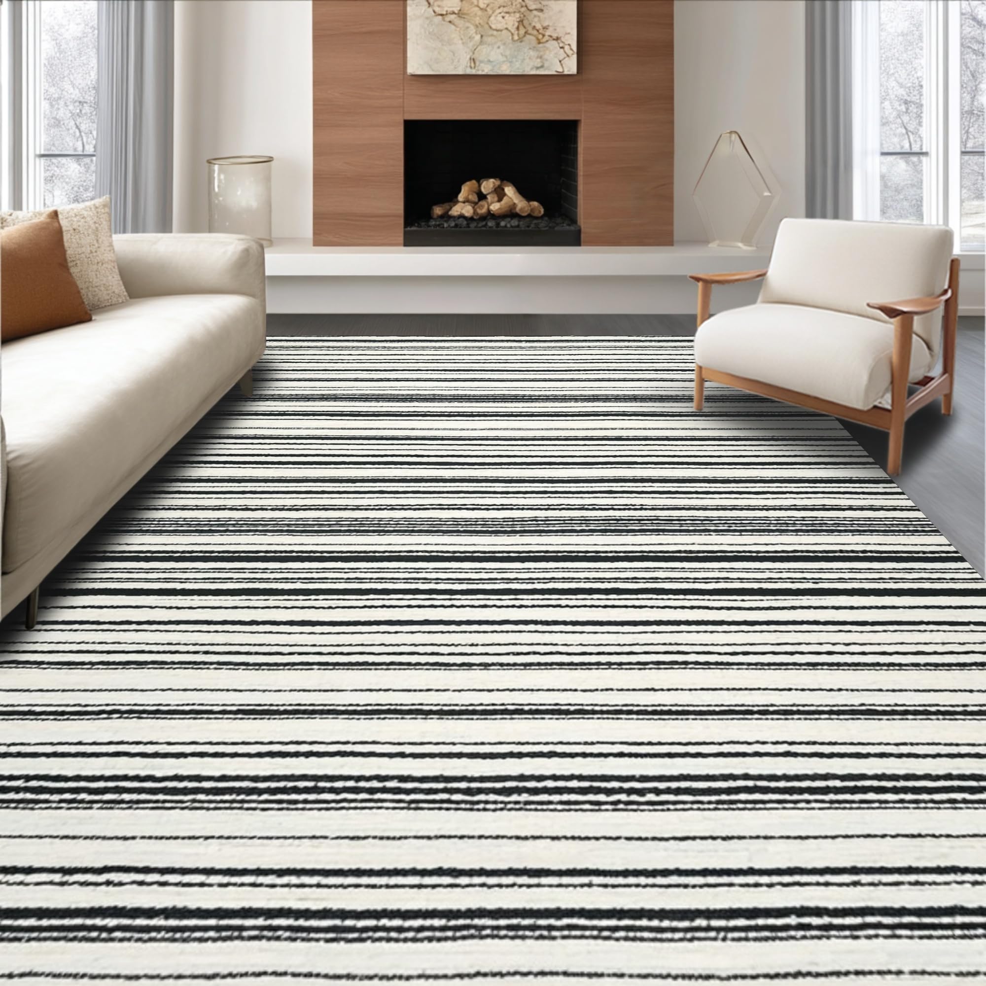 Ultra Soft Area Rug, Non Slip, Stain Resistant, Washable Area Rugs for Living Room, Bedroom, Contemporary Narrow and Wide Stripe Rug with Crisp Black White Banding(Beige) Overview: