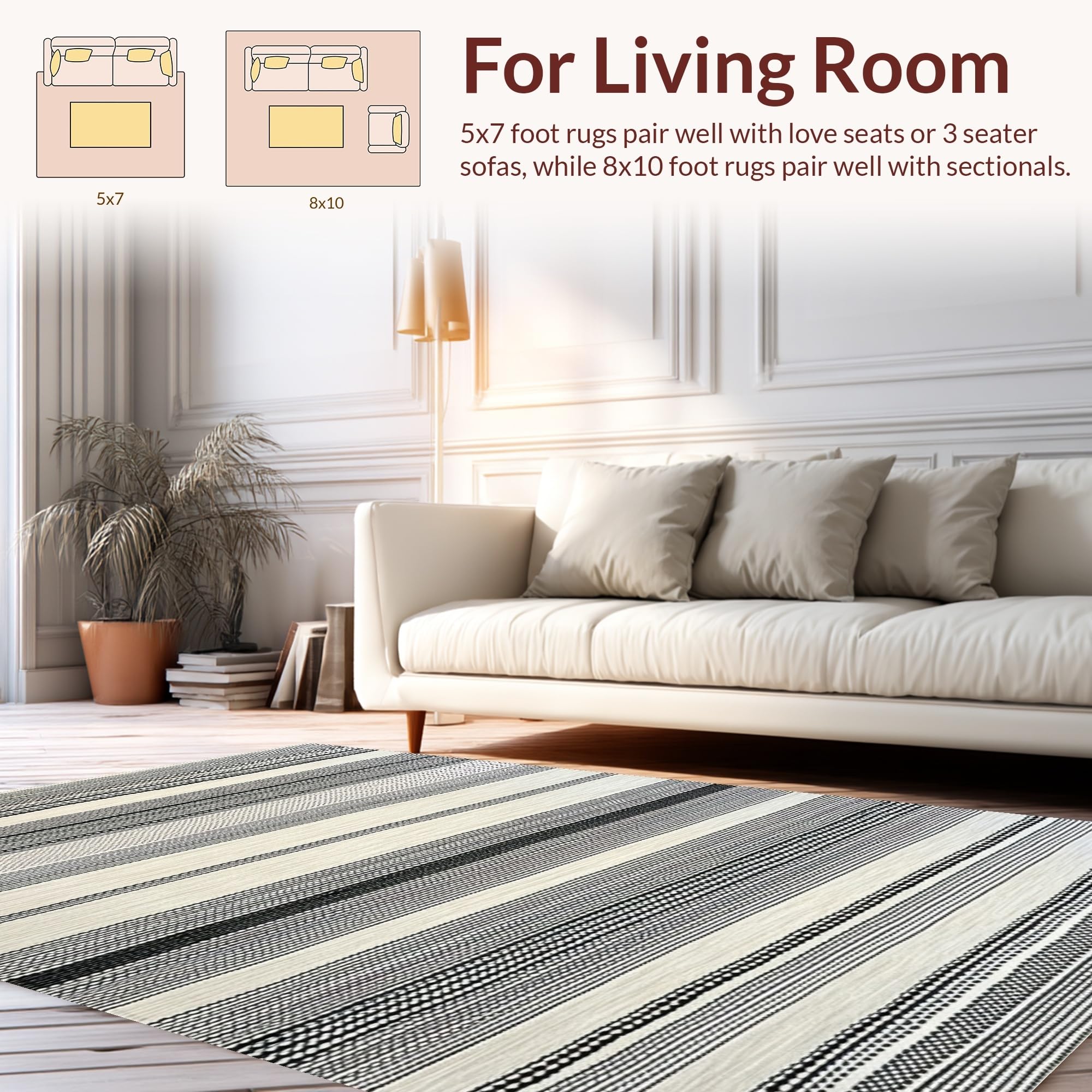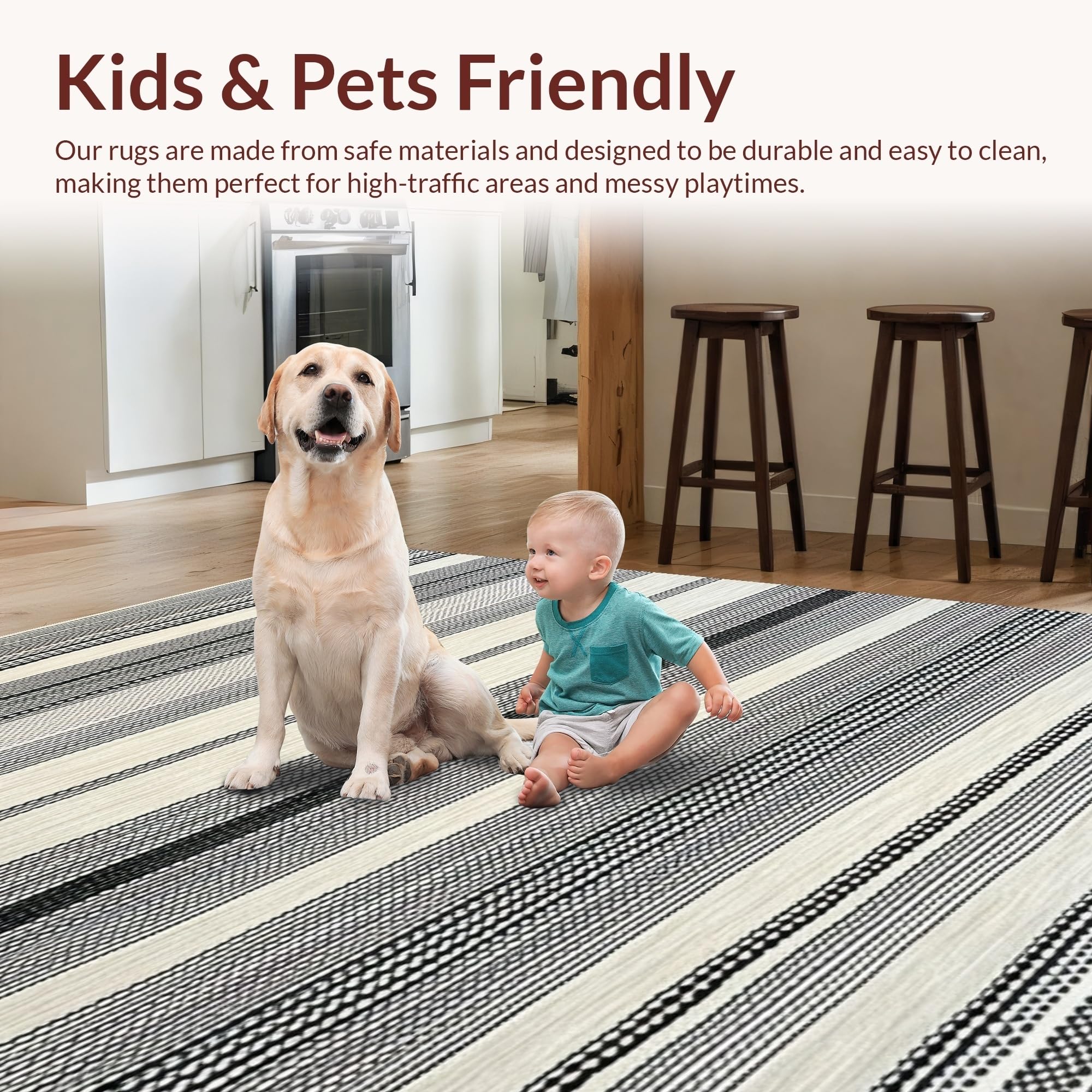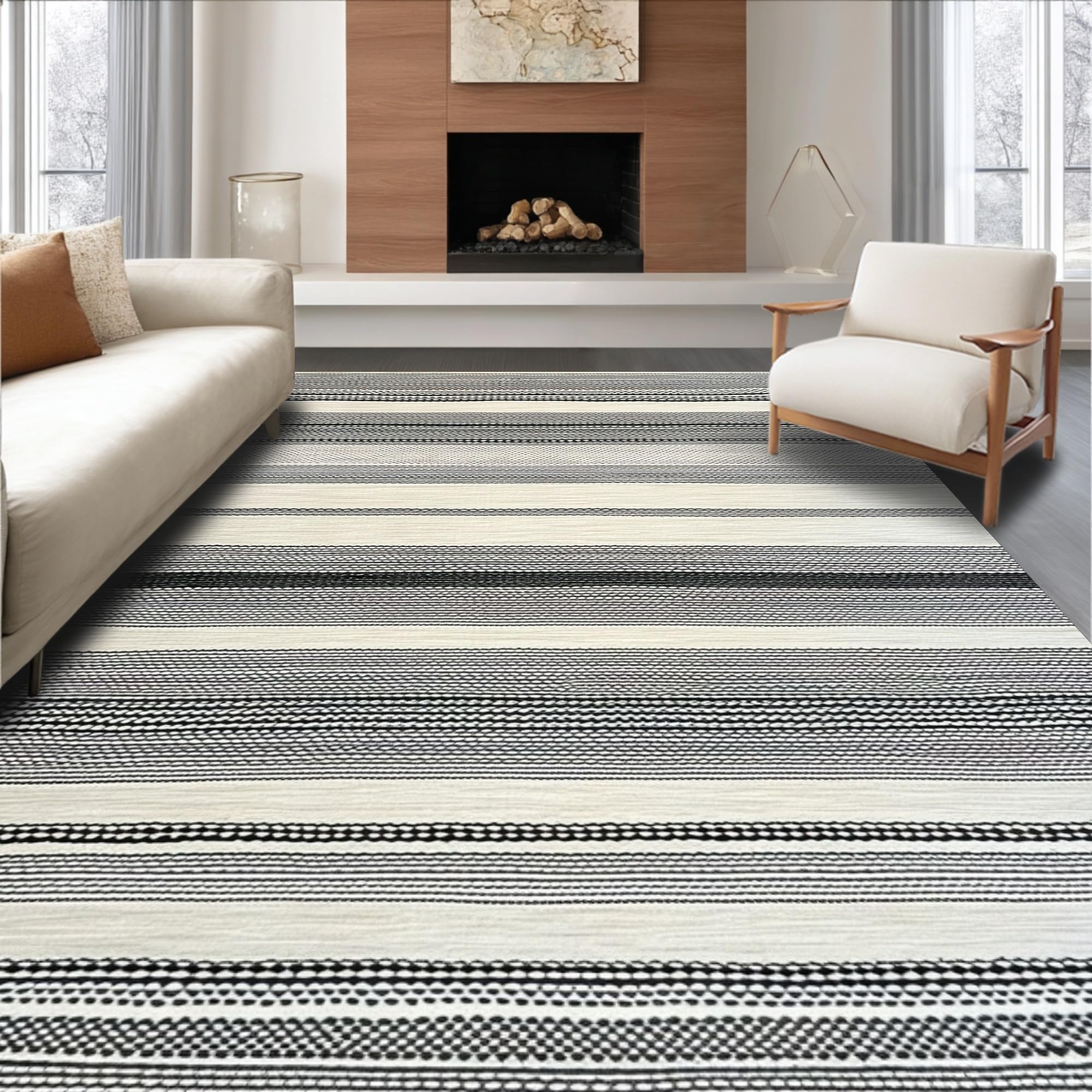 Ultra Soft Area Rug, Non Slip, Stain Resistant, Washable Area Rugs for Living Room, Bedroom, Contemporary Neutral Striped Elegance(Black) Overview: