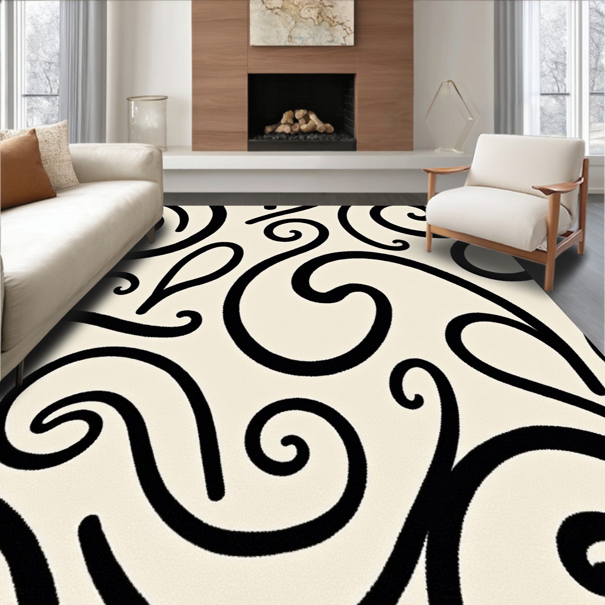 Ultra Soft Area Rug, Non Slip, Stain Resistant, Washable Area Rugs for Living Room, Bedroom, Contemporary Swirl Motif With Neutral Palette(Black) Overview: