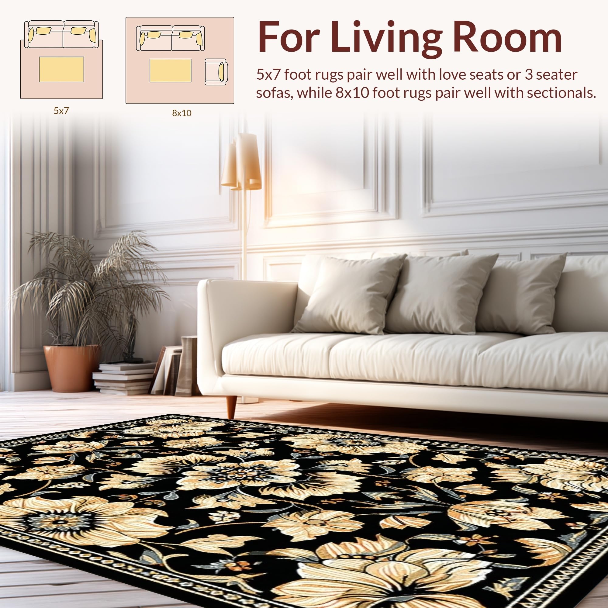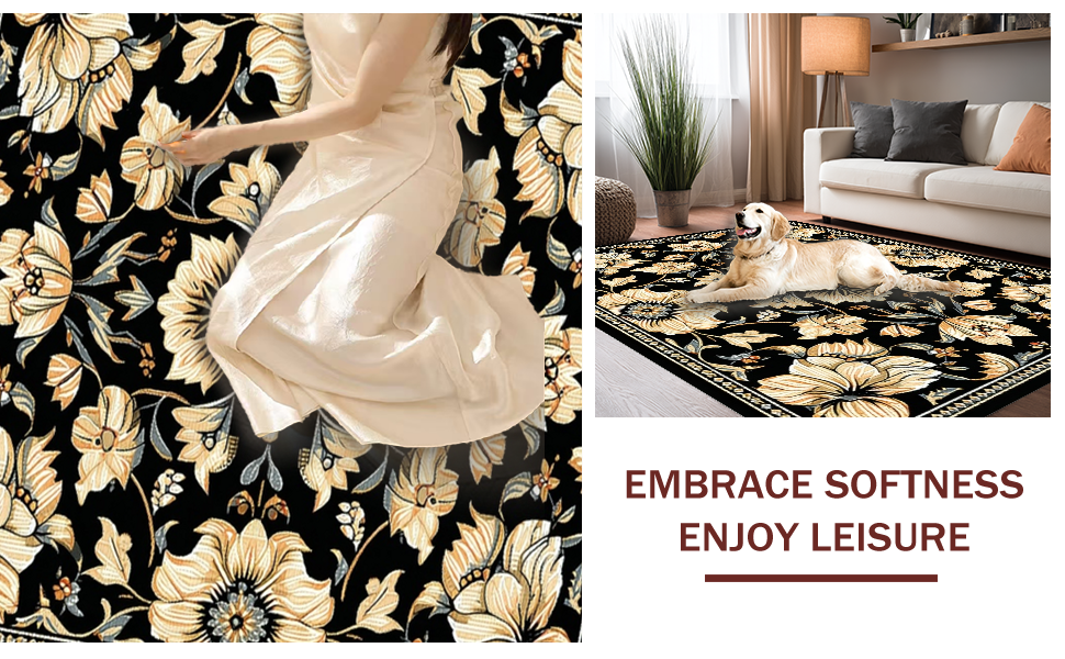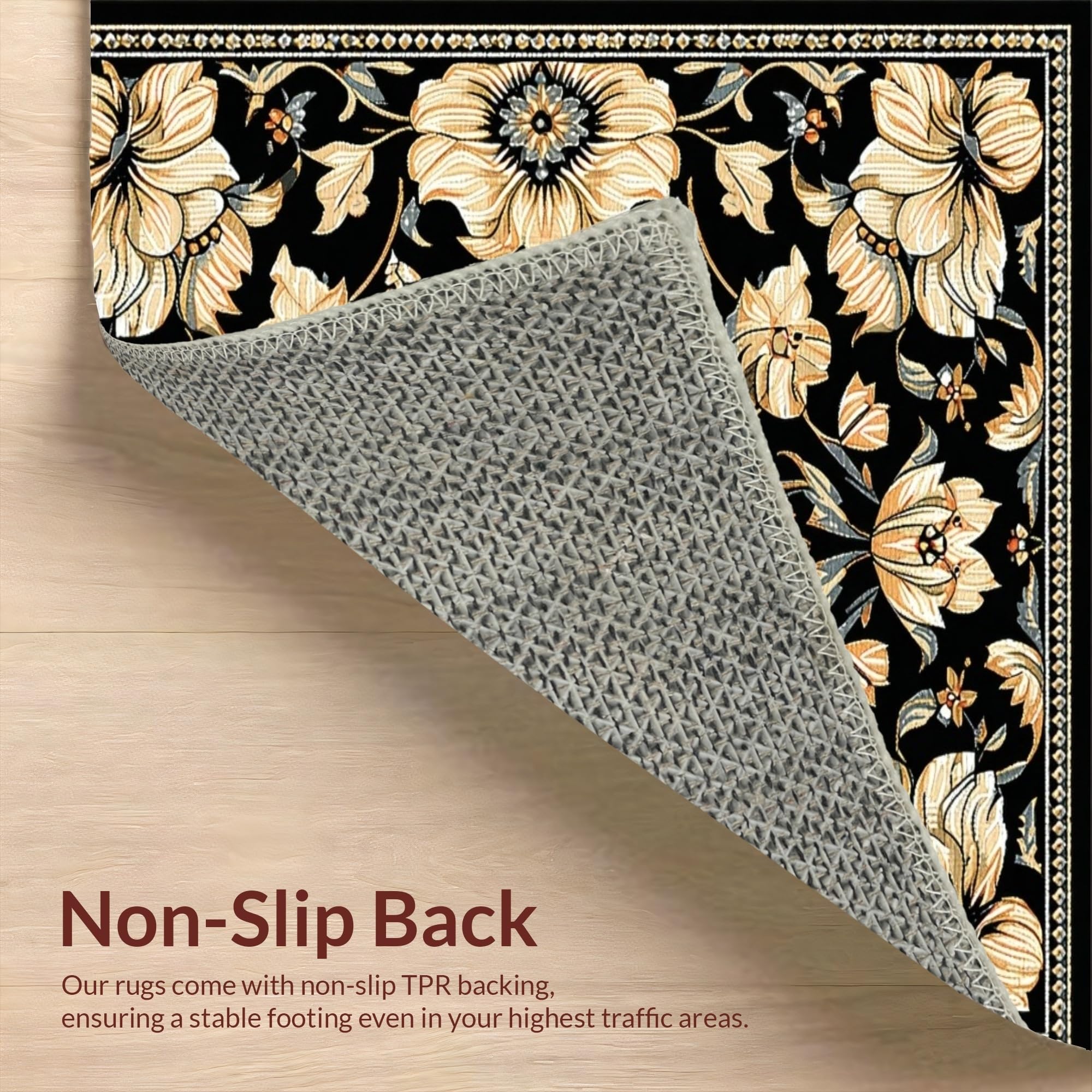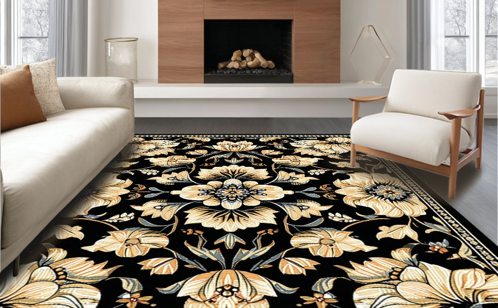 Ultra Soft Area Rug, Non Slip, Stain Resistant, Washable Area Rugs for Living Room, Bedroom, Contemporary Vintage Blossom Style(Black) Overview: