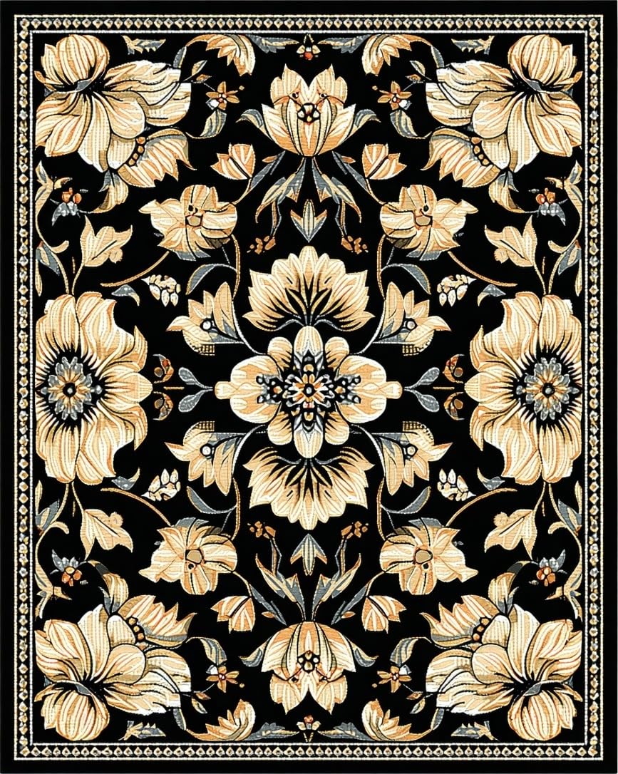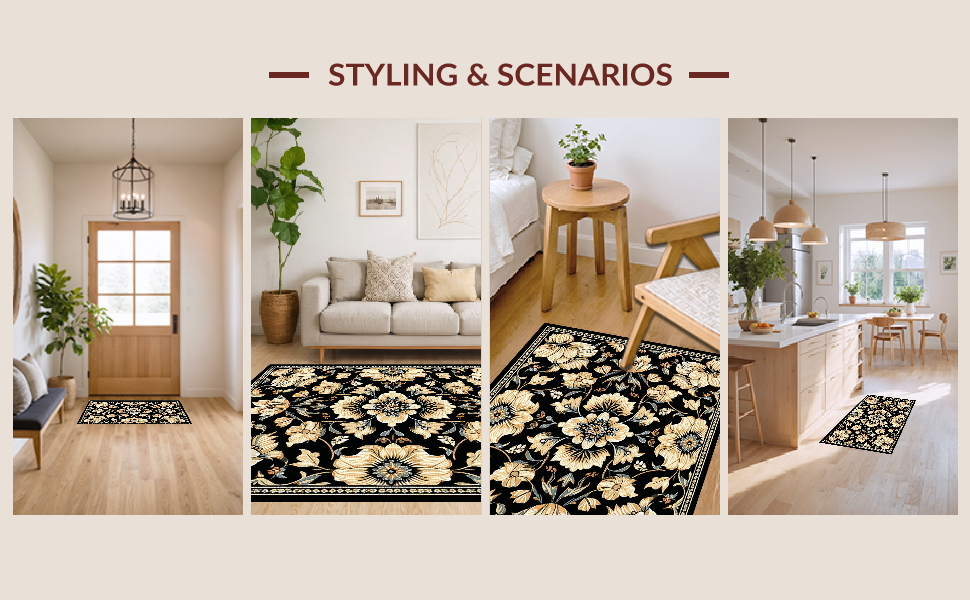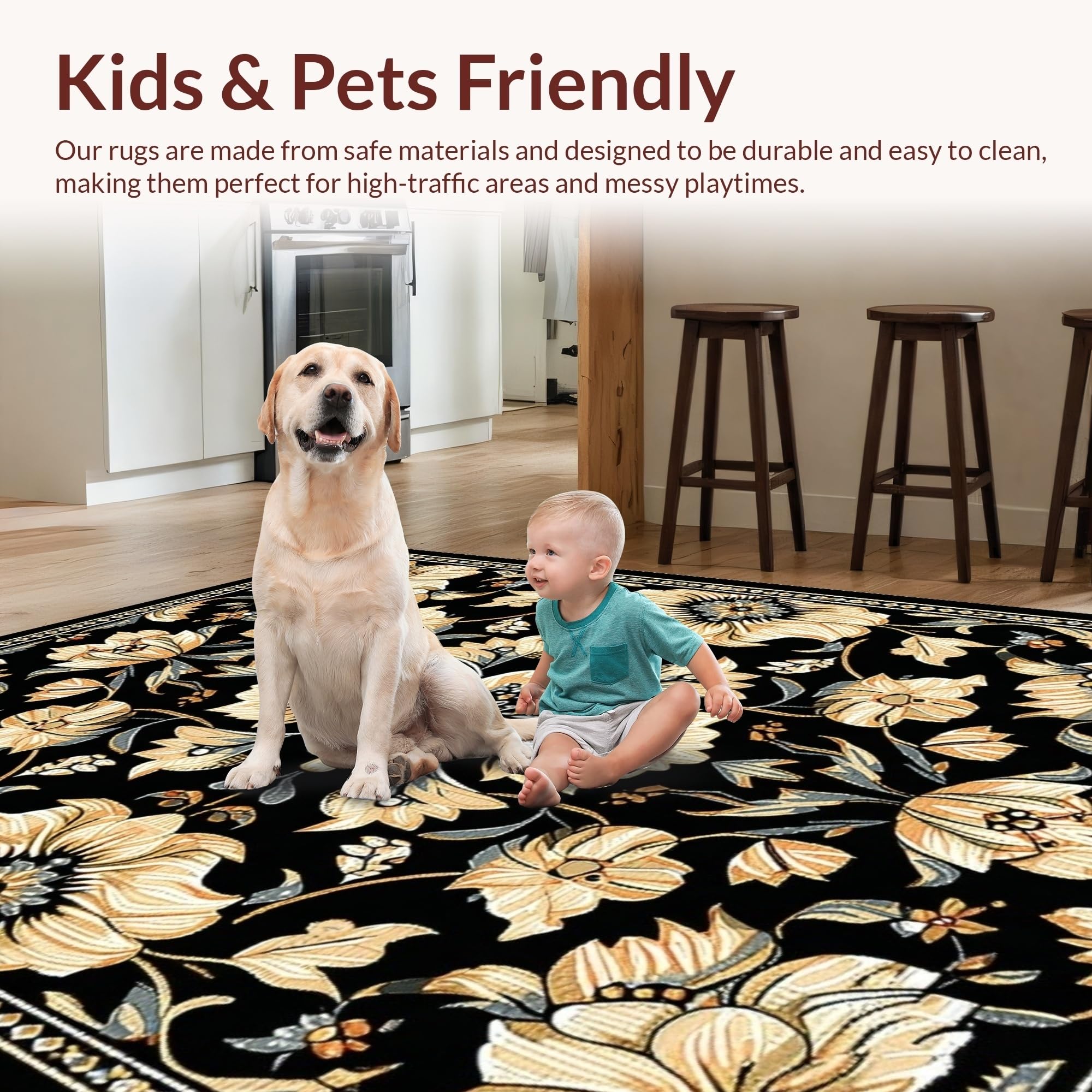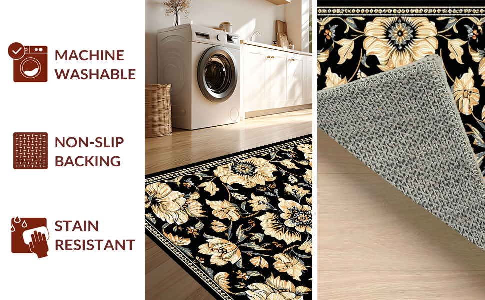 Ultra Soft Area Rug, Non Slip, Stain Resistant, Washable Area Rugs for Living Room, Bedroom, Contemporary Vintage Blossom Style(Black) Overview: