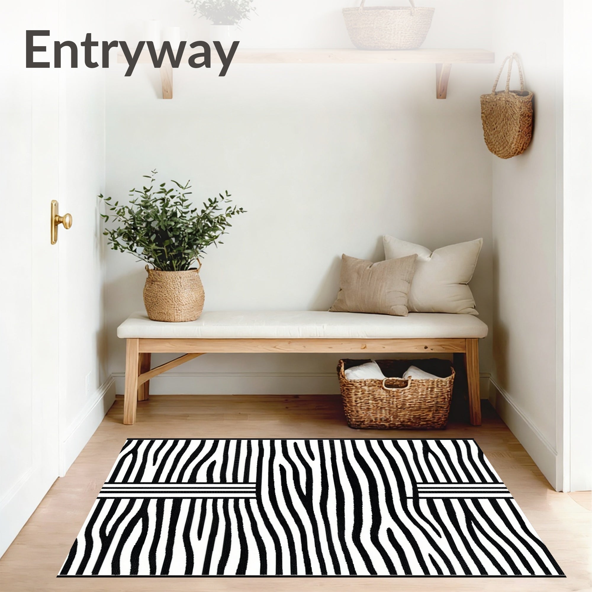 Ultra Soft Area Rug, Non Slip, Stain Resistant, Washable Area Rugs for Living Room, Bedroom, Contemporary Zebra Skin Inspired Non Slip Rug with Dynamic Linear Texture(Black) Overview: