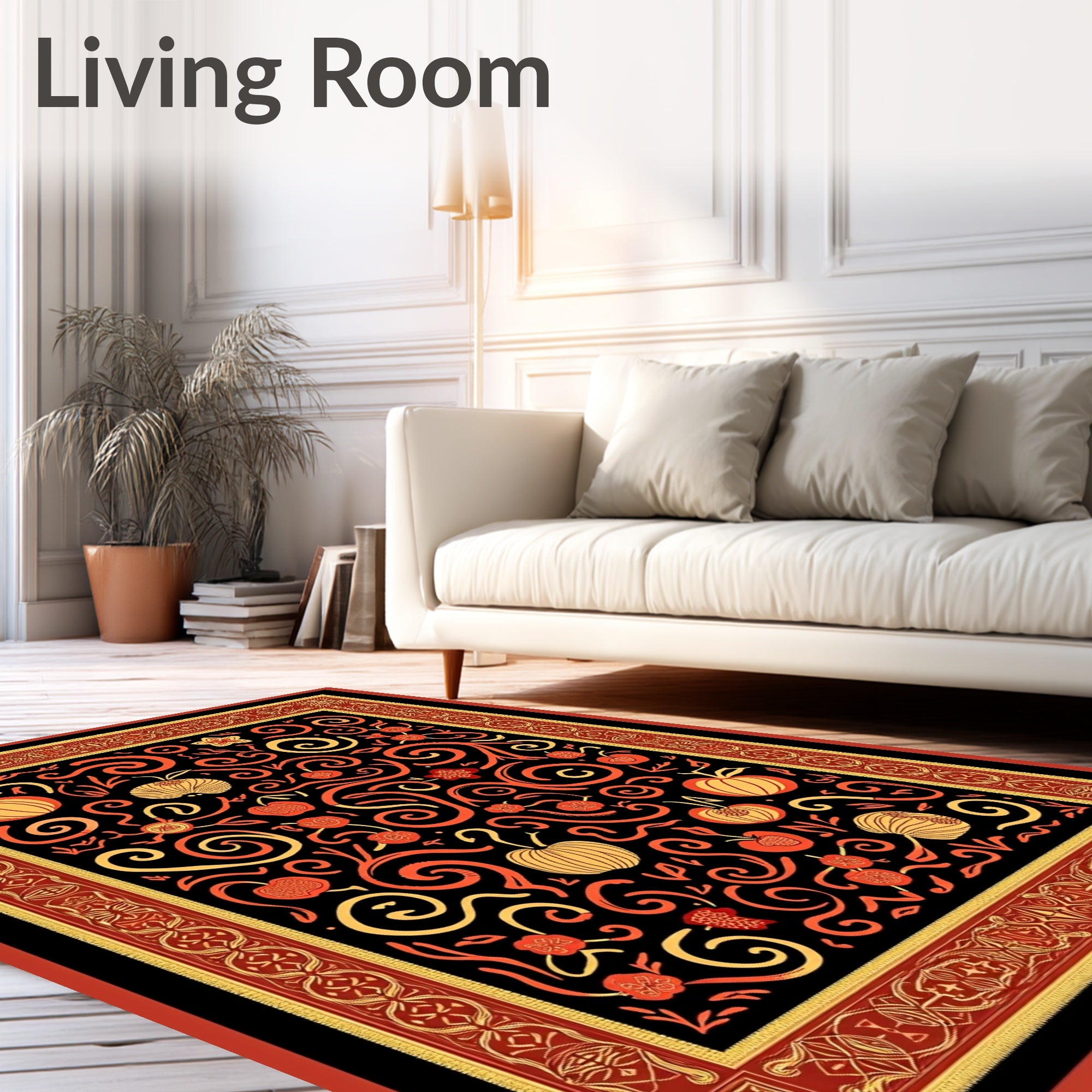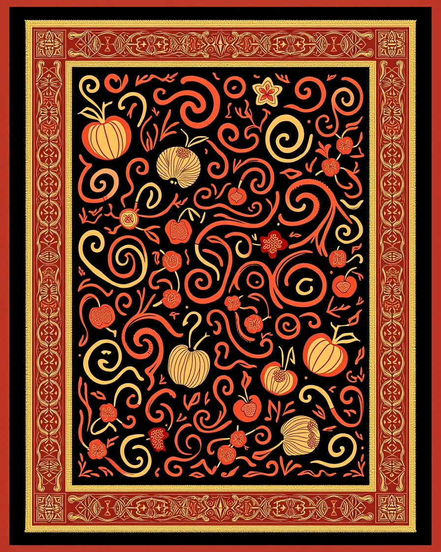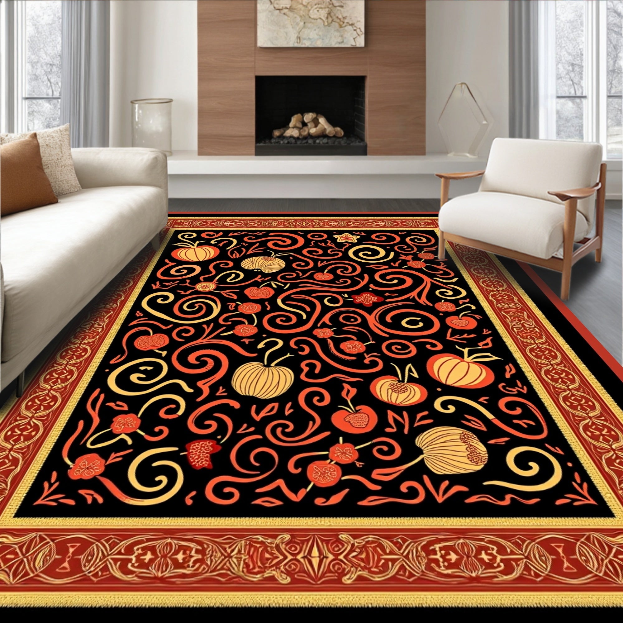 Ultra Soft Area Rug, Non Slip, Stain Resistant, Washable Area Rugs for Living Room, Bedroom, Cornucopia Abundance Scroll Design with Harvest Fruit Clusters(Black) Overview: