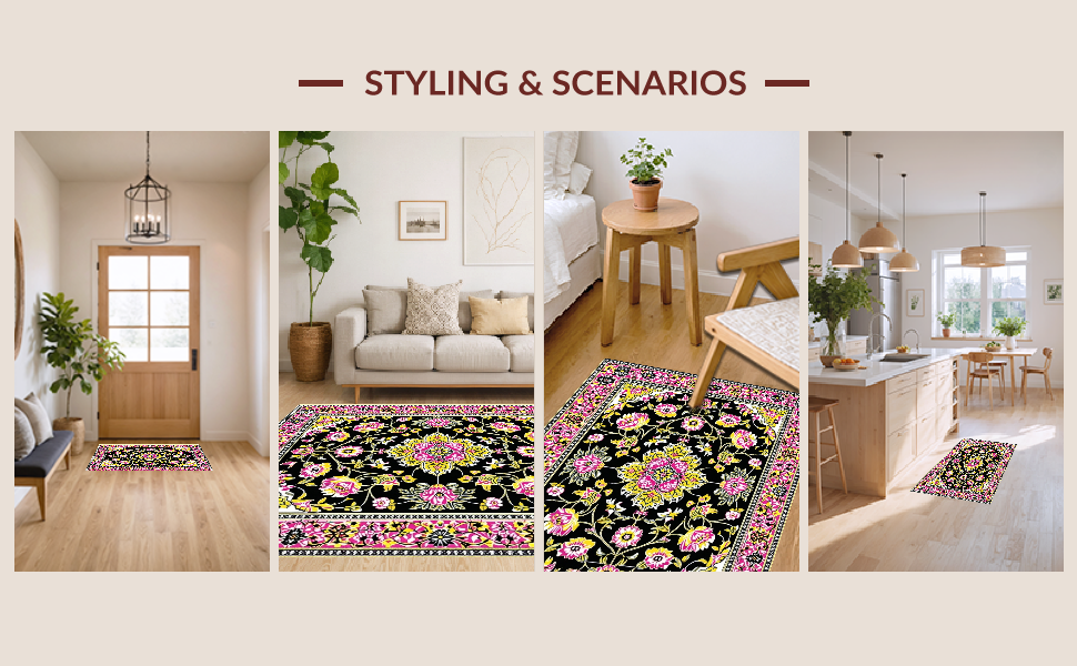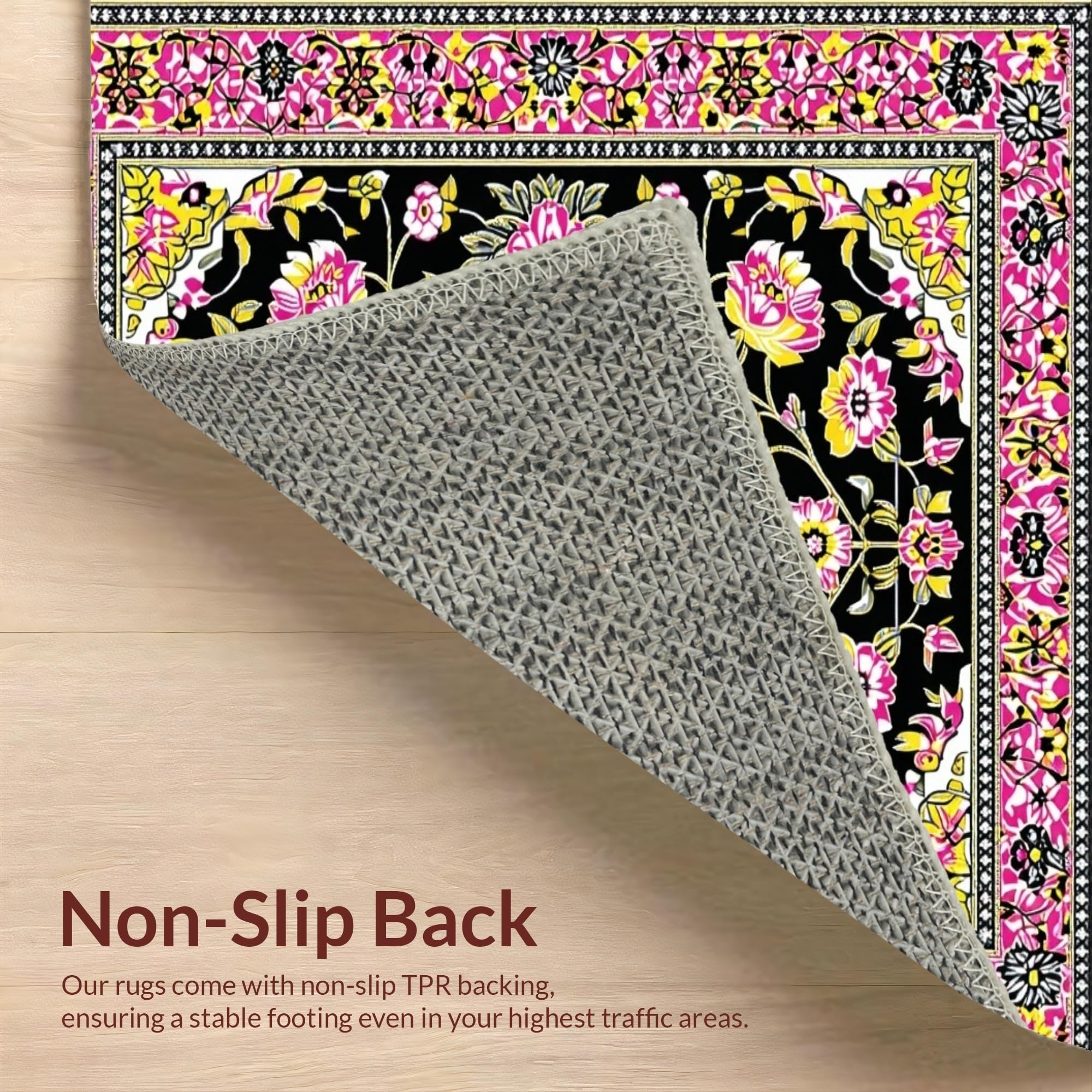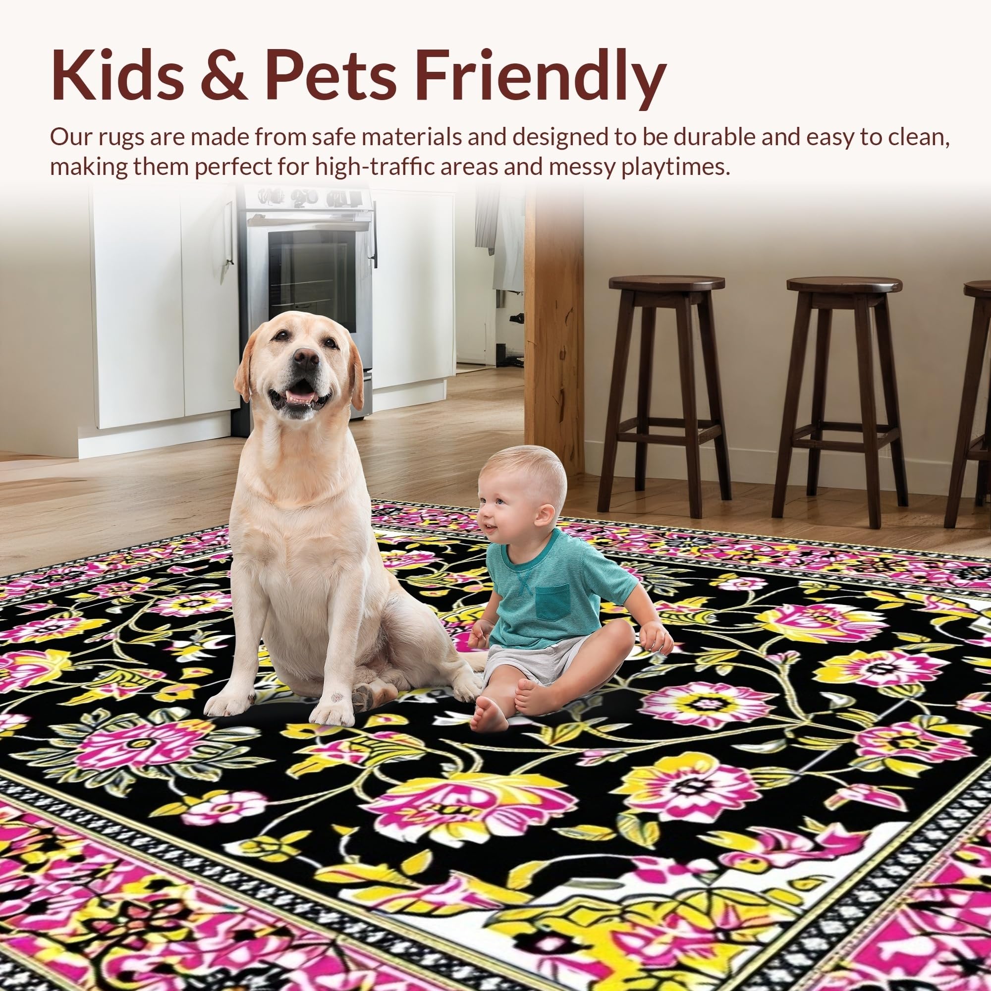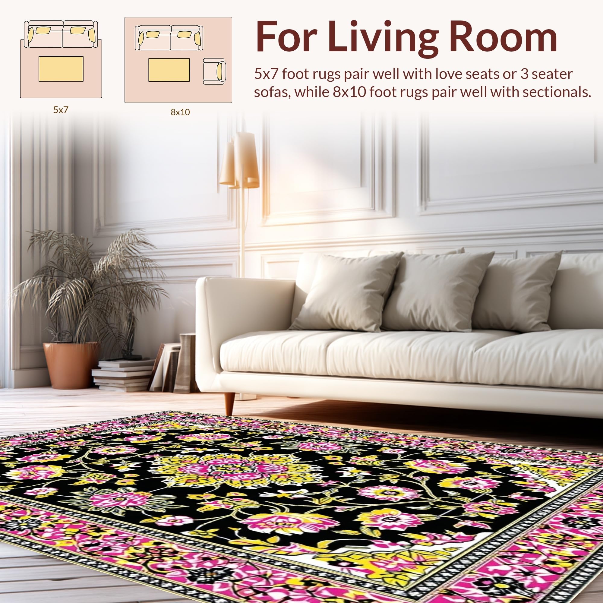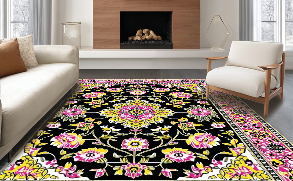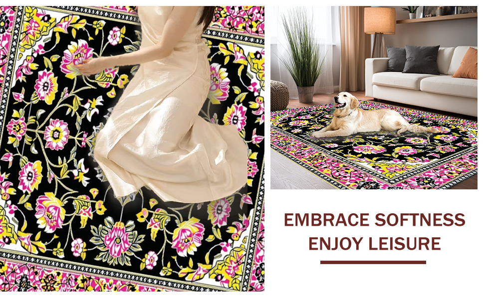 Ultra Soft Area Rug, Non Slip, Stain Resistant, Washable Area Rugs for Living Room, Bedroom, Cozy Pastel Floral Elegance(Black) Overview: