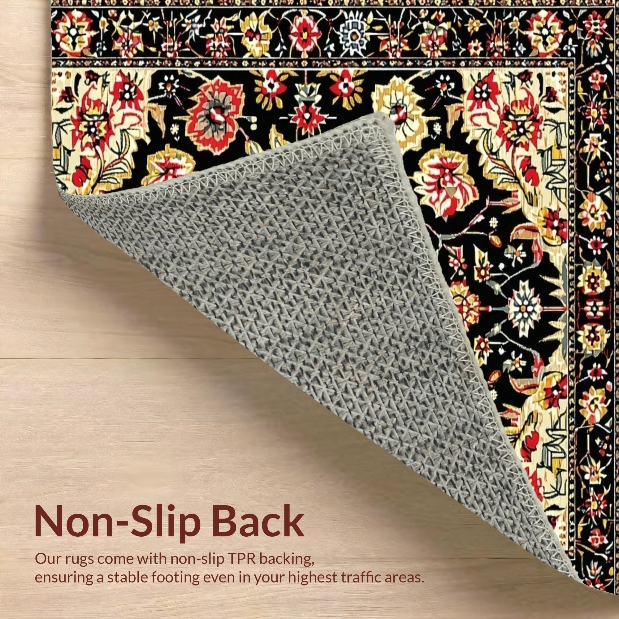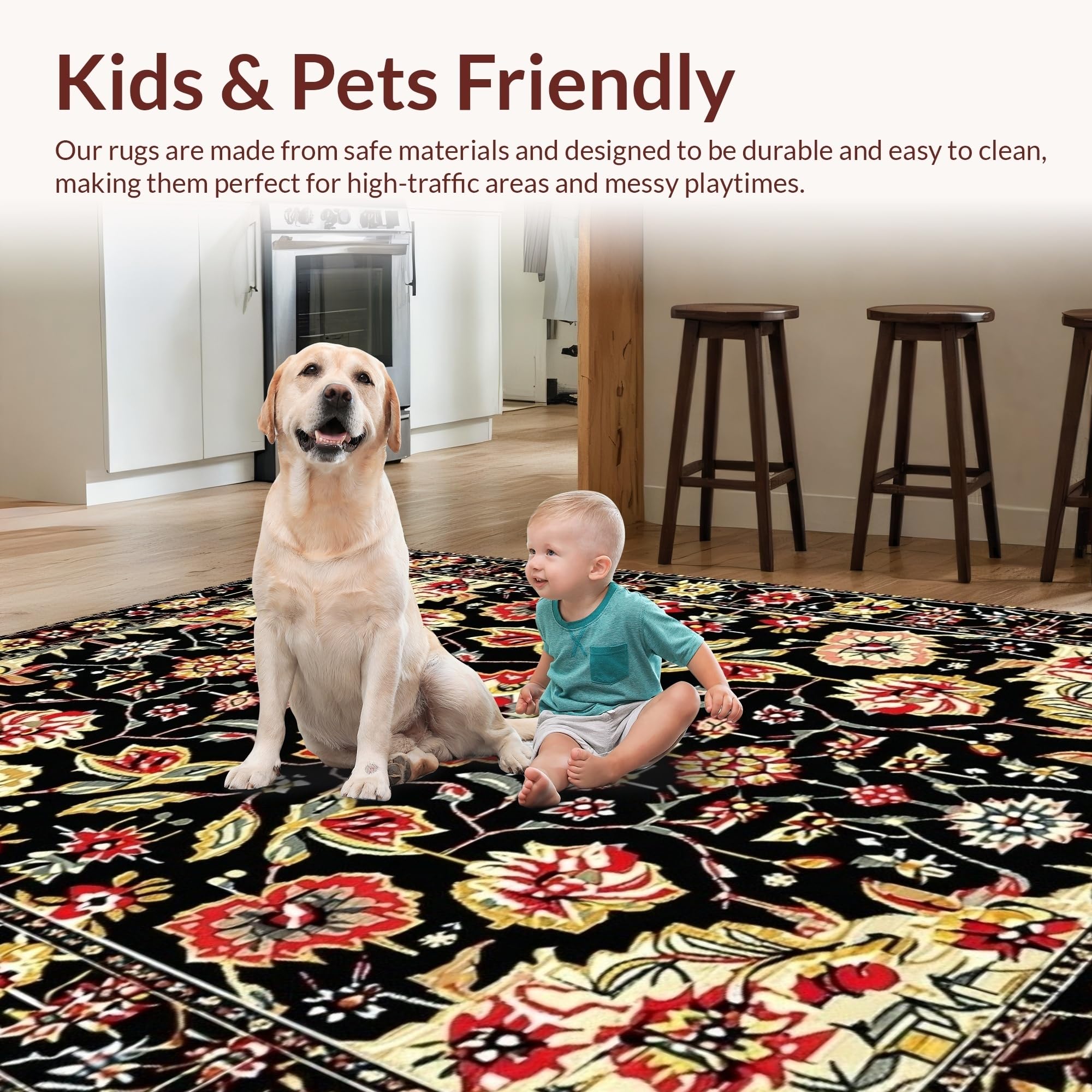 Ultra Soft Area Rug, Non Slip, Stain Resistant, Washable Area Rugs for Living Room, Bedroom, Cozy Retro Floral Vibes(Black) Overview: