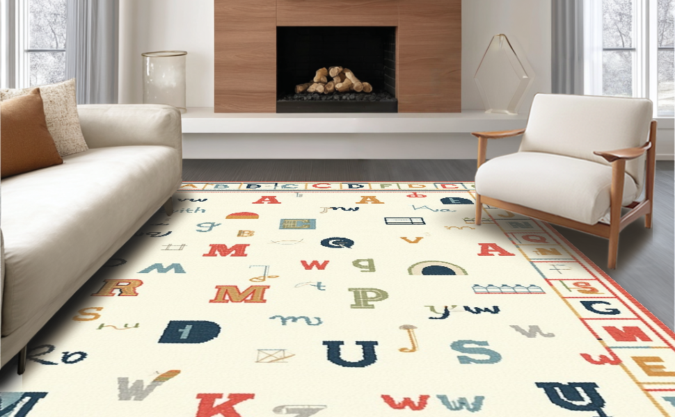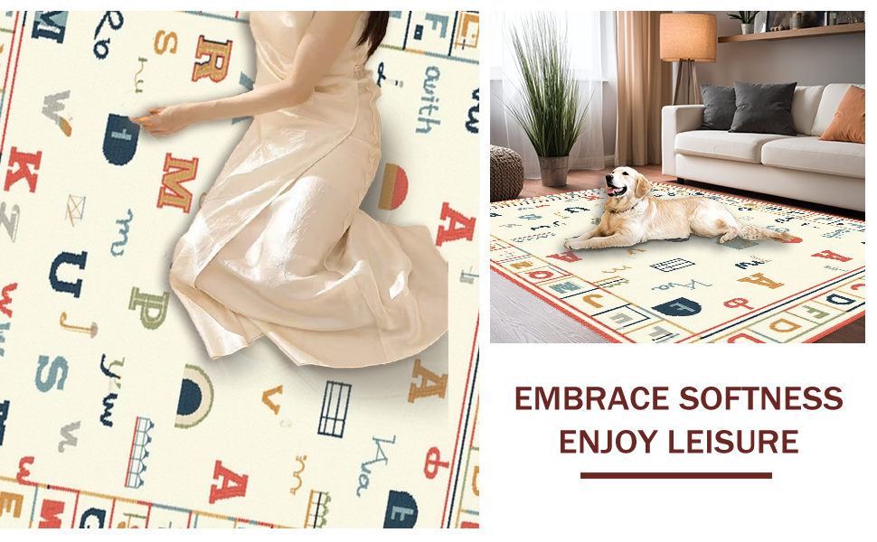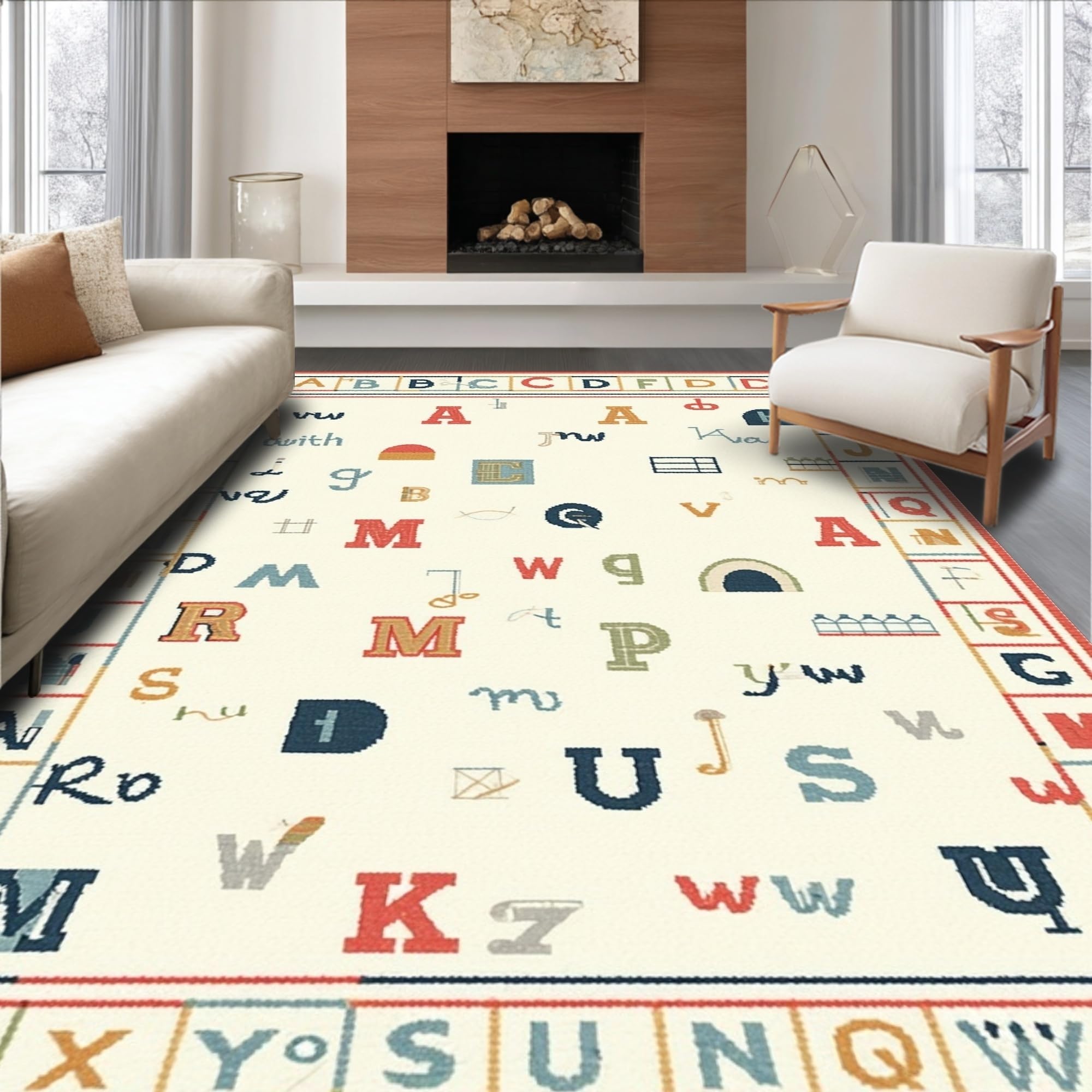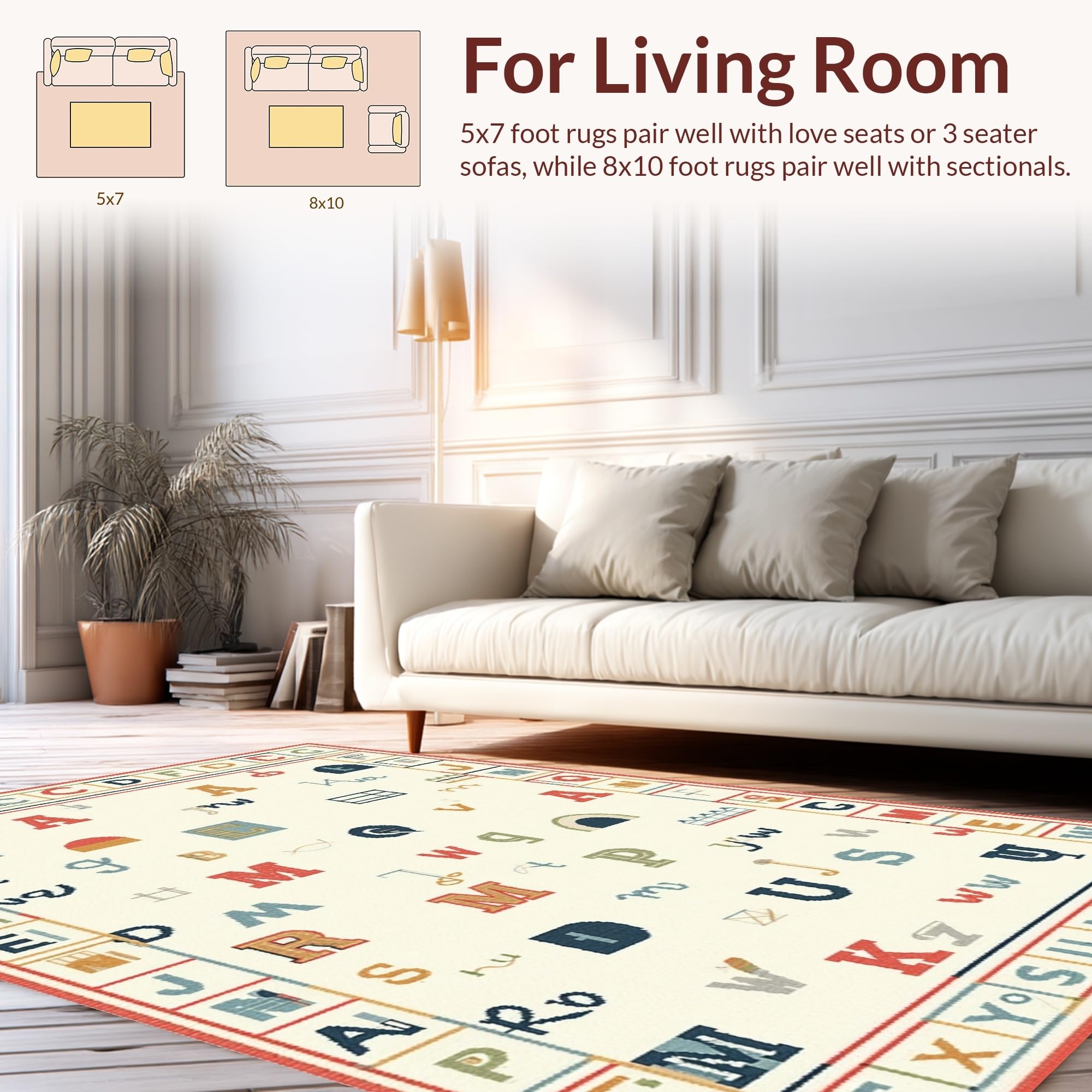 Ultra Soft Area Rug, Non Slip, Stain Resistant, Washable Area Rugs for Living Room, Bedroom, Cozy Round Learning Alphabet Decor(Beige) Overview: