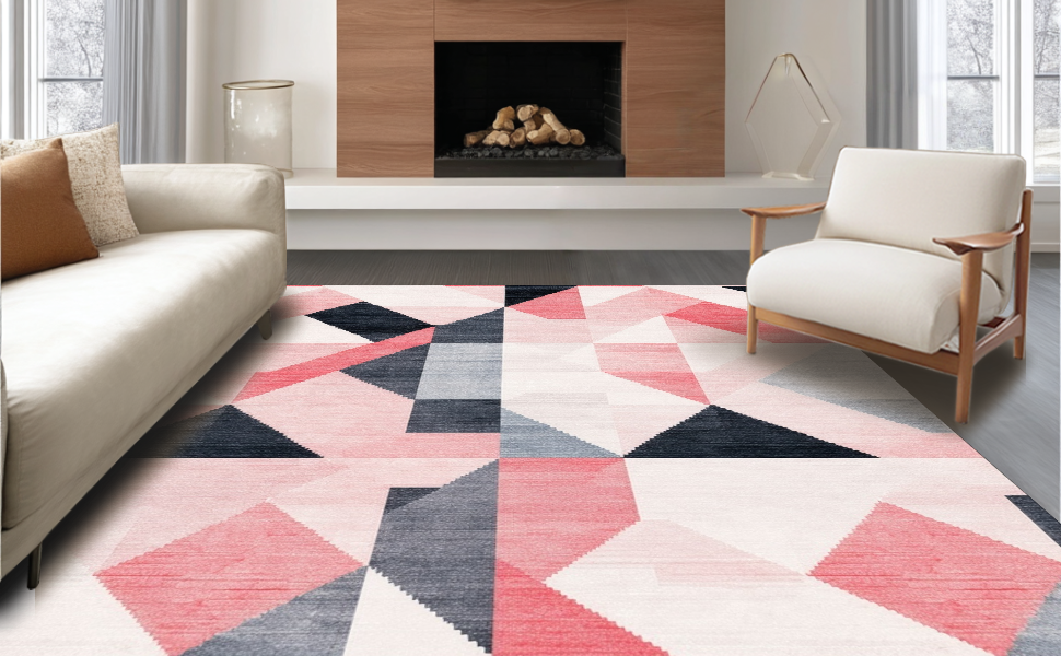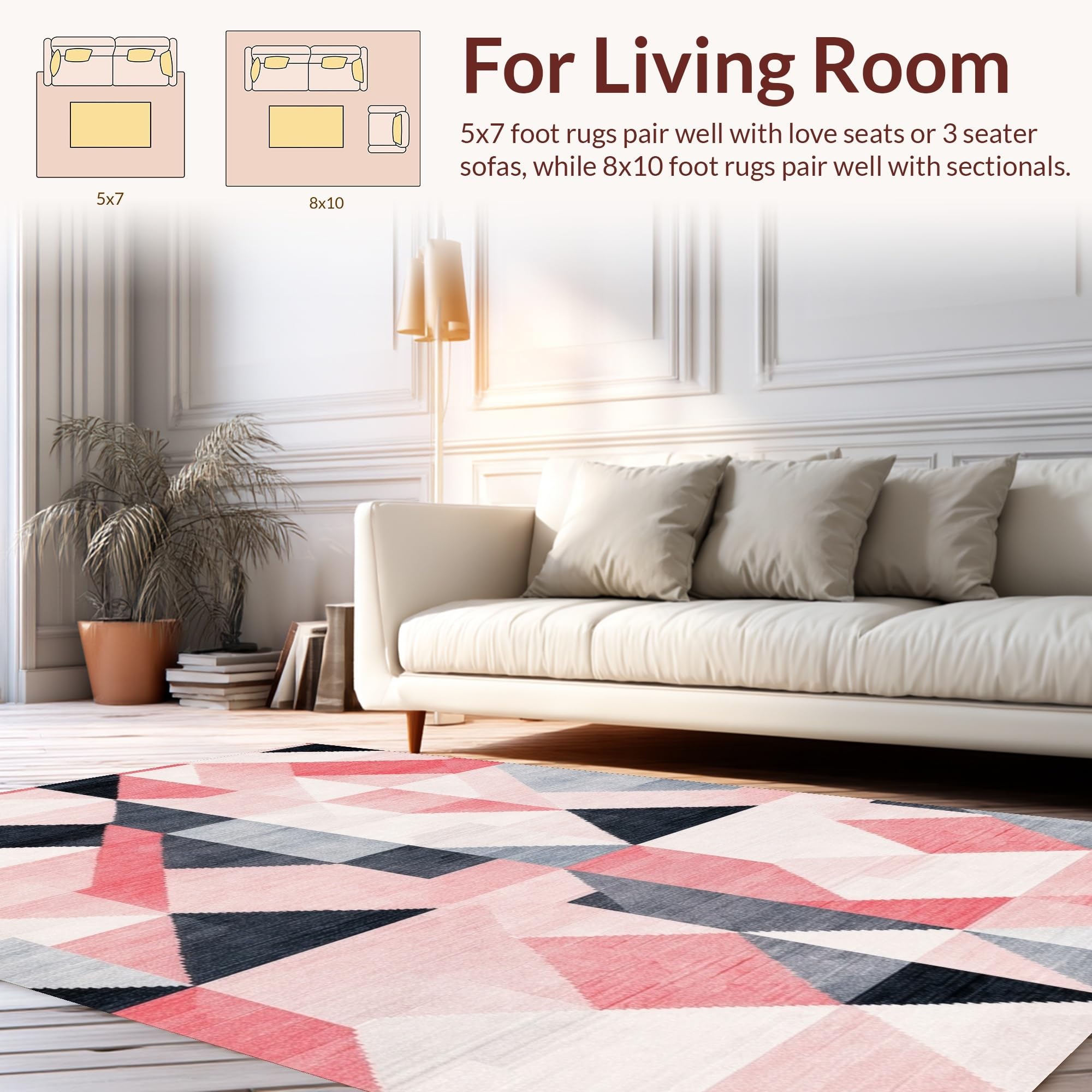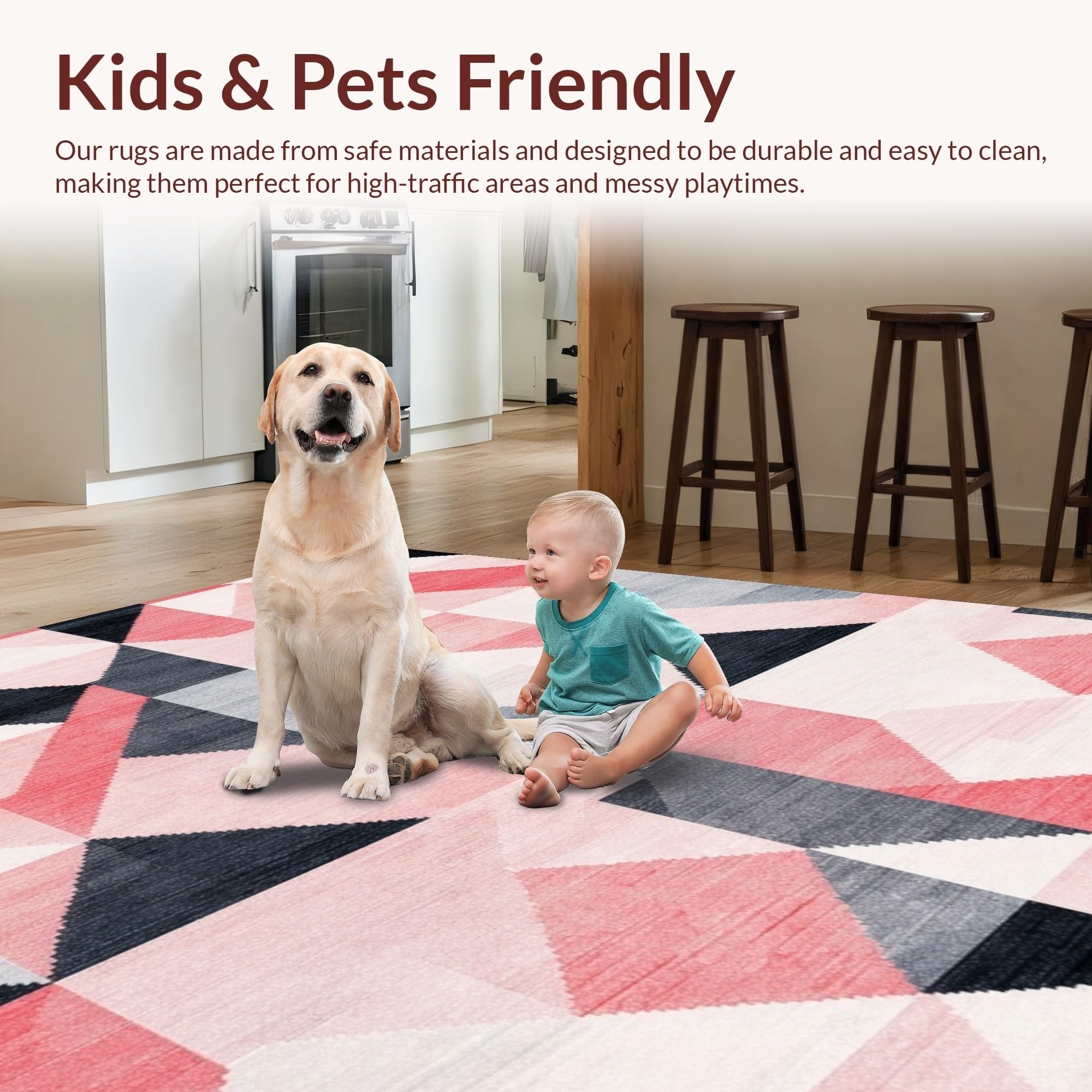 Ultra Soft Area Rug, Non Slip, Stain Resistant, Washable Area Rugs for Living Room, Bedroom, Cozy Triangle Motif in Pastels(Pink) Overview: