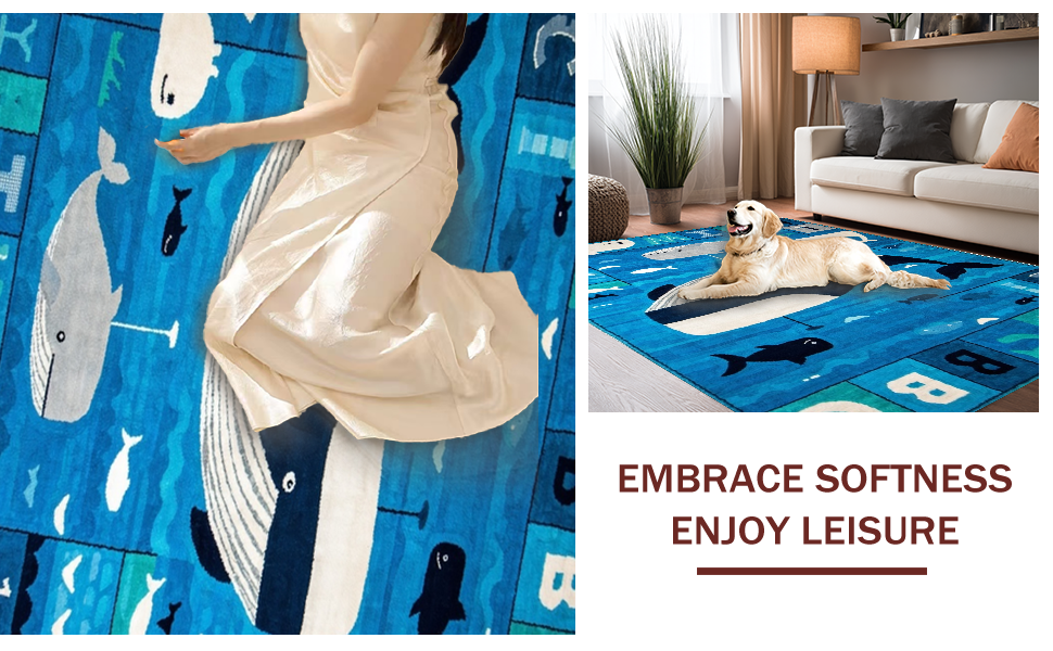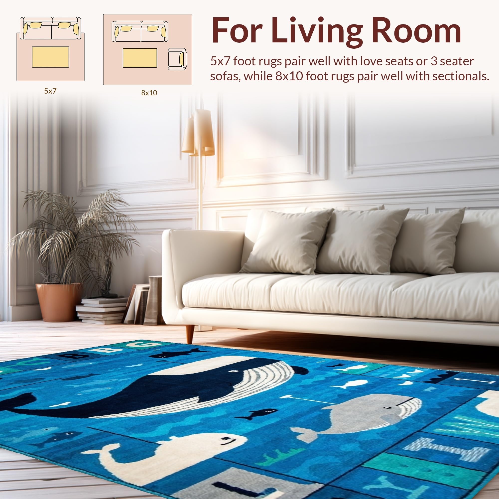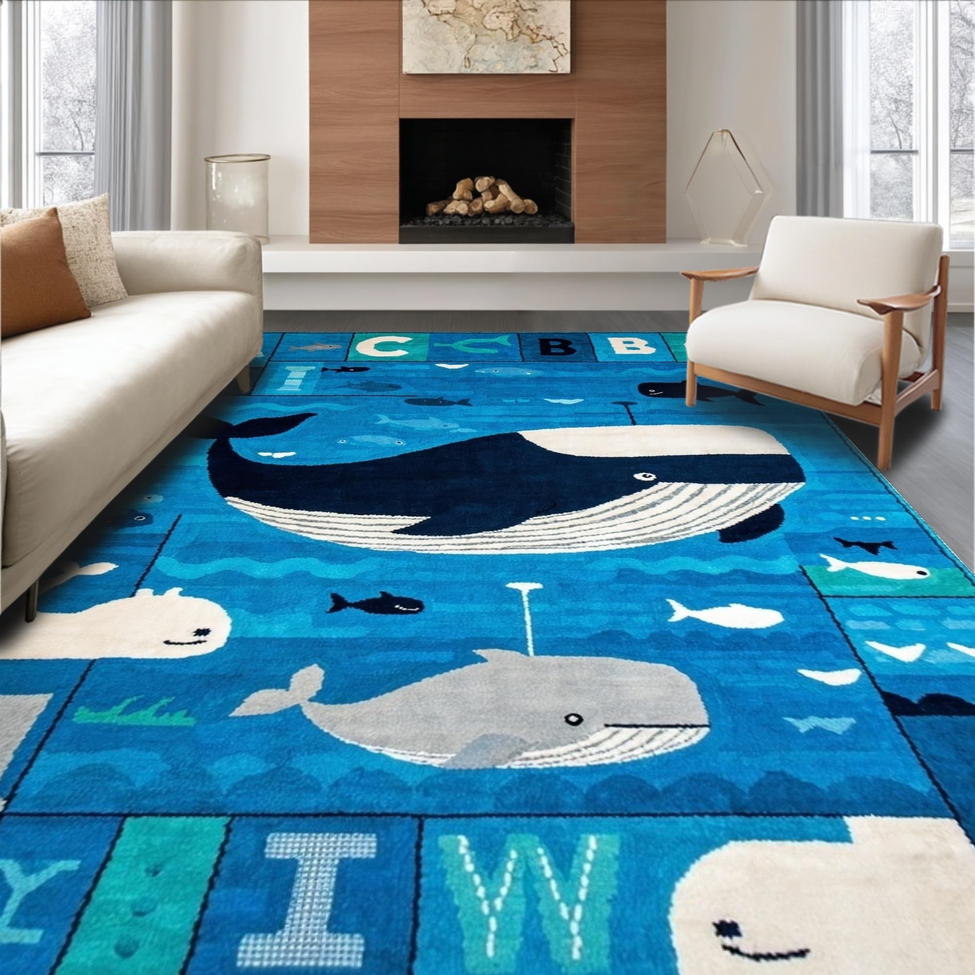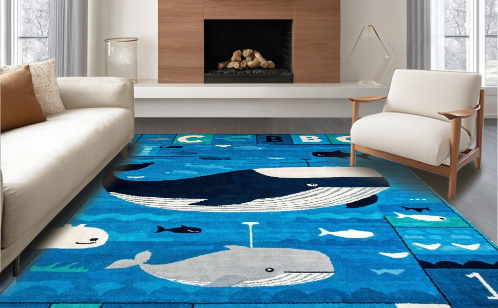 Ultra Soft Area Rug, Non Slip, Stain Resistant, Washable Area Rugs for Living Room, Bedroom, Cozy Underwater Alphabetic Illustration(Blue) Overview: