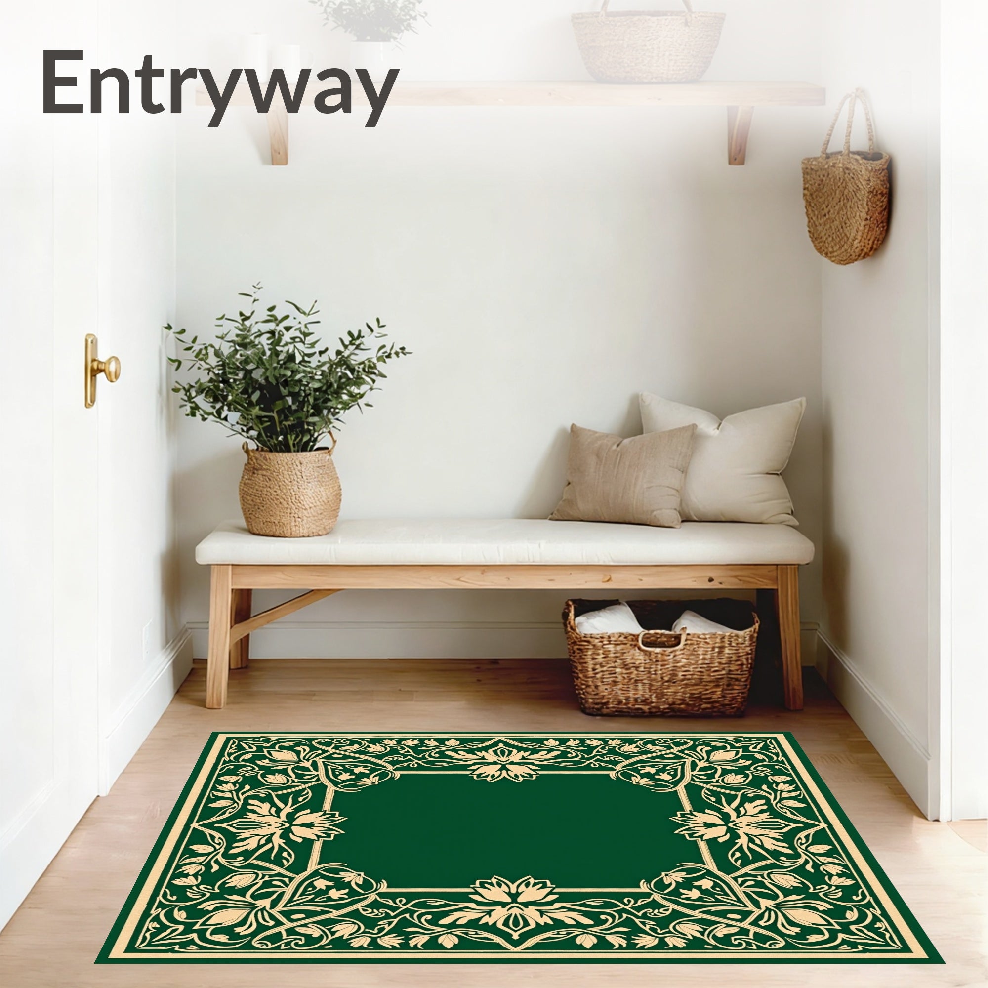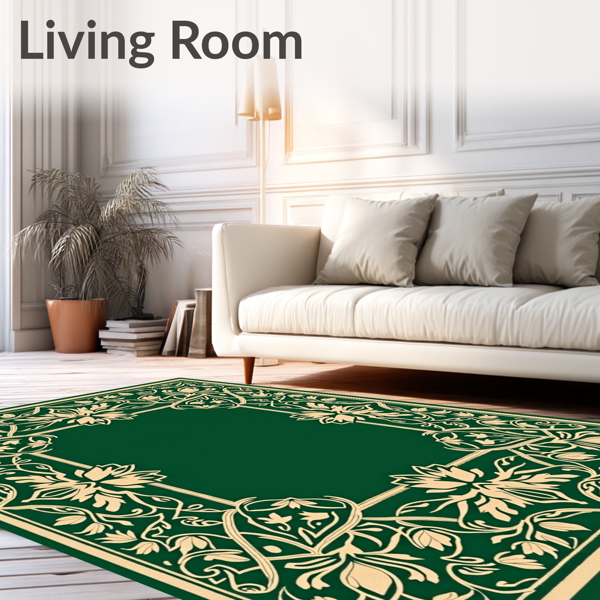 Ultra Soft Area Rug, Non Slip, Stain Resistant, Washable Area Rugs for Living Room, Bedroom, Crimson Foliage with Vintage Filigree Details(Green) Overview: