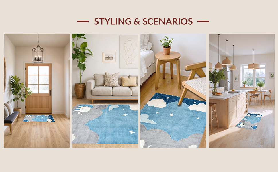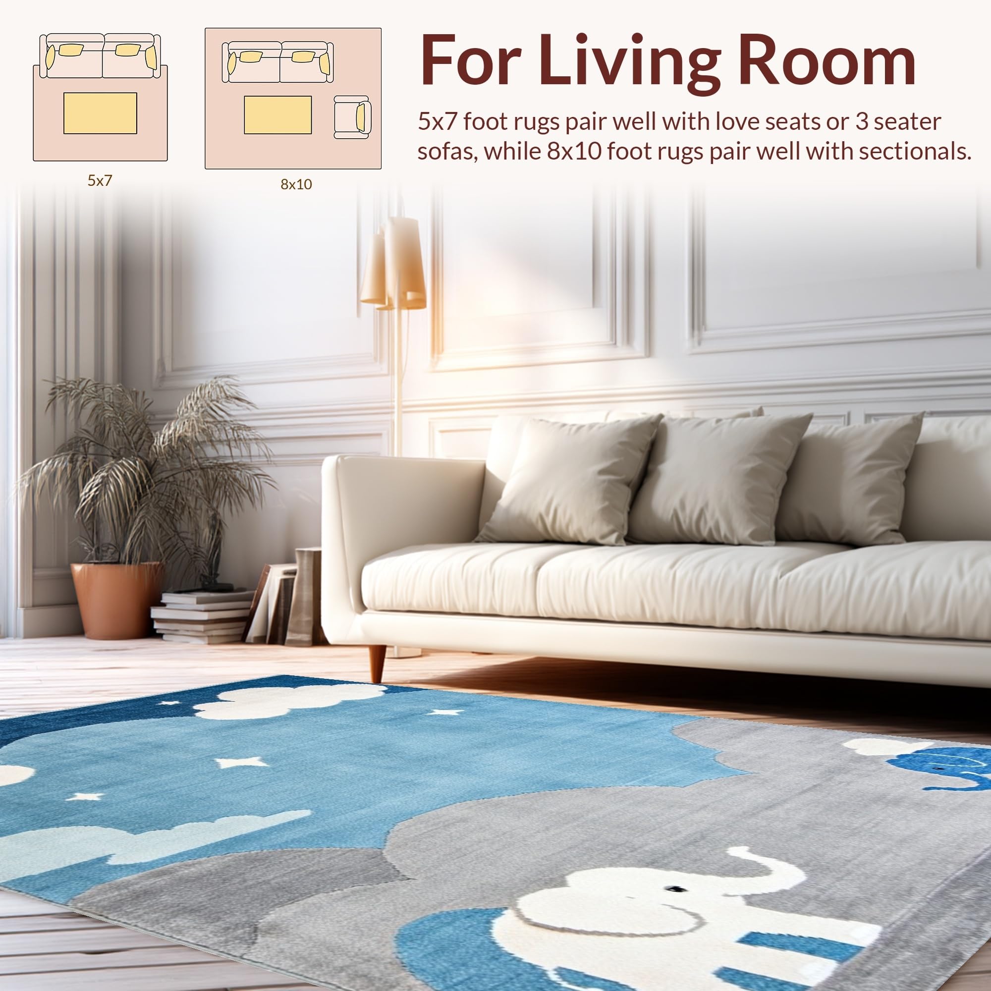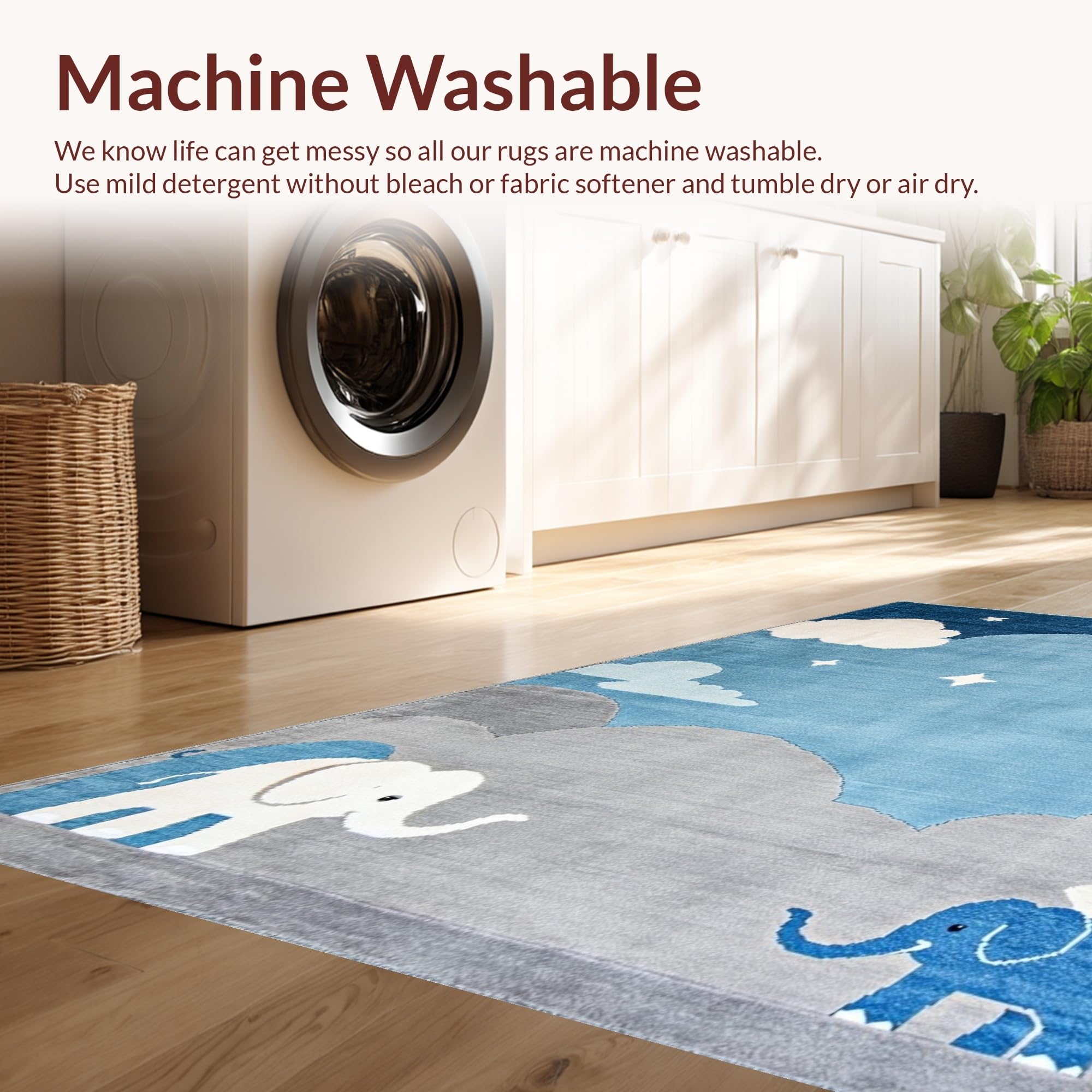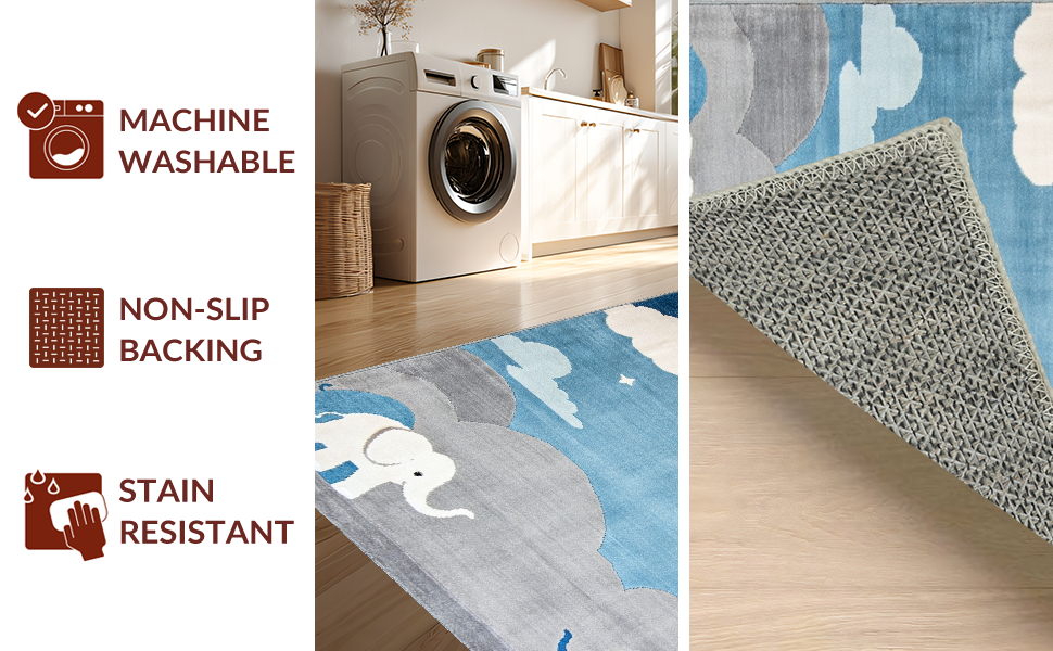 Ultra Soft Area Rug, Non Slip, Stain Resistant, Washable Area Rugs for Living Room, Bedroom, Cute Cloud and Elephant Design(Blue) Overview: