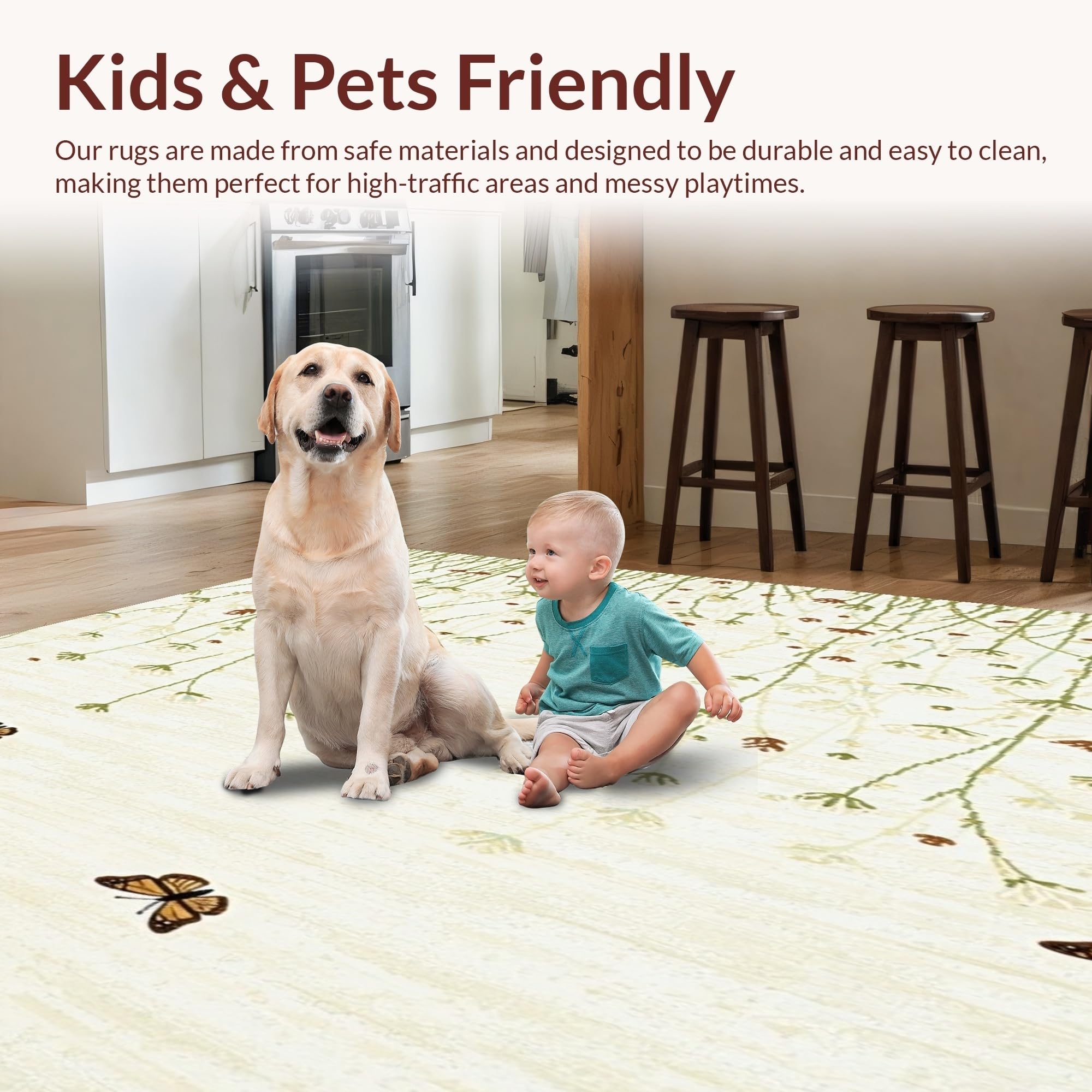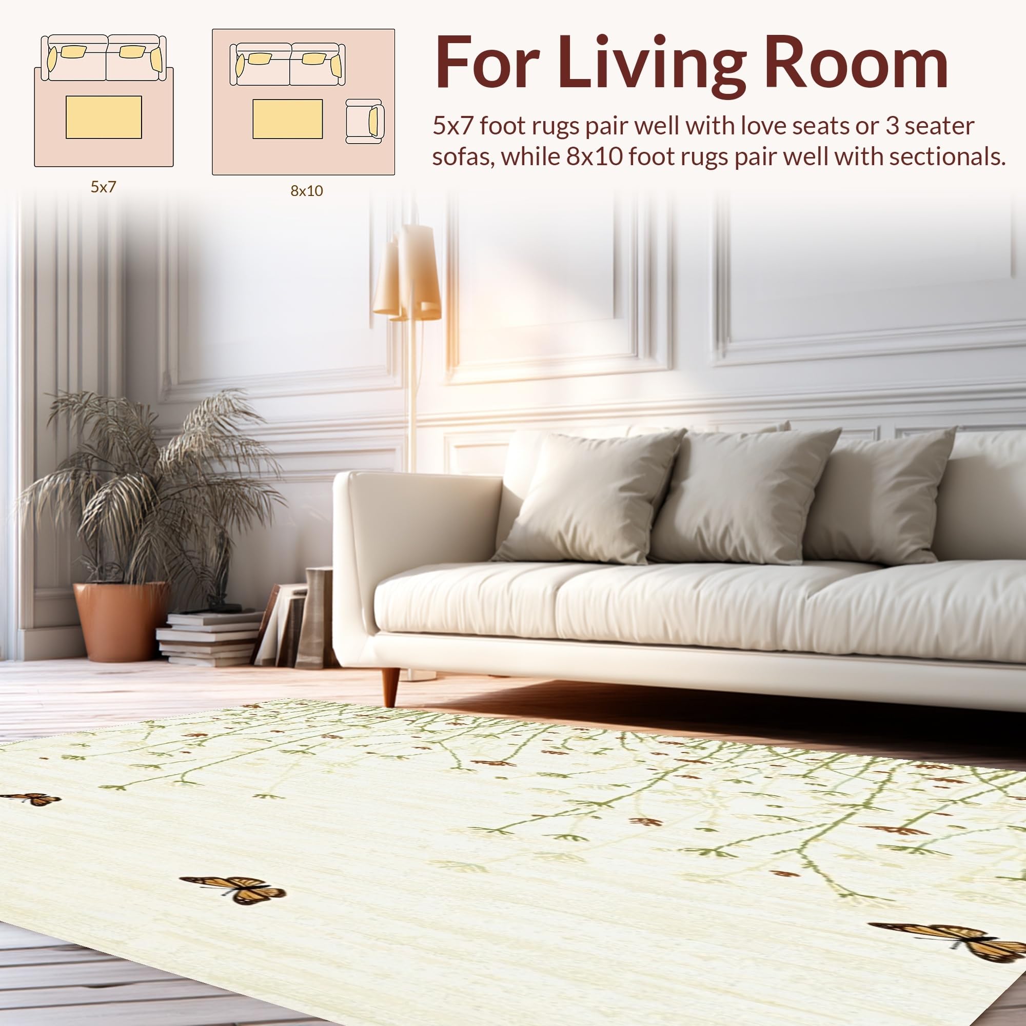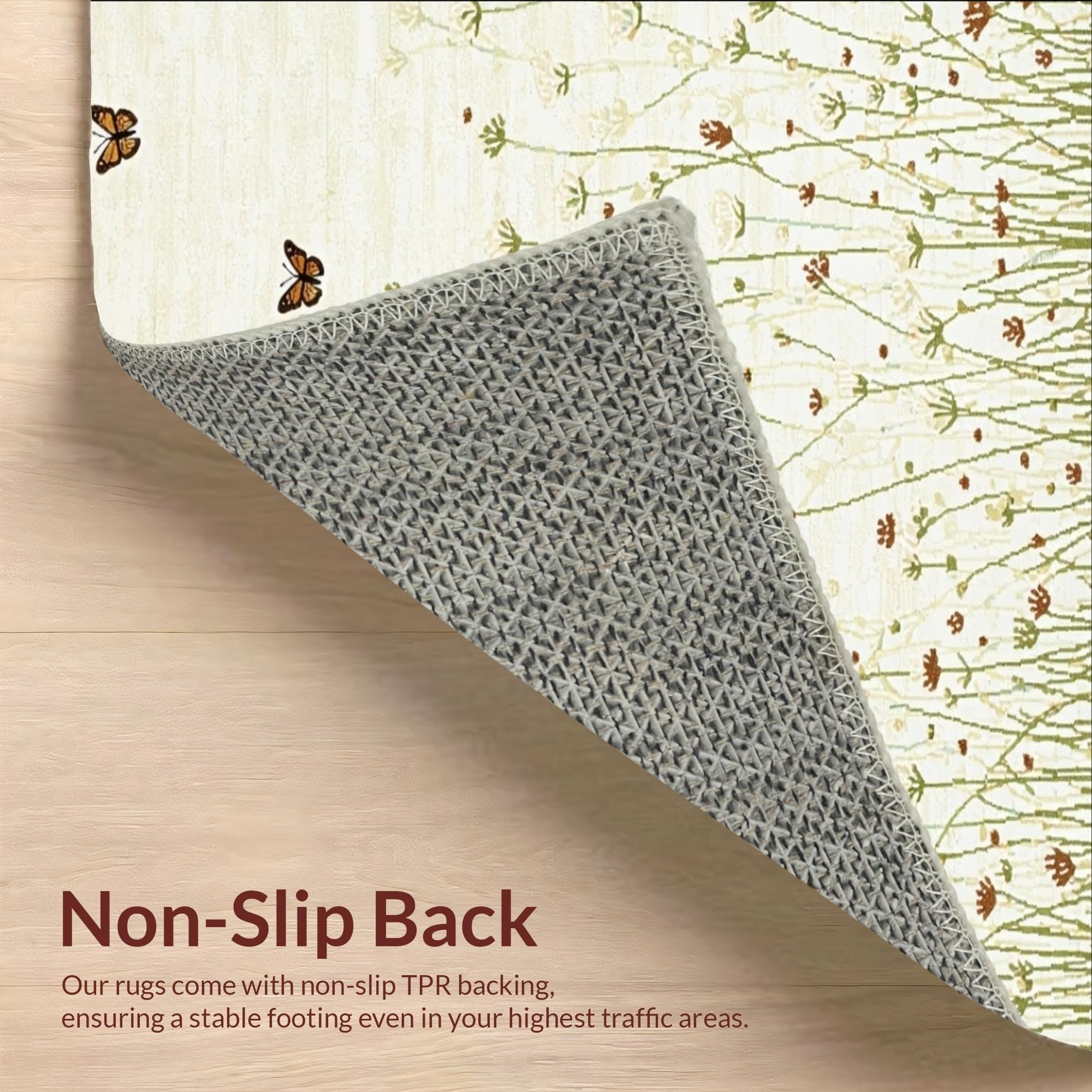 Ultra Soft Area Rug, Non Slip, Stain Resistant, Washable Area Rugs for Living Room, Bedroom, Dainty Beige Meadow Whimsical Floral Butterfly Indoor(Beige) Overview: