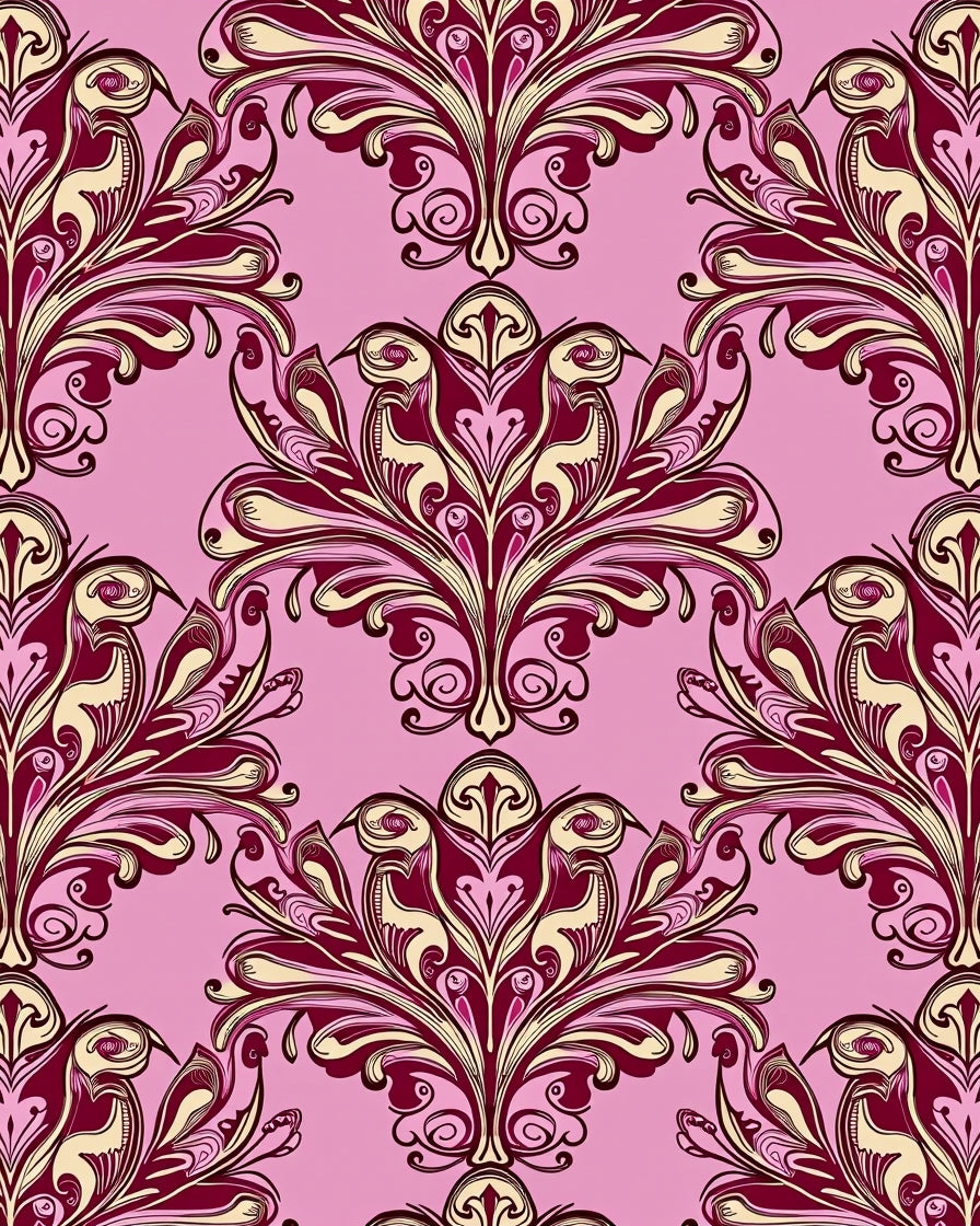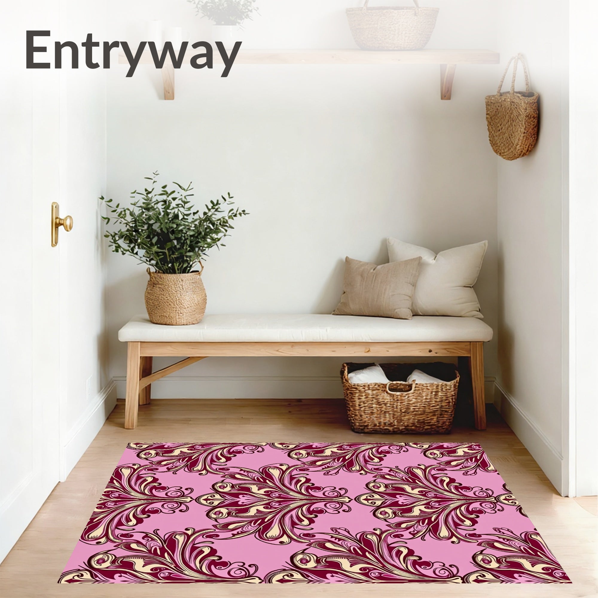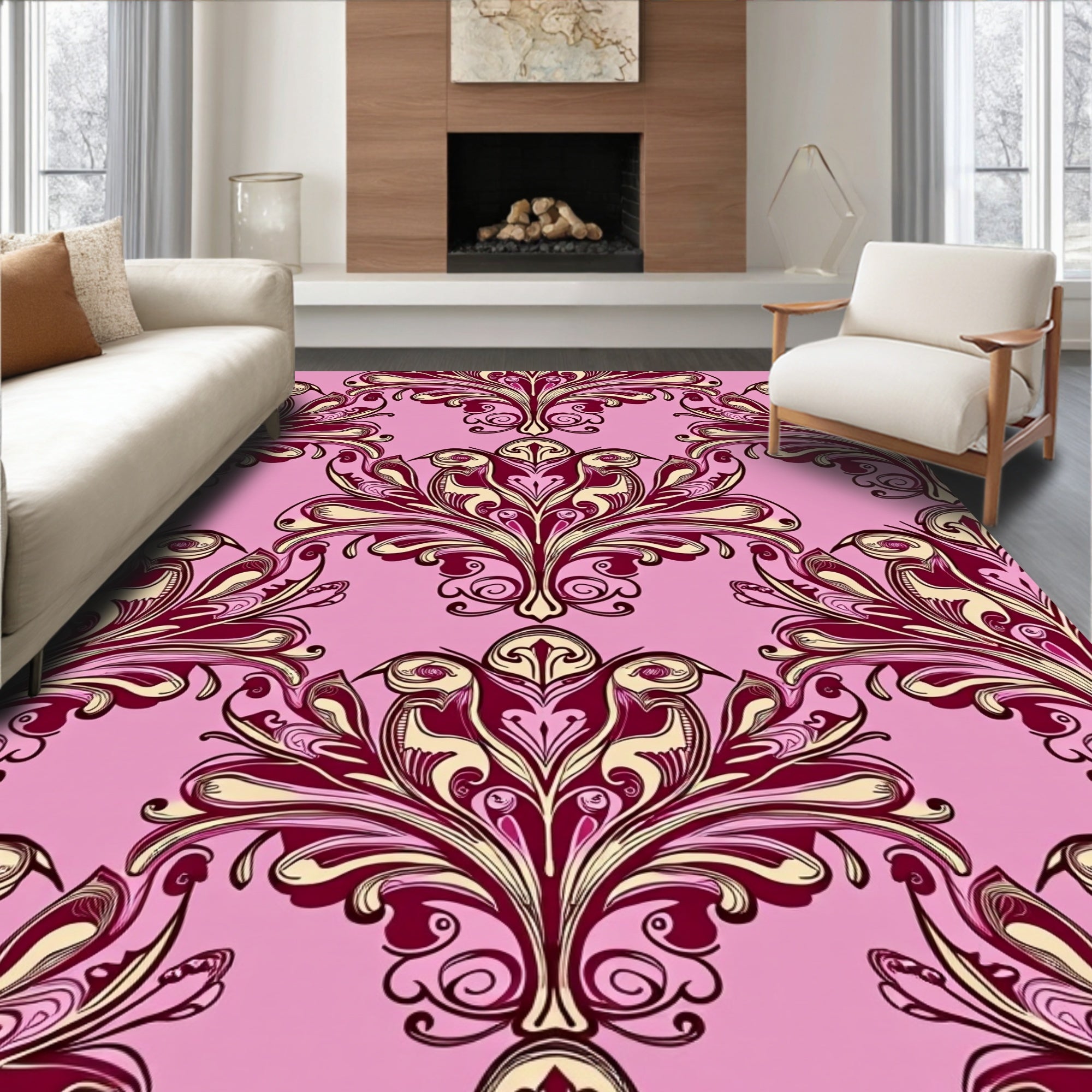 Ultra Soft Area Rug, Non Slip, Stain Resistant, Washable Area Rugs for Living Room, Bedroom, Damask Scroll with Baroque Flourish Details(Pink) Overview:
