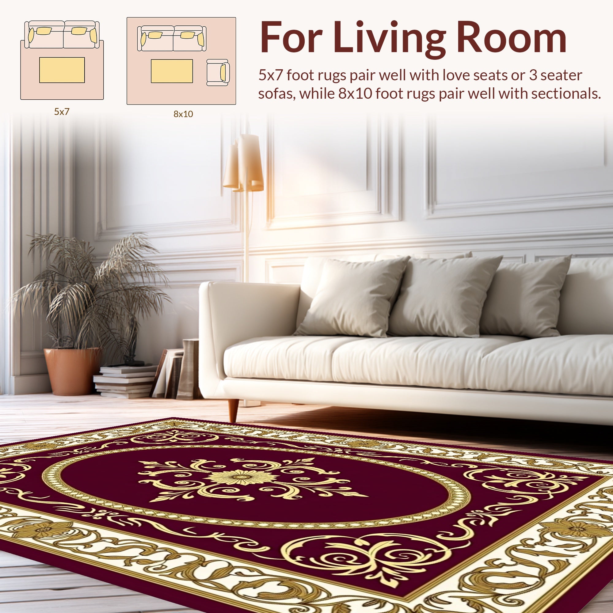 Ultra Soft Area Rug, Non Slip, Stain Resistant, Washable Area Rugs for Living Room, Bedroom, Damask Scrollwork with Renaissance Vine Motifs(Gold) Overview: