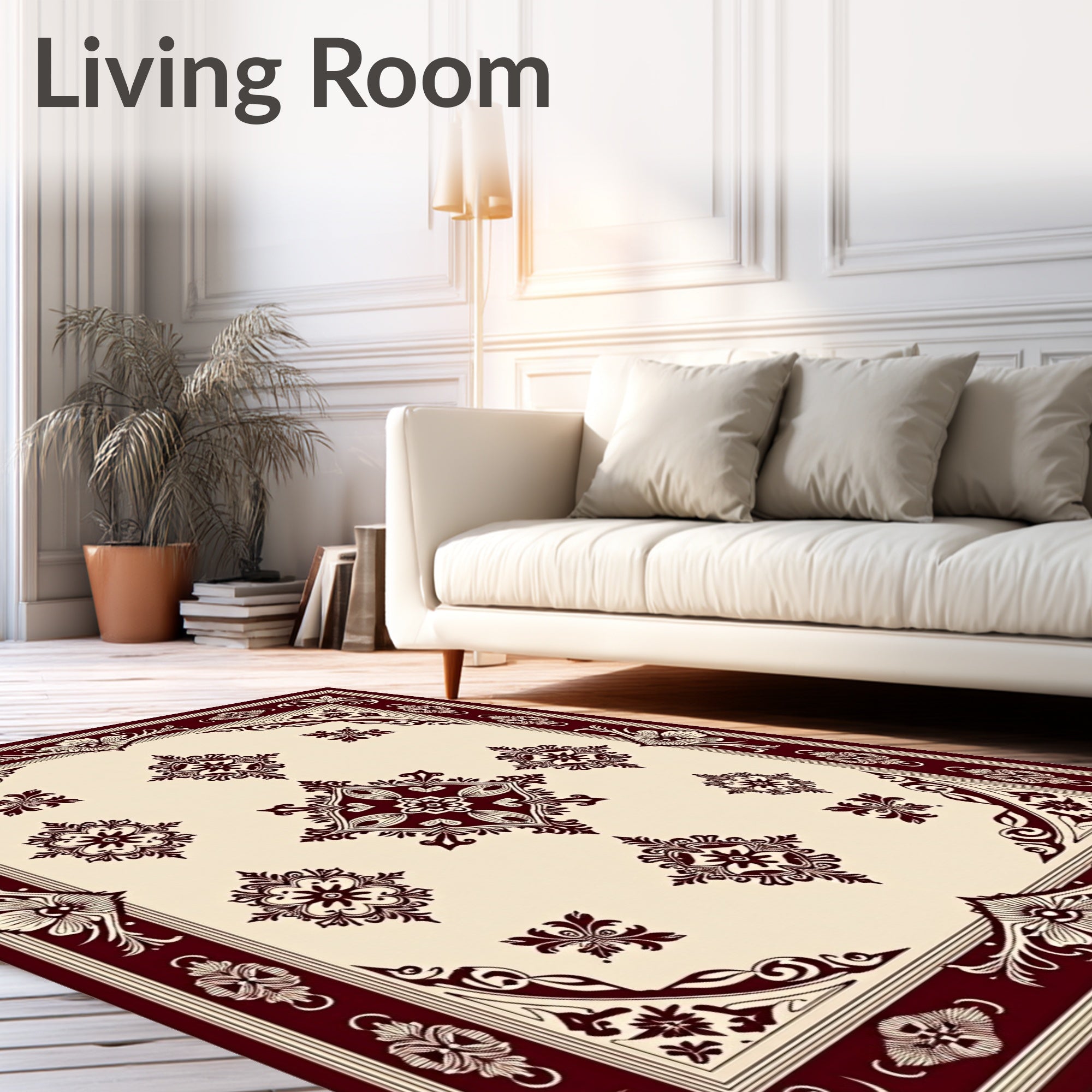 Flatwoven High Traffic Area Rug, Damask Tapestry with Classical European Inspired Details, Non Slip, Stain Resistant, Washable Area Rugs for Living Room, Bedroom (Ivory) Overview: