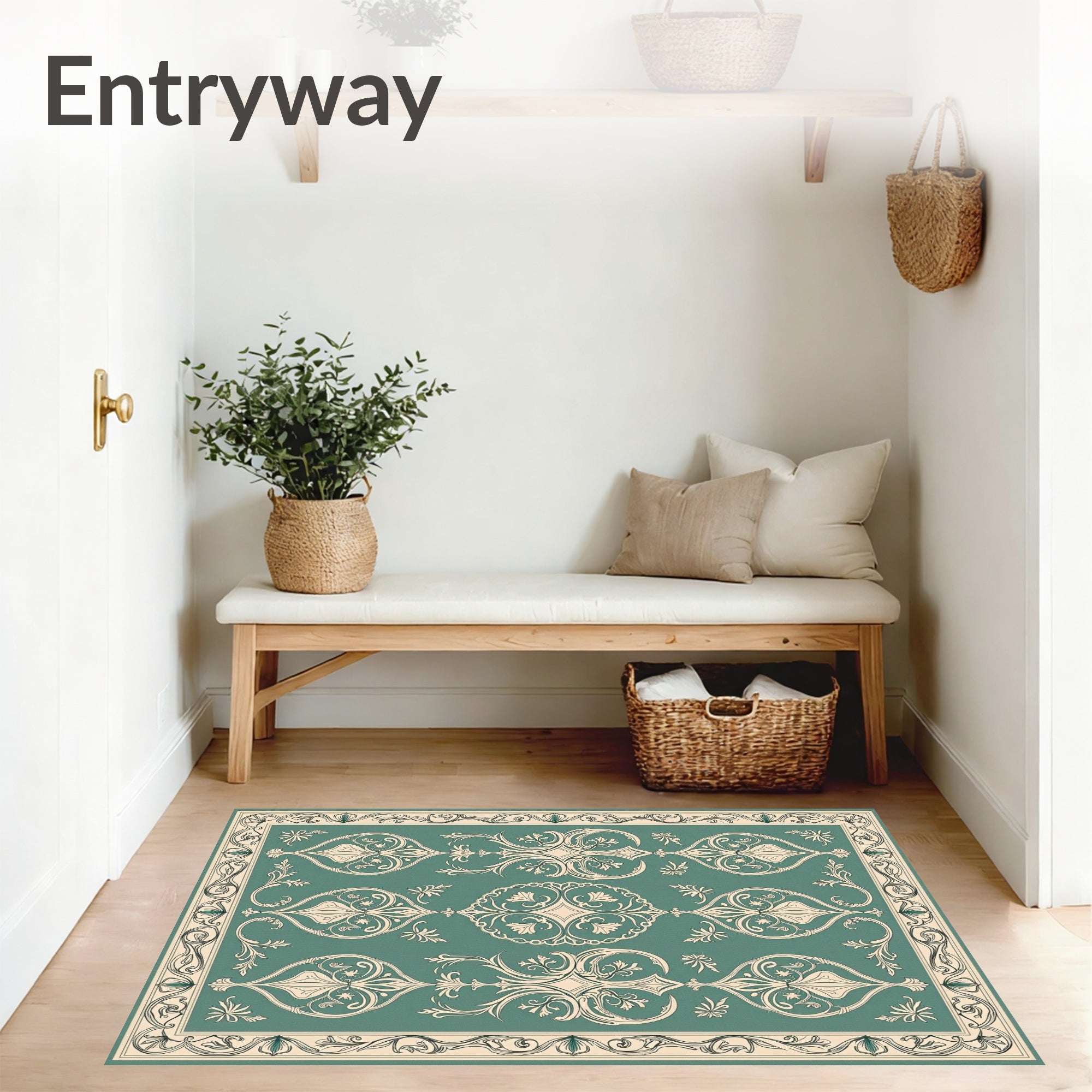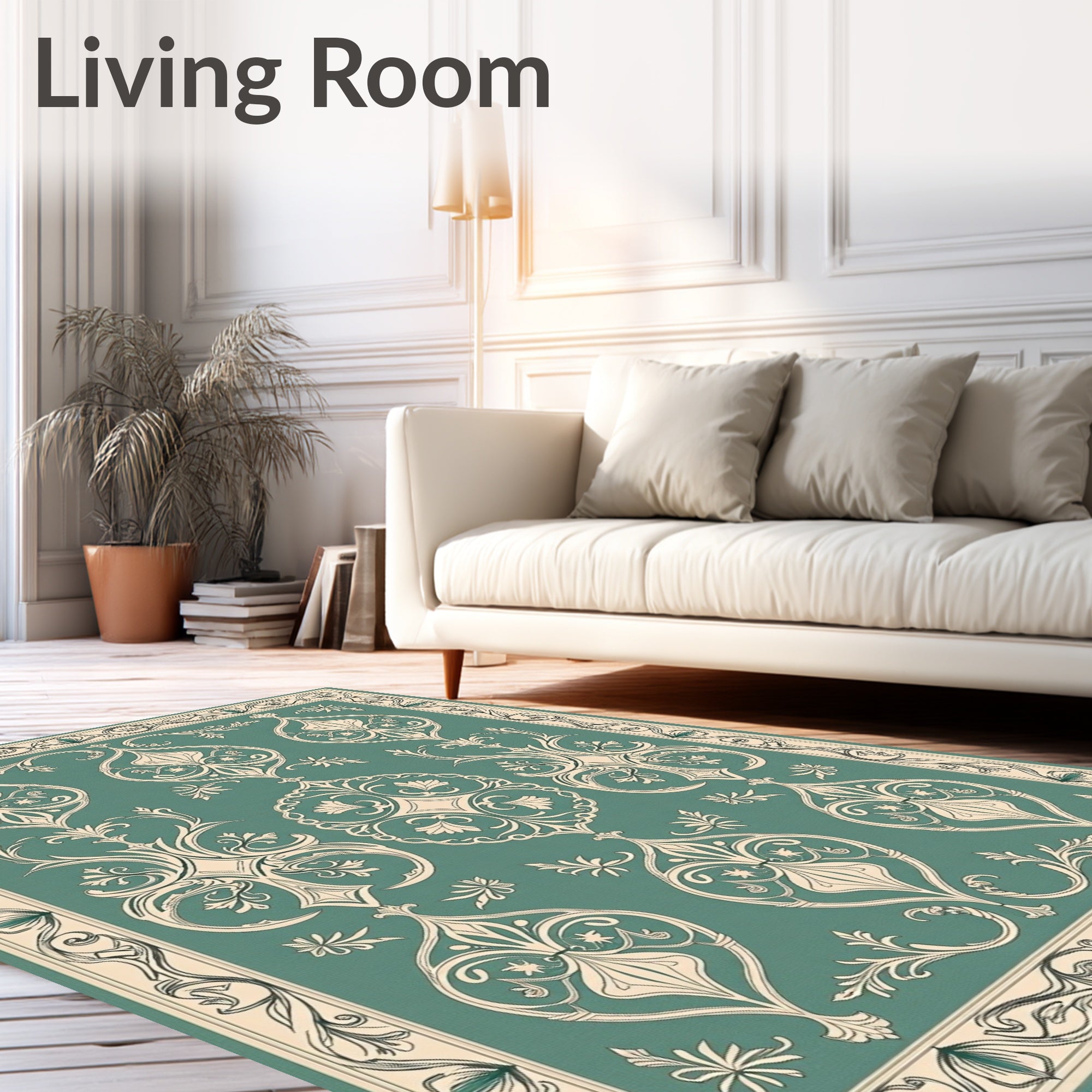 Ultra Soft Area Rug, Non Slip, Stain Resistant, Washable Area Rugs for Living Room, Bedroom, Damask Trellis with Stylized Petal Arabesque and Delicate Vines(Teal) Overview:
