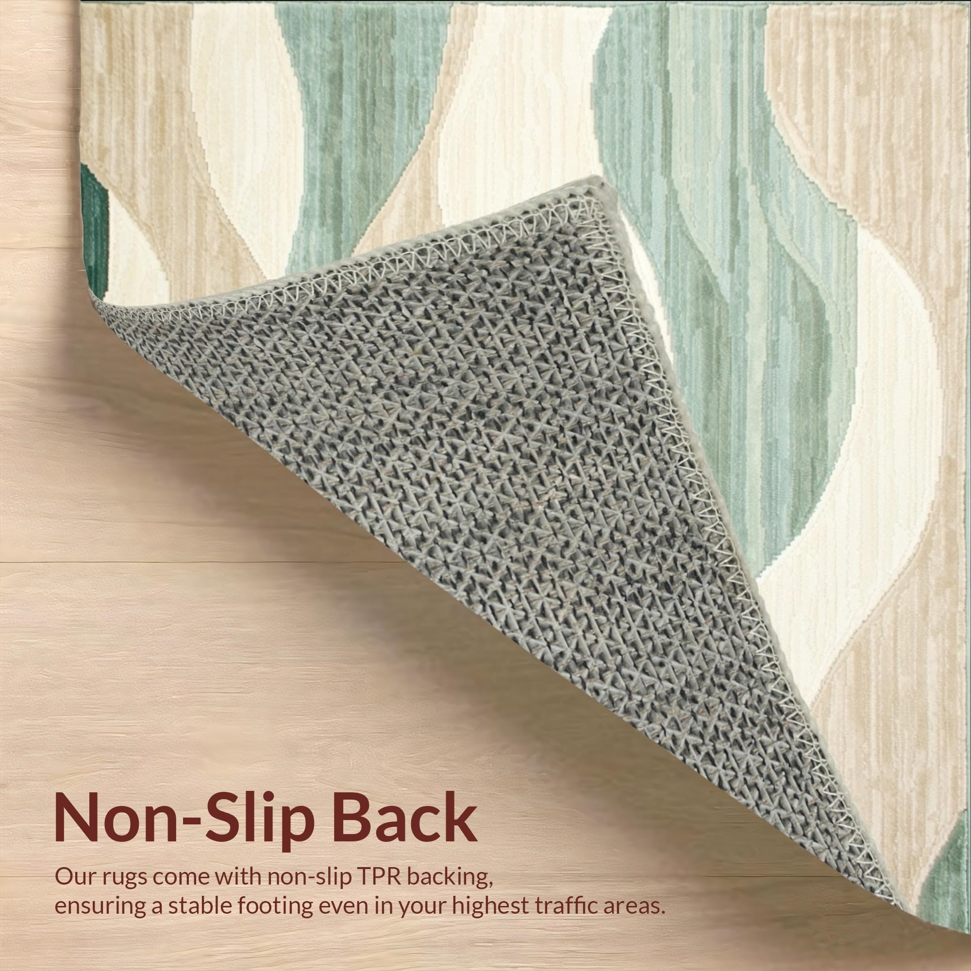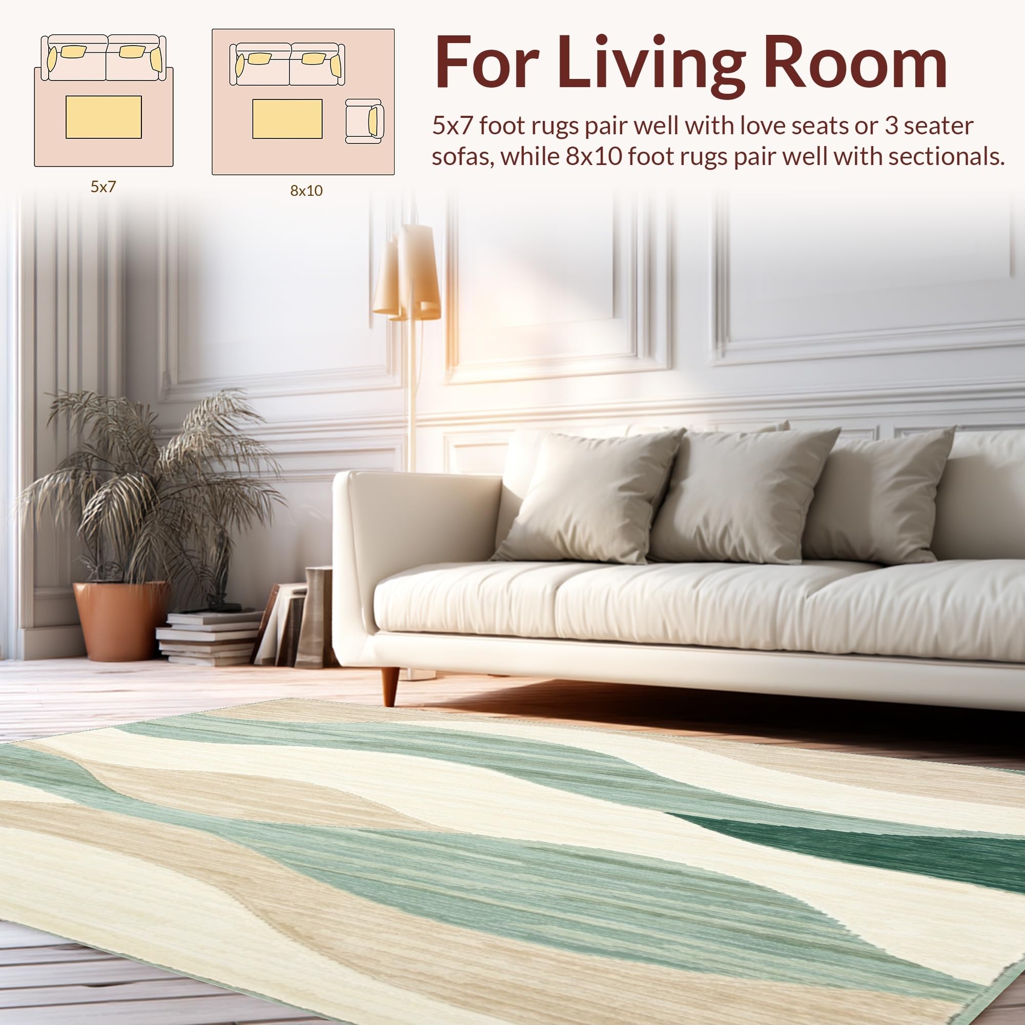 Ultra Soft Area Rug, Non Slip, Stain Resistant, Washable Area Rugs for Living Room, Bedroom, Deck Porch Abstract Wave Beige Sage Green Non Shedding Easy Clean(Beige) Overview: