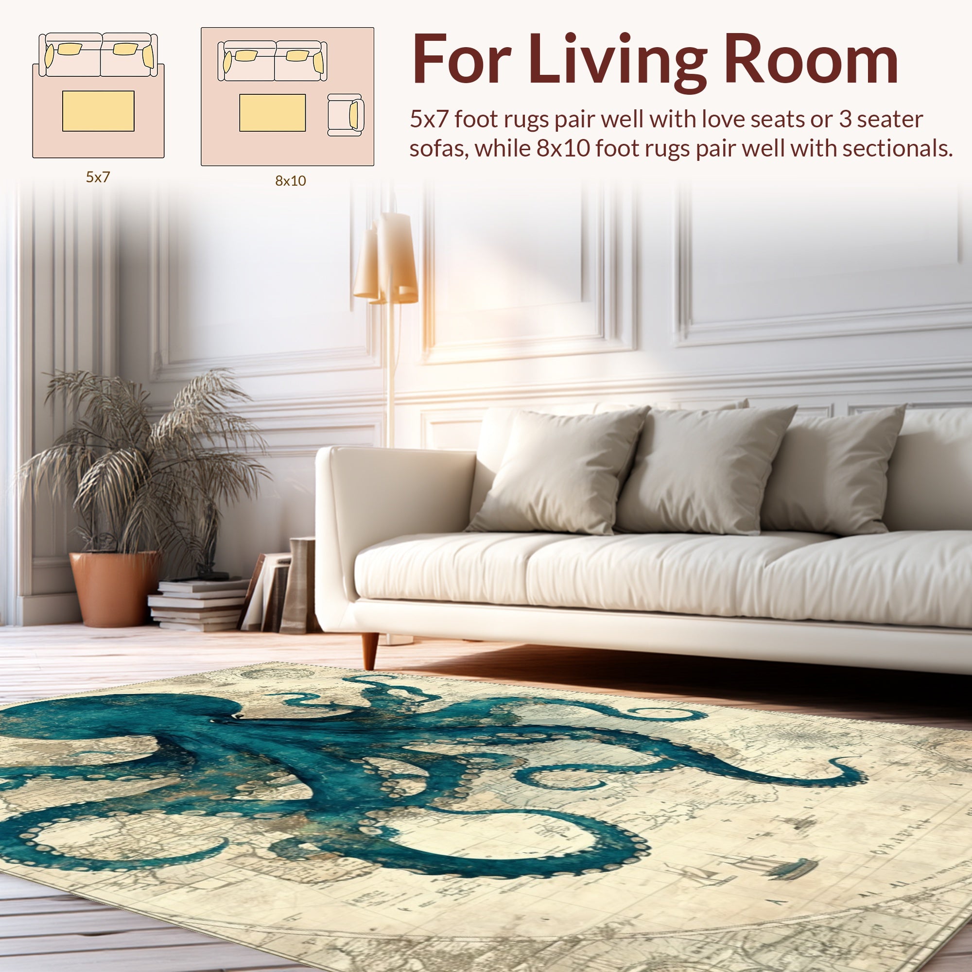 Ultra Soft Area Rug, Non Slip, Stain Resistant, Washable Area Rugs for Living Room, Bedroom, Deep Sea Creature Round Rug With Tentacle Design Nautical Chart Pattern(Blue) Overview: