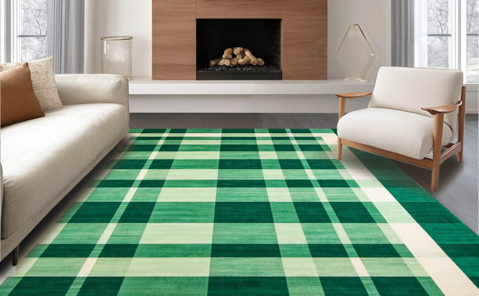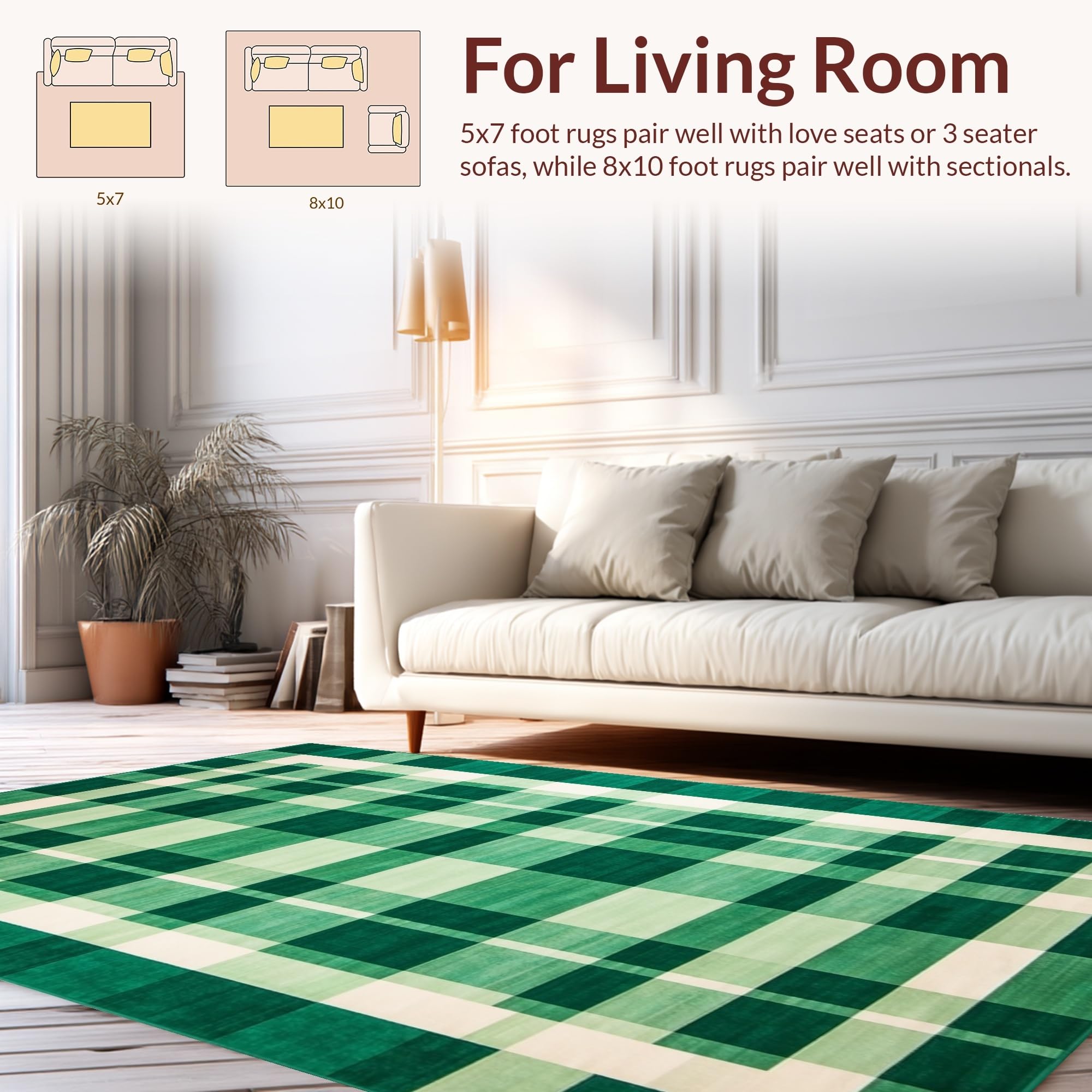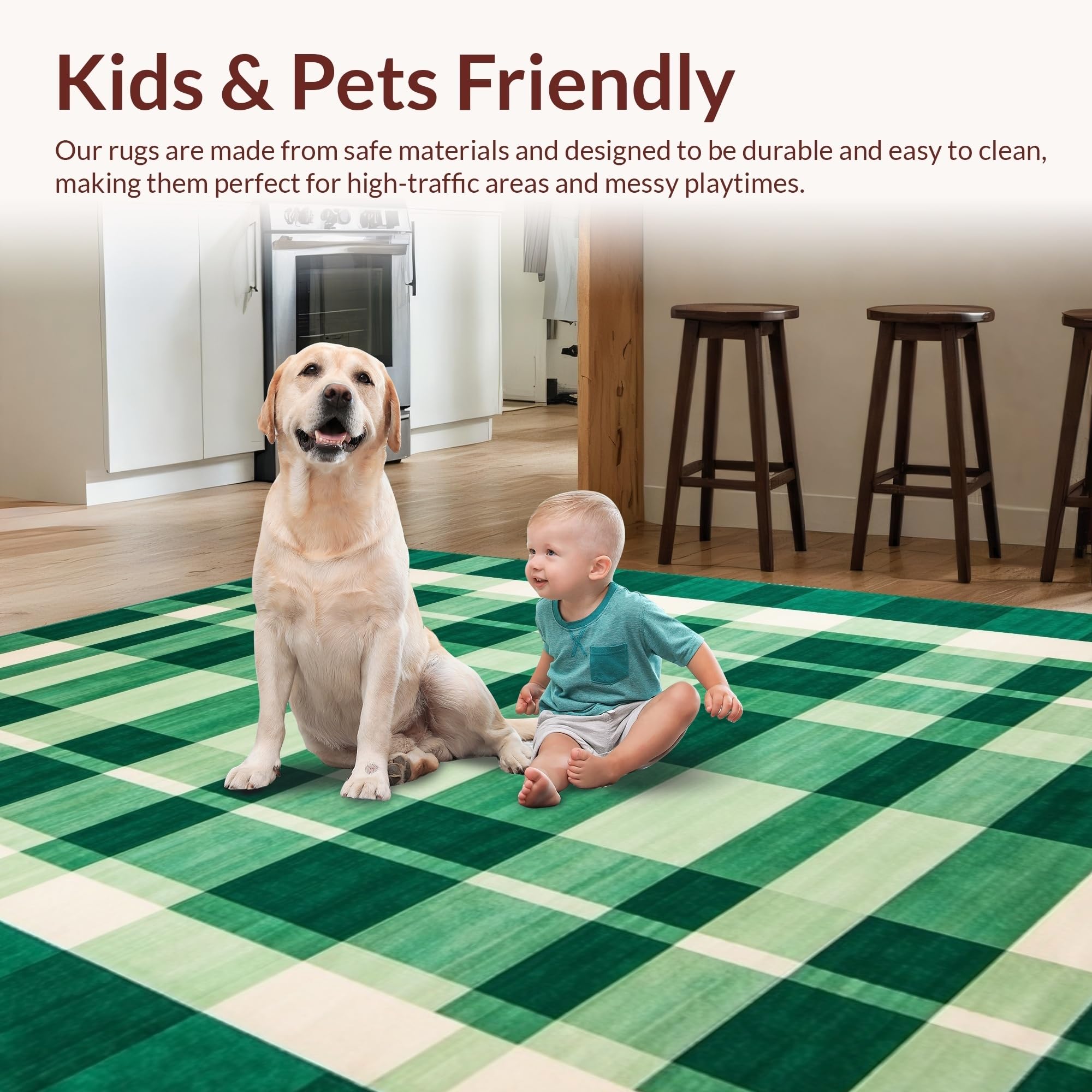 Ultra Soft Area Rug, Non Slip, Stain Resistant, Washable Area Rugs for Living Room, Bedroom, Delicate Ivory and Green Grid Layout(Green) Overview: