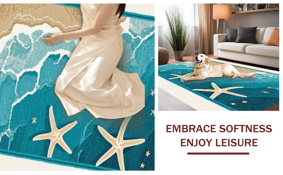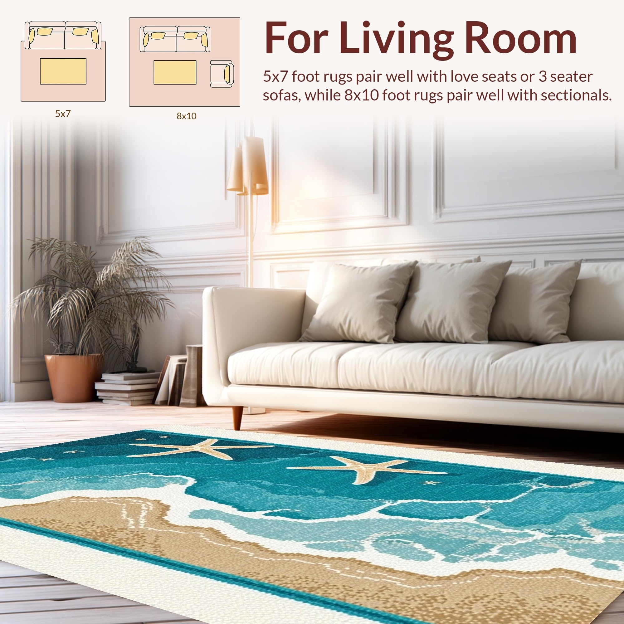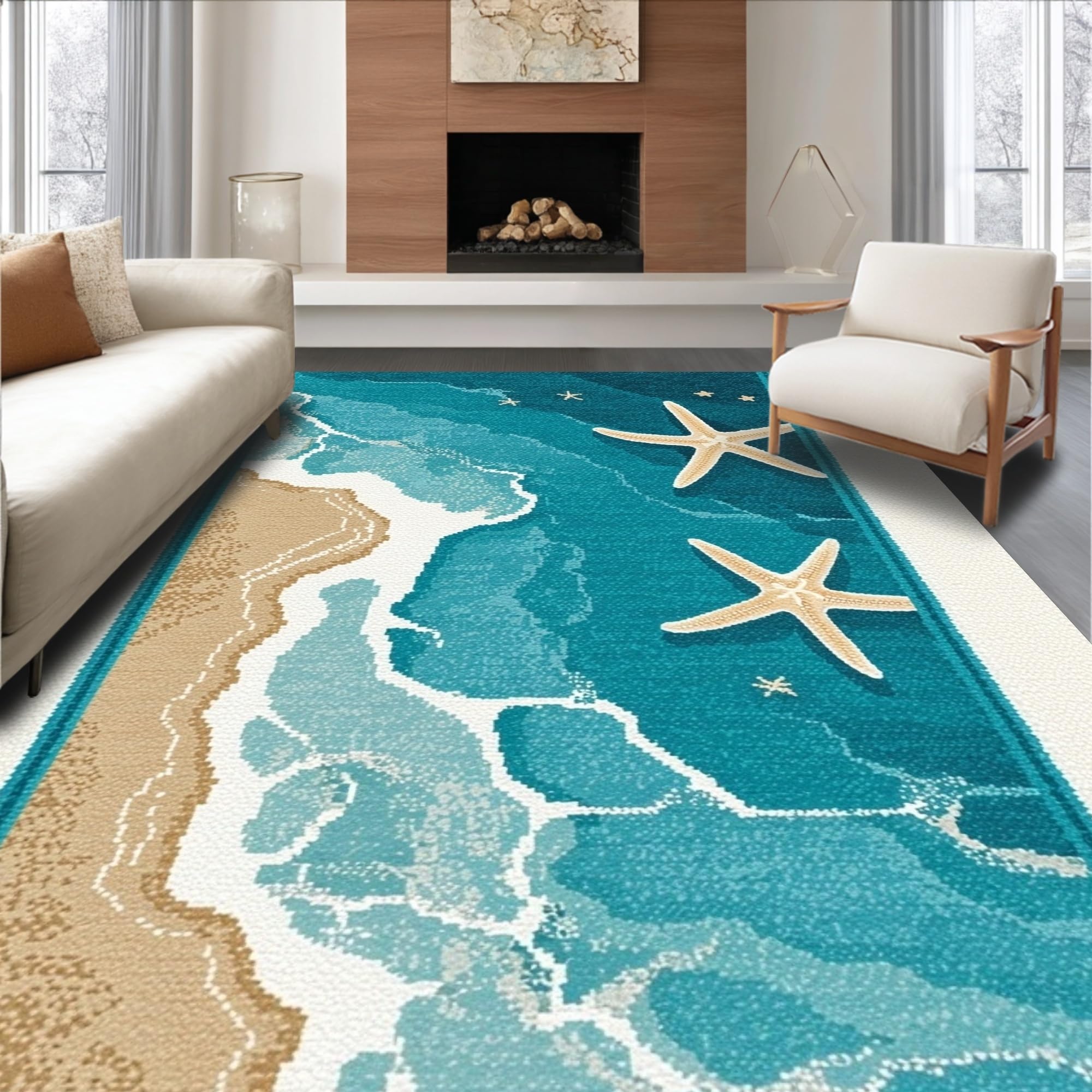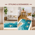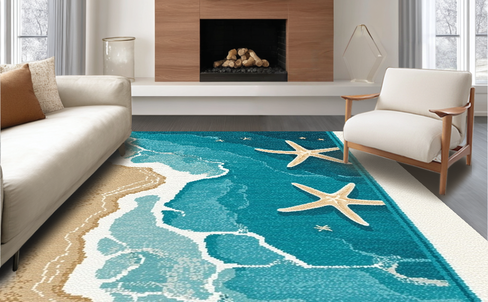 Ultra Soft Area Rug, Non Slip, Stain Resistant, Washable Area Rugs for Living Room, Bedroom, Delicate Shells and Starfish Arrangement(Blue) Overview: