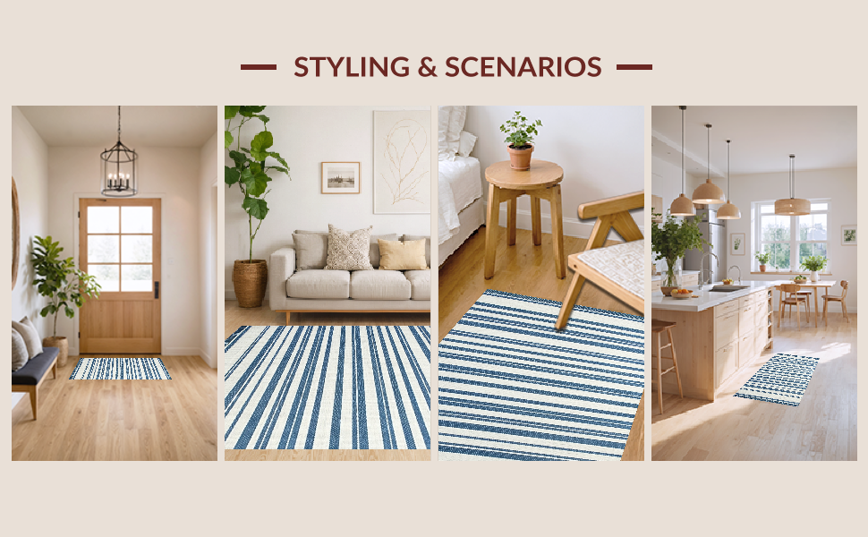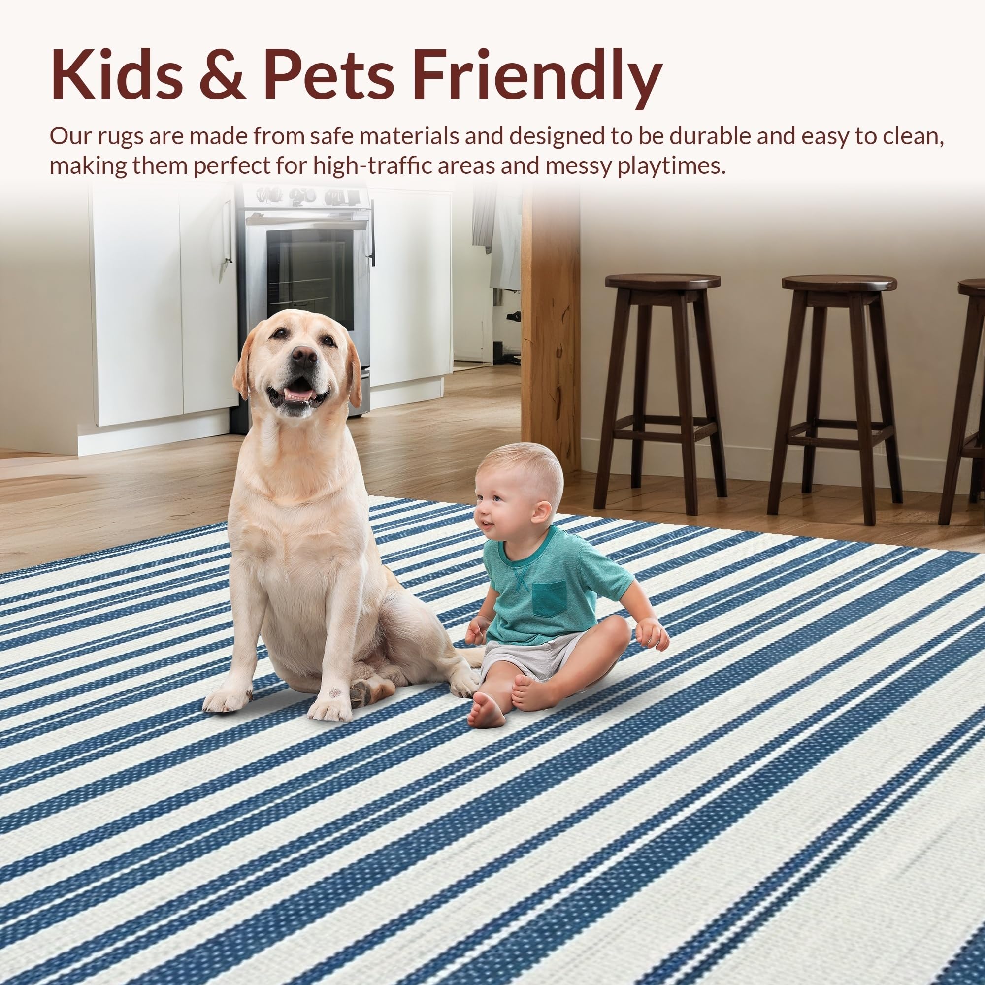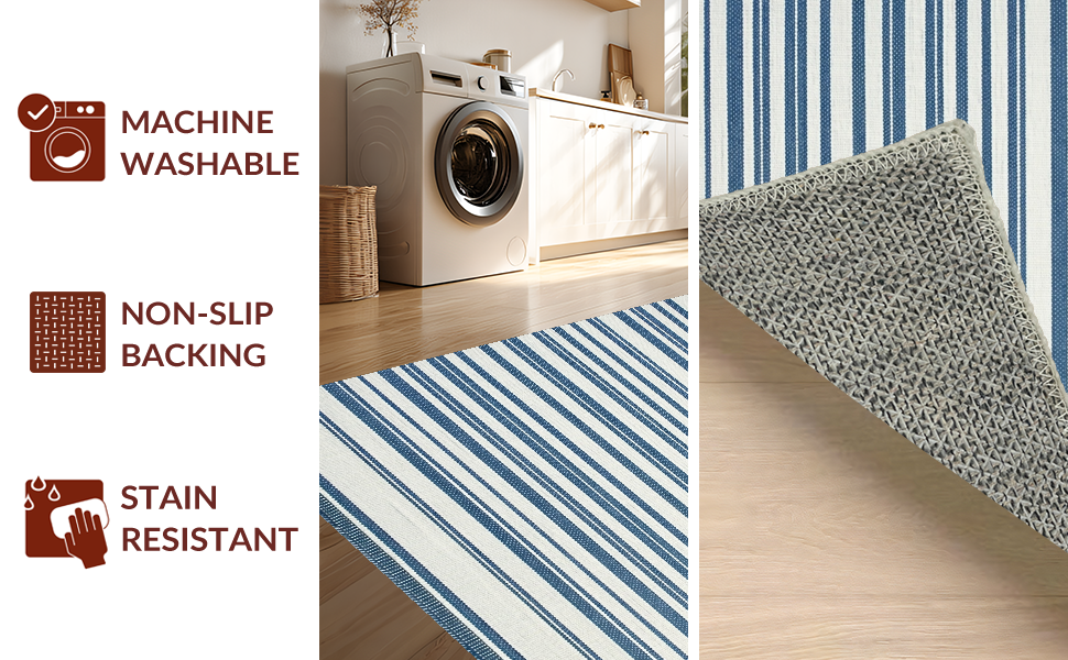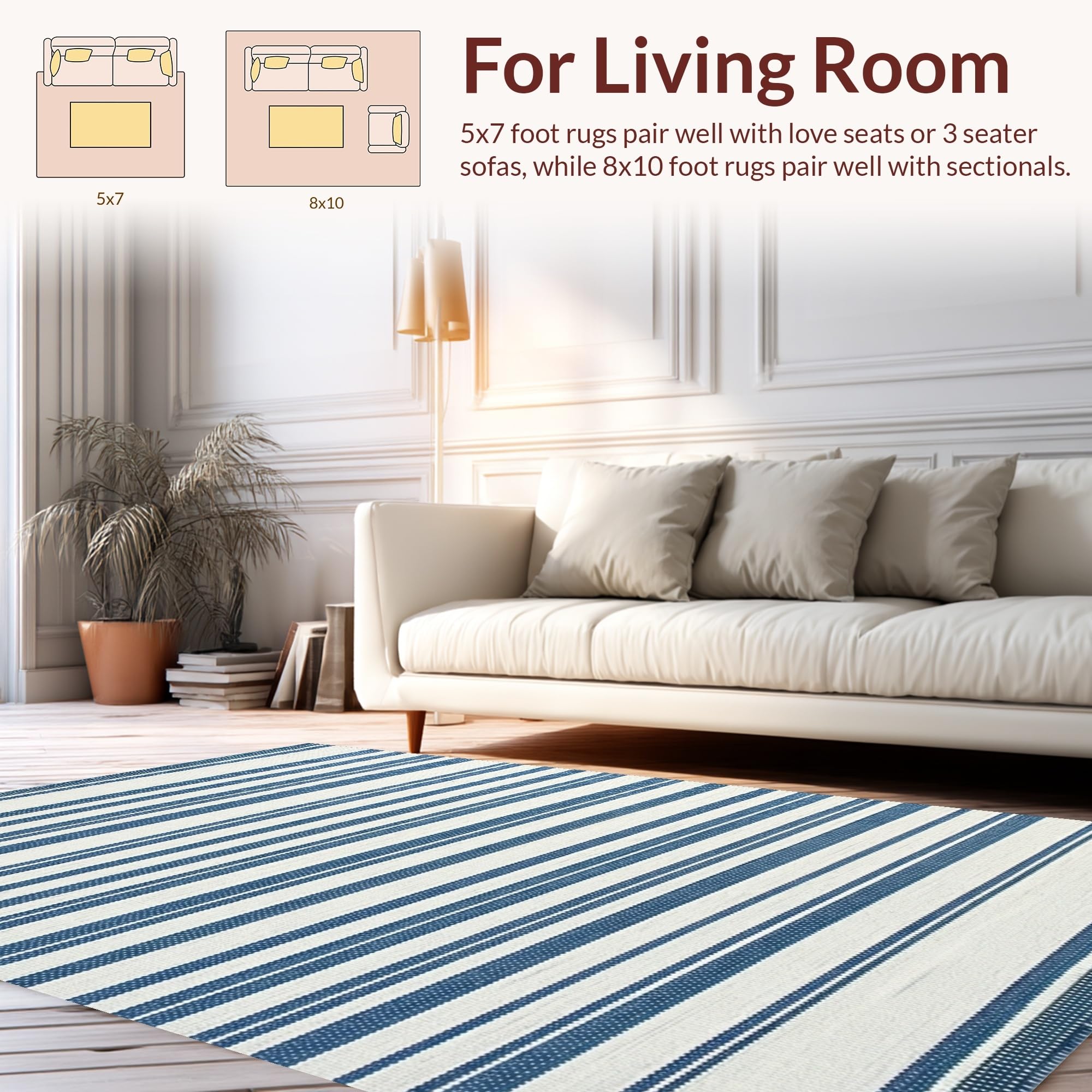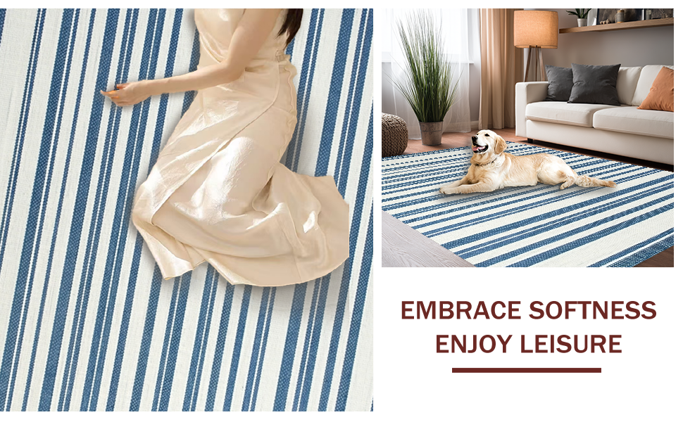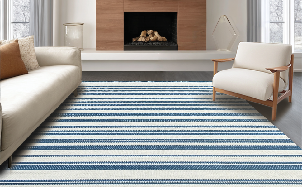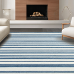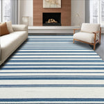 Ultra Soft Area Rug, Non Slip, Stain Resistant, Washable Area Rugs for Living Room, Bedroom, Delicate Textured Ivory Stripe Motif(Blue) Overview: