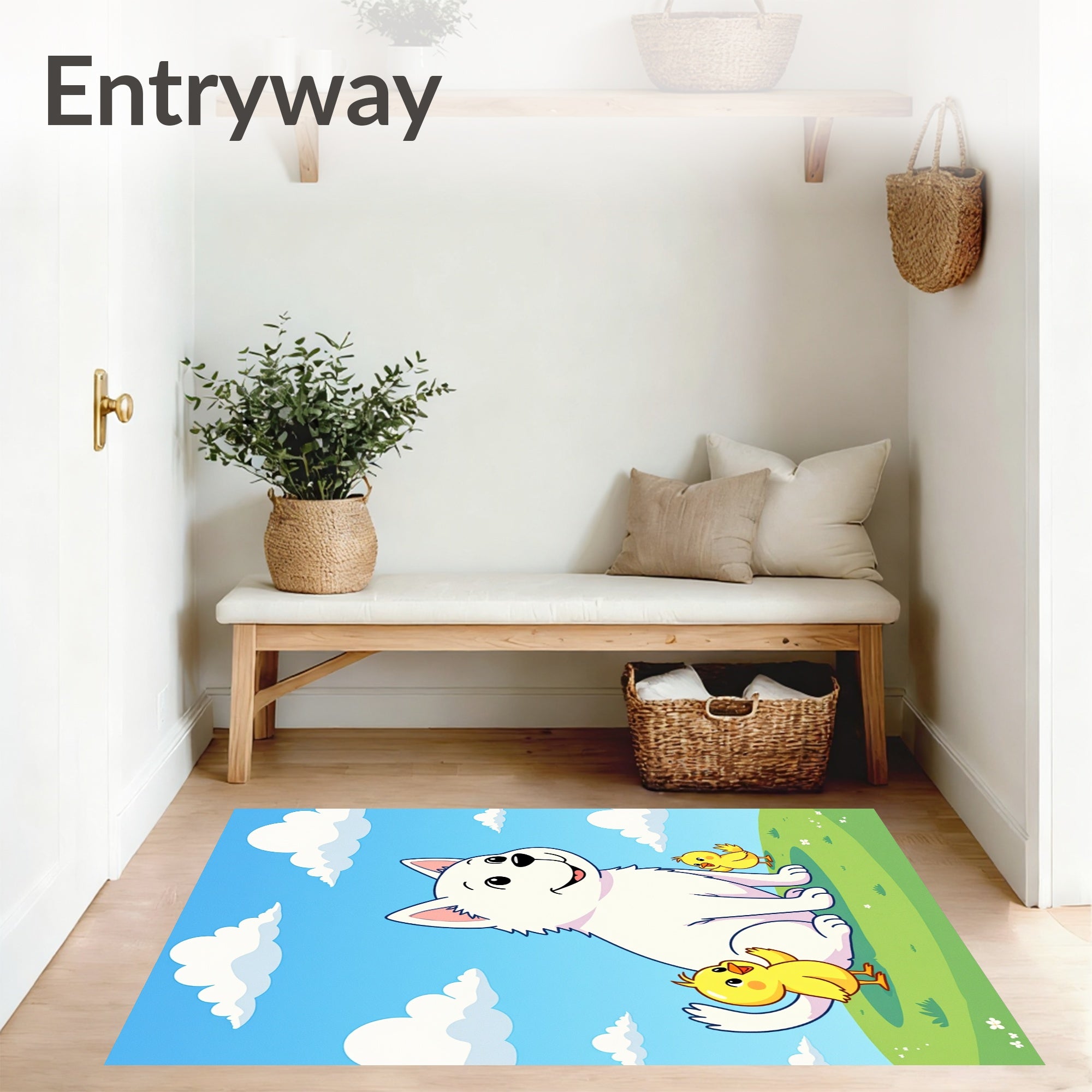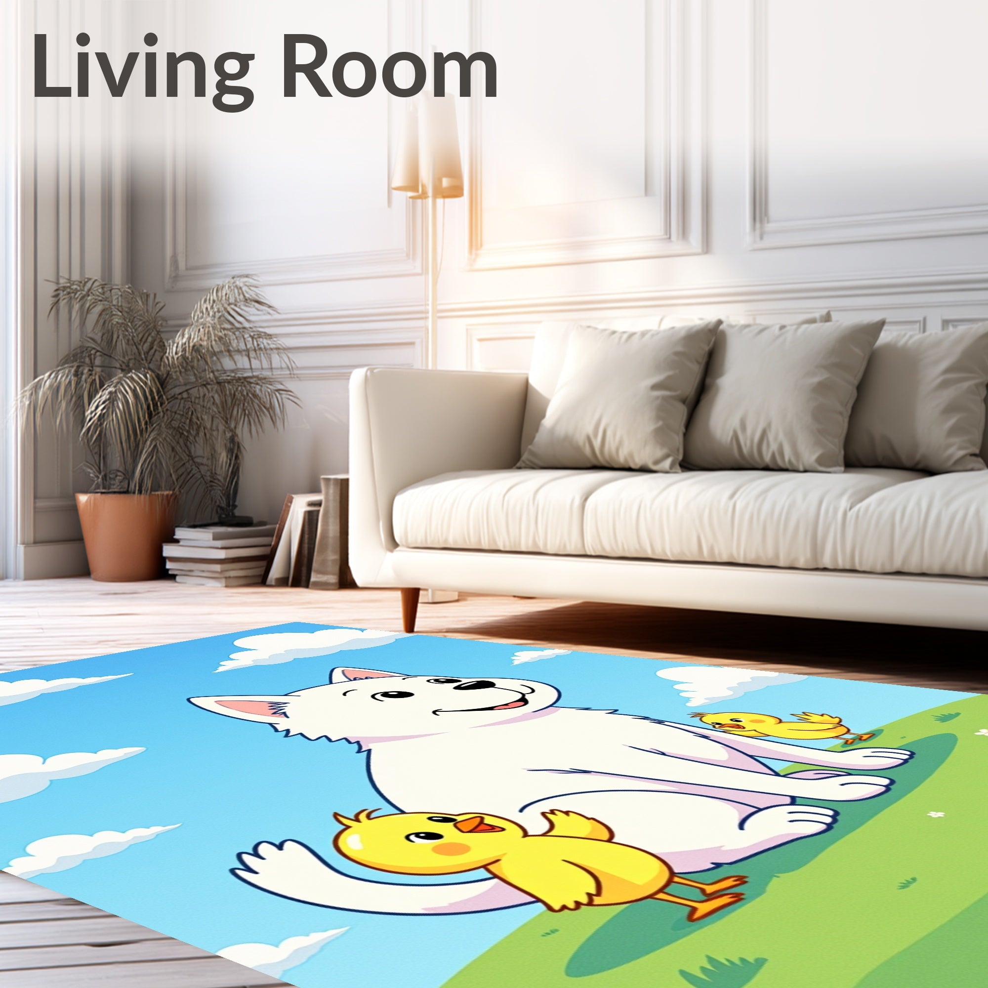 Flatwoven High Traffic Area Rug, Delightful Animal Companion Welcome with Heartwarming Friendship Theme, Non Slip, Stain Resistant, Washable Area Rugs for Living Room, Bedroom (White) Overview: