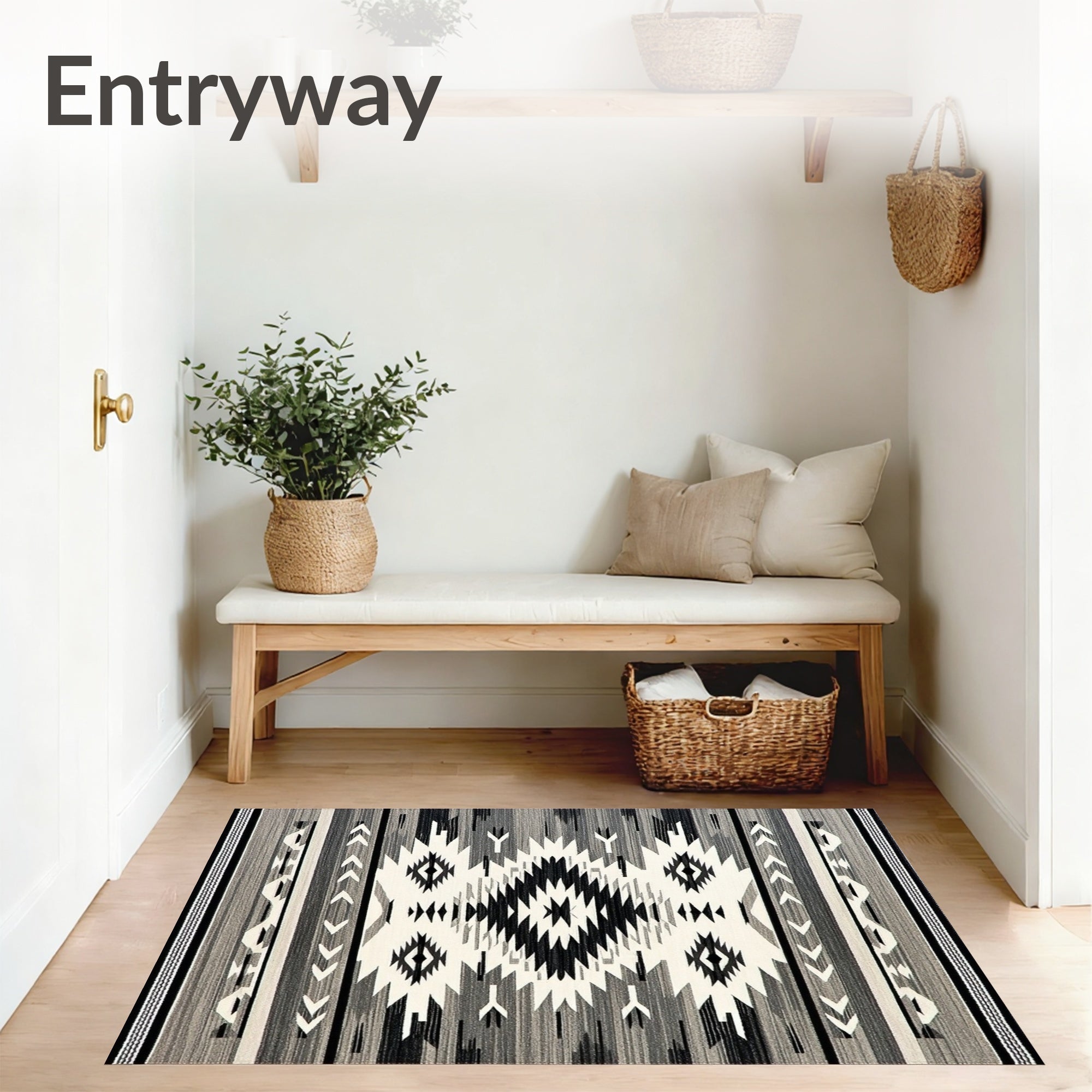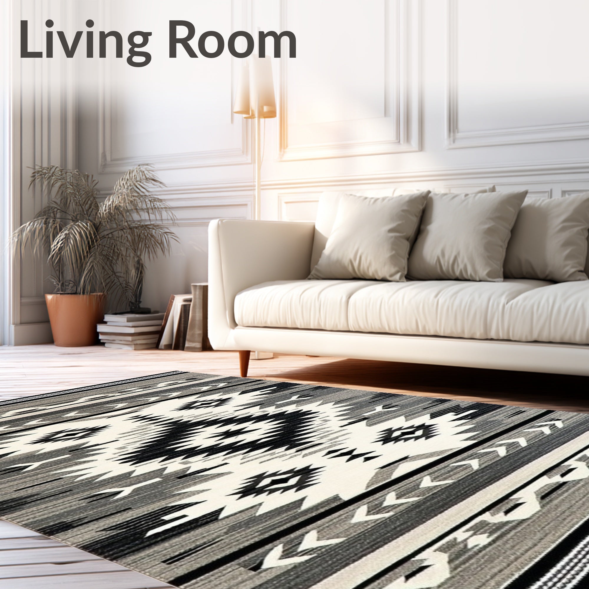 Ultra Soft Area Rug, Non Slip, Stain Resistant, Washable Area Rugs for Living Room, Bedroom, Desert Shadow Native Inspired Geometric Area With Tribal Accents(Black) Overview: