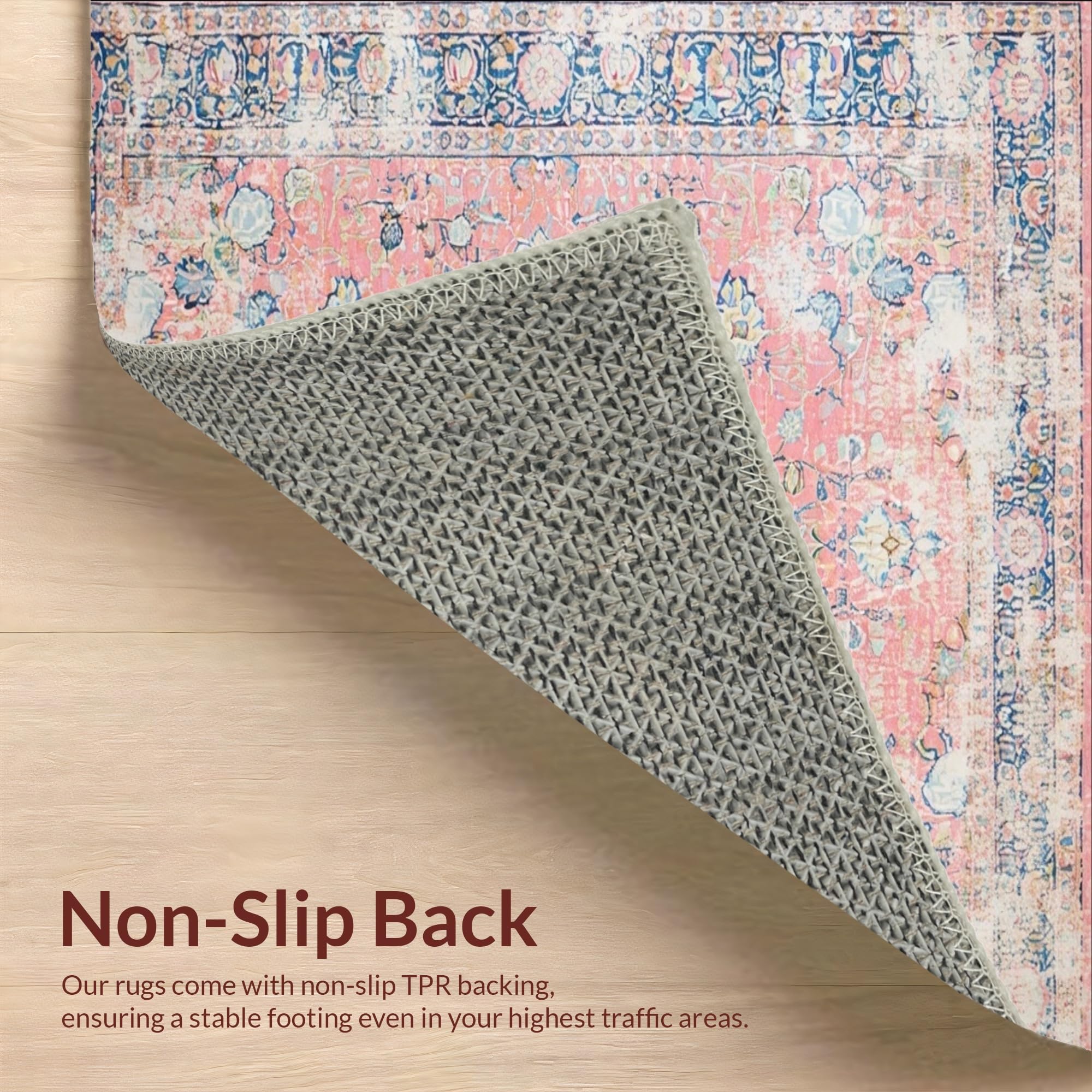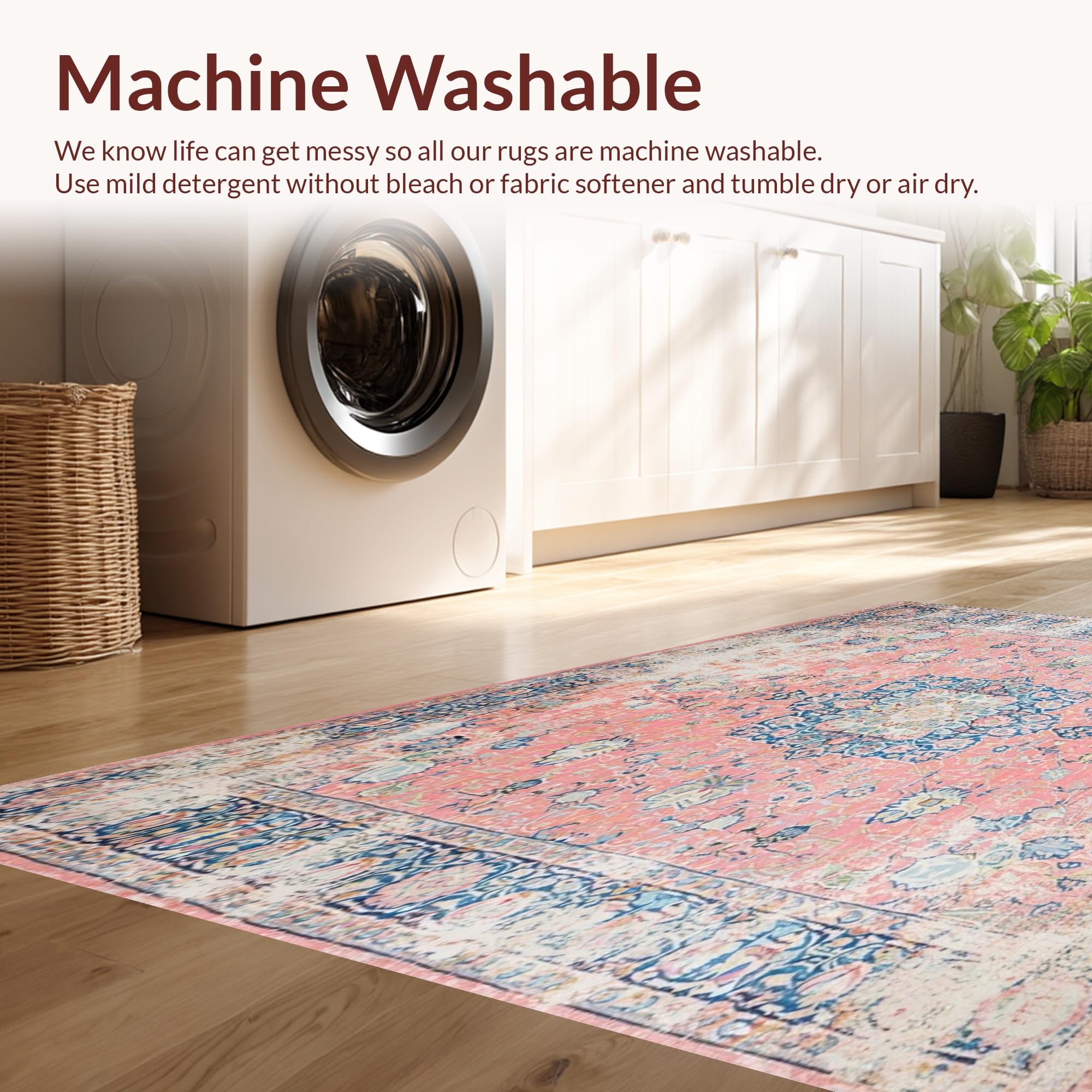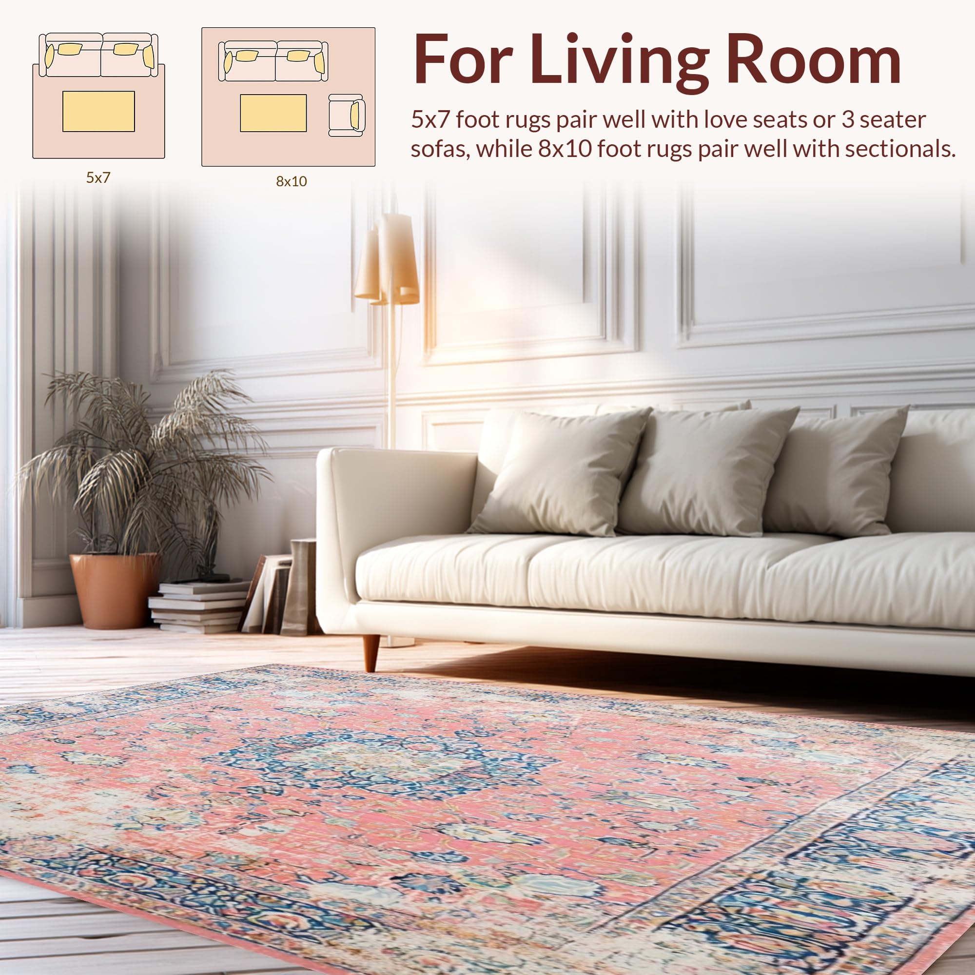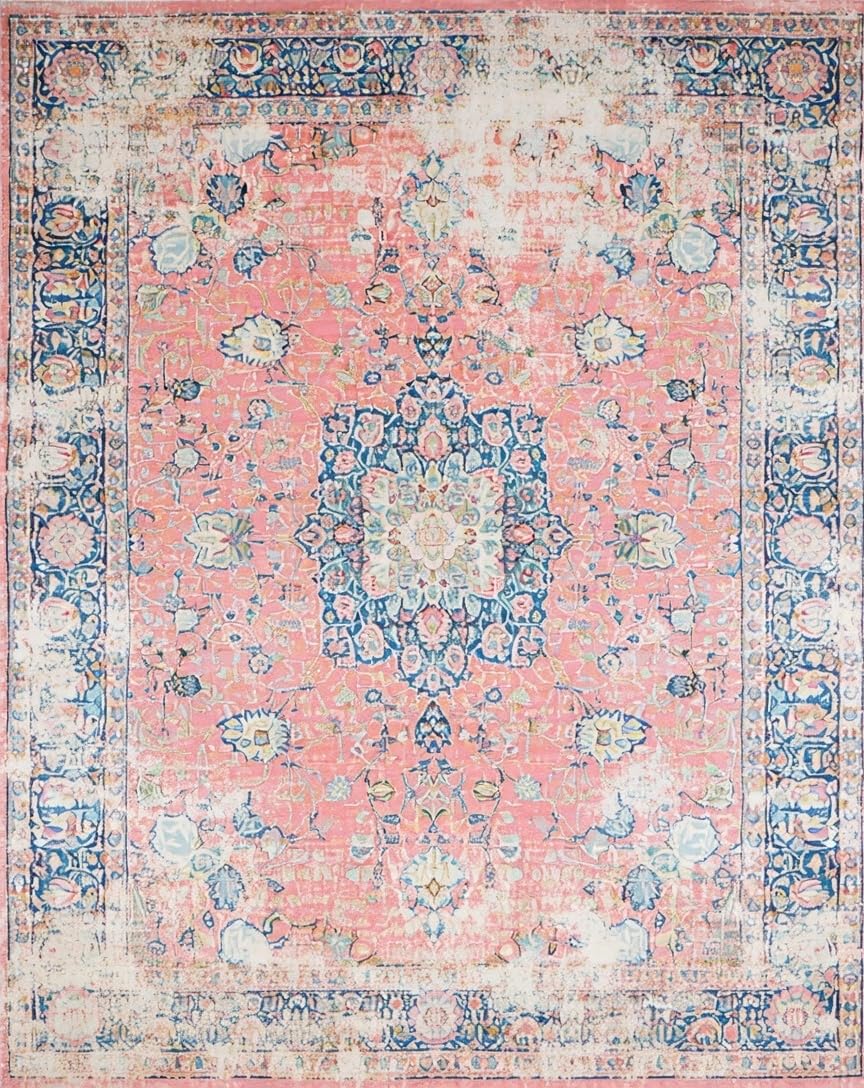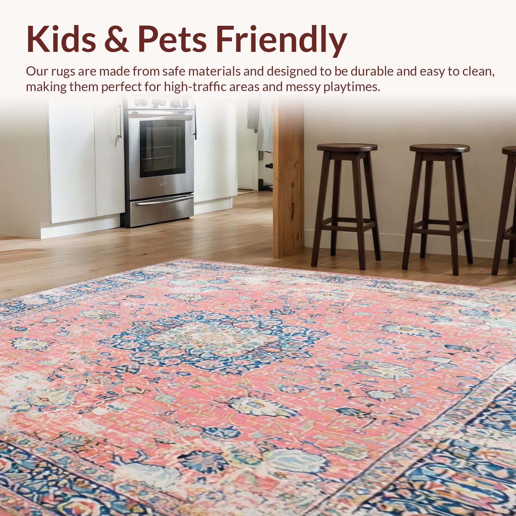 Ultra Soft Area Rug, Non Slip, Stain Resistant, Washable Area Rugs for Living Room, Bedroom, Distressed Floral Medallion Area Rug with Vintage Fade and Pastel Tones(Pink) Overview: