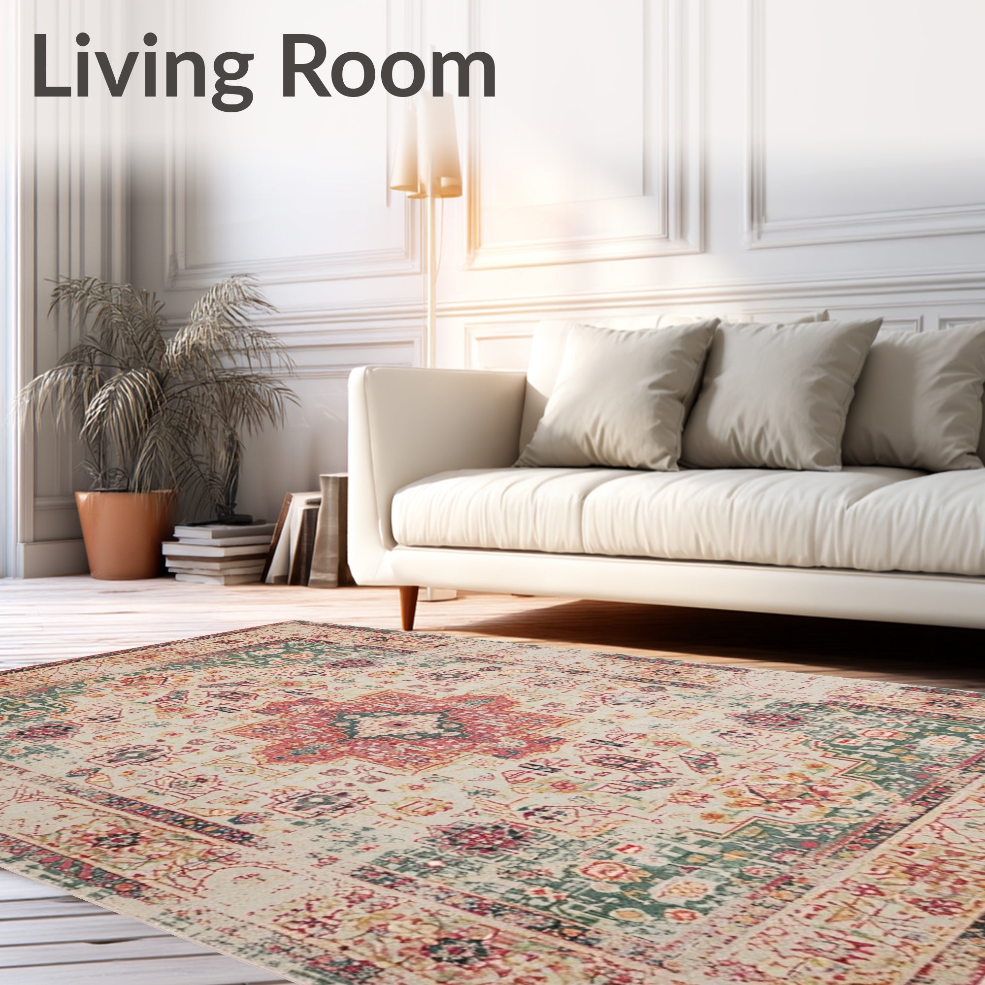 Ultra Soft Area Rug, Non Slip, Stain Resistant, Washable Area Rugs for Living Room, Bedroom, Distressed Global Area Easy Clean Printed Design(Ivory) Overview: