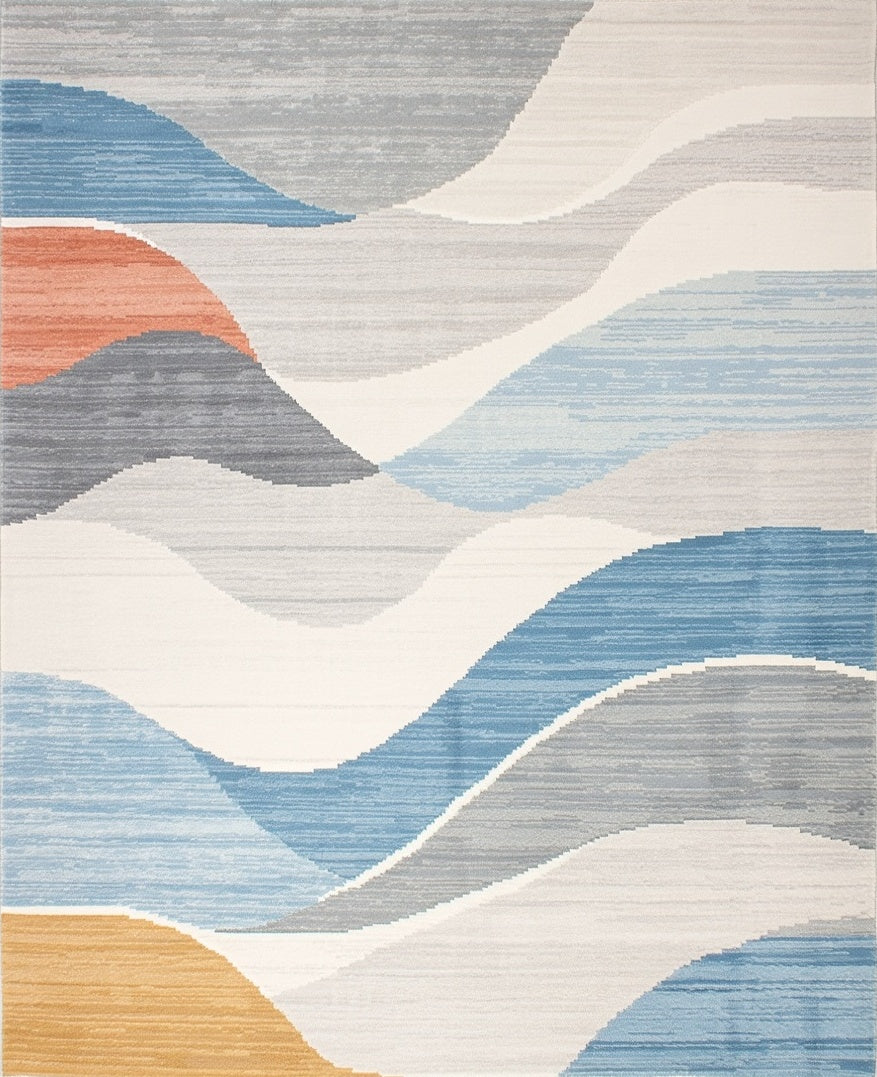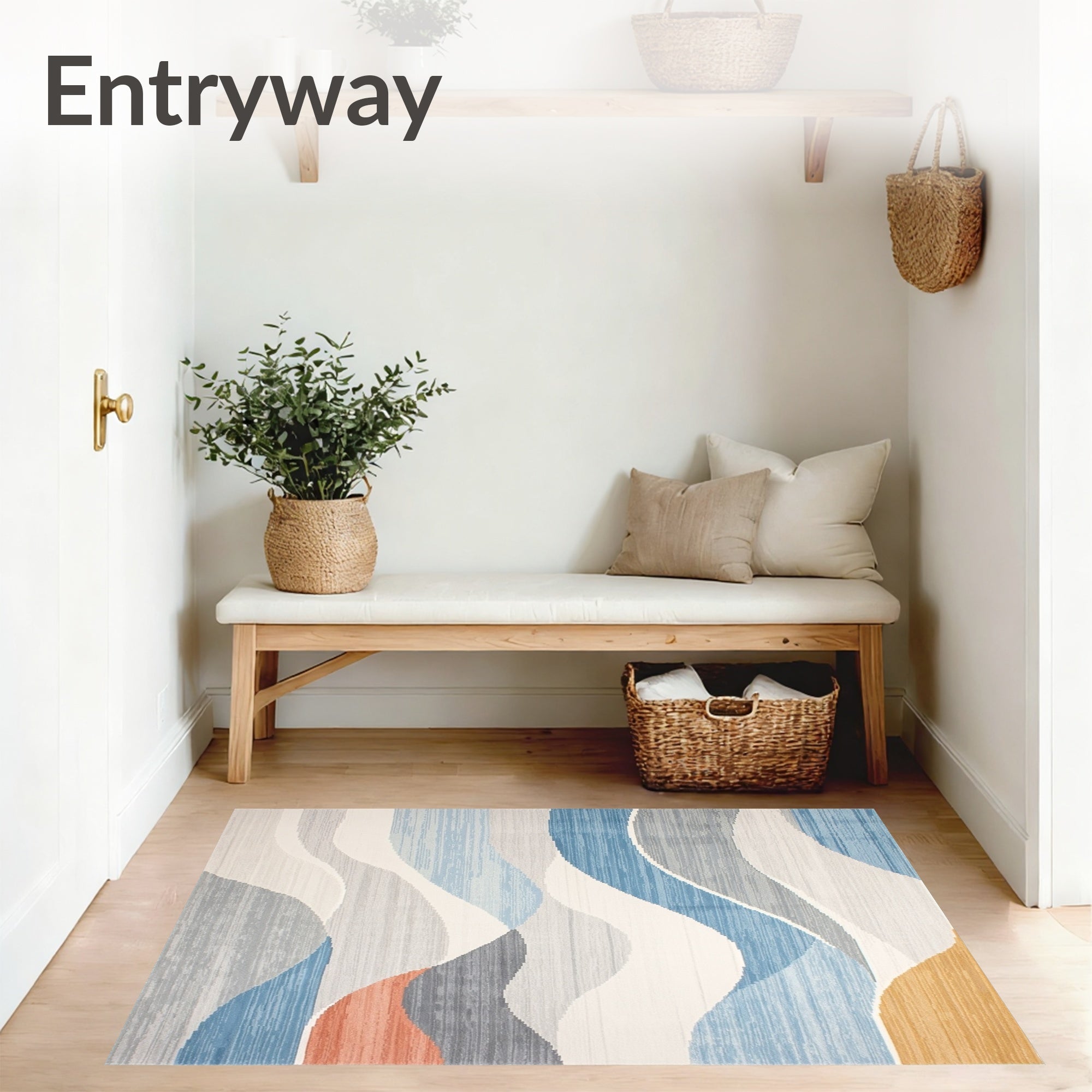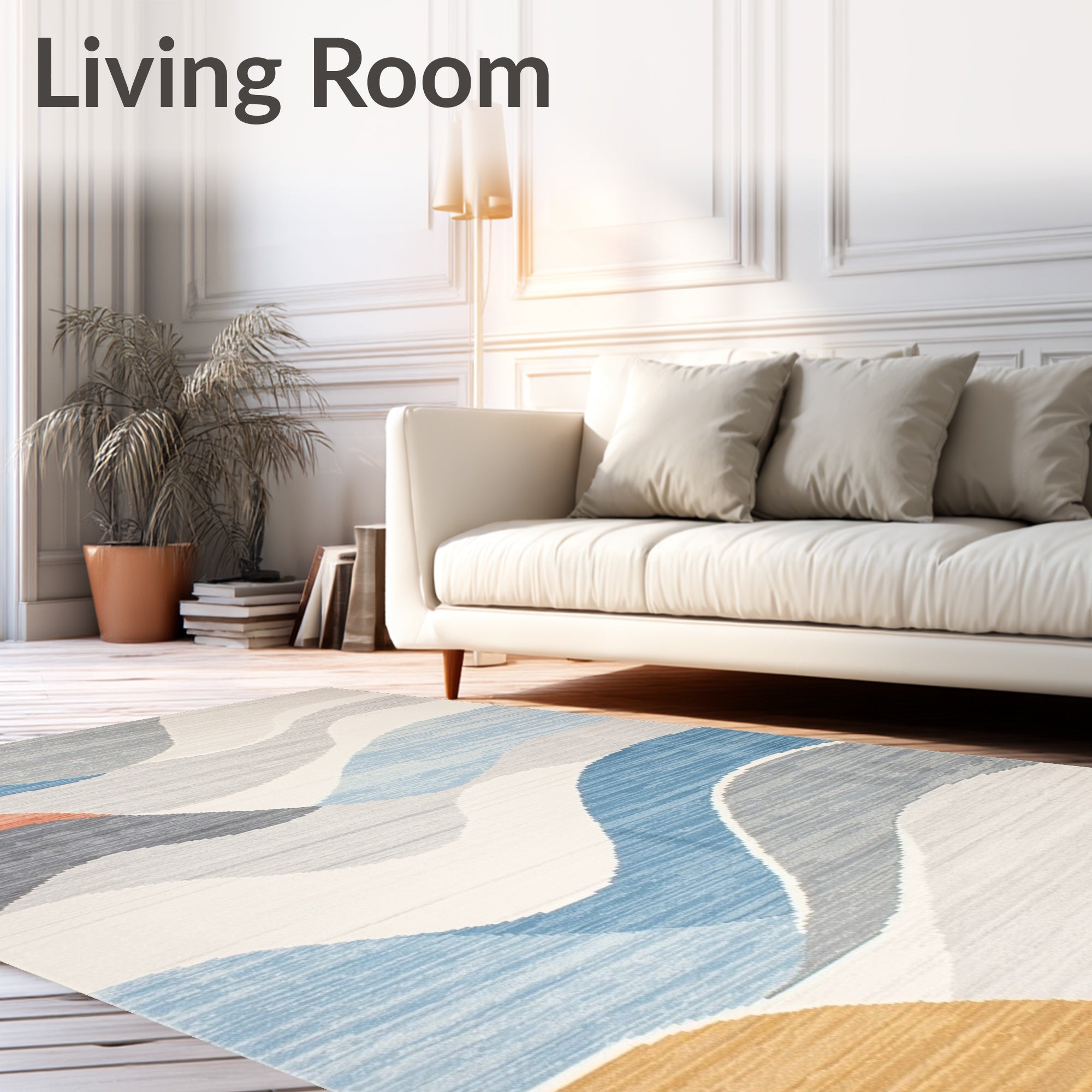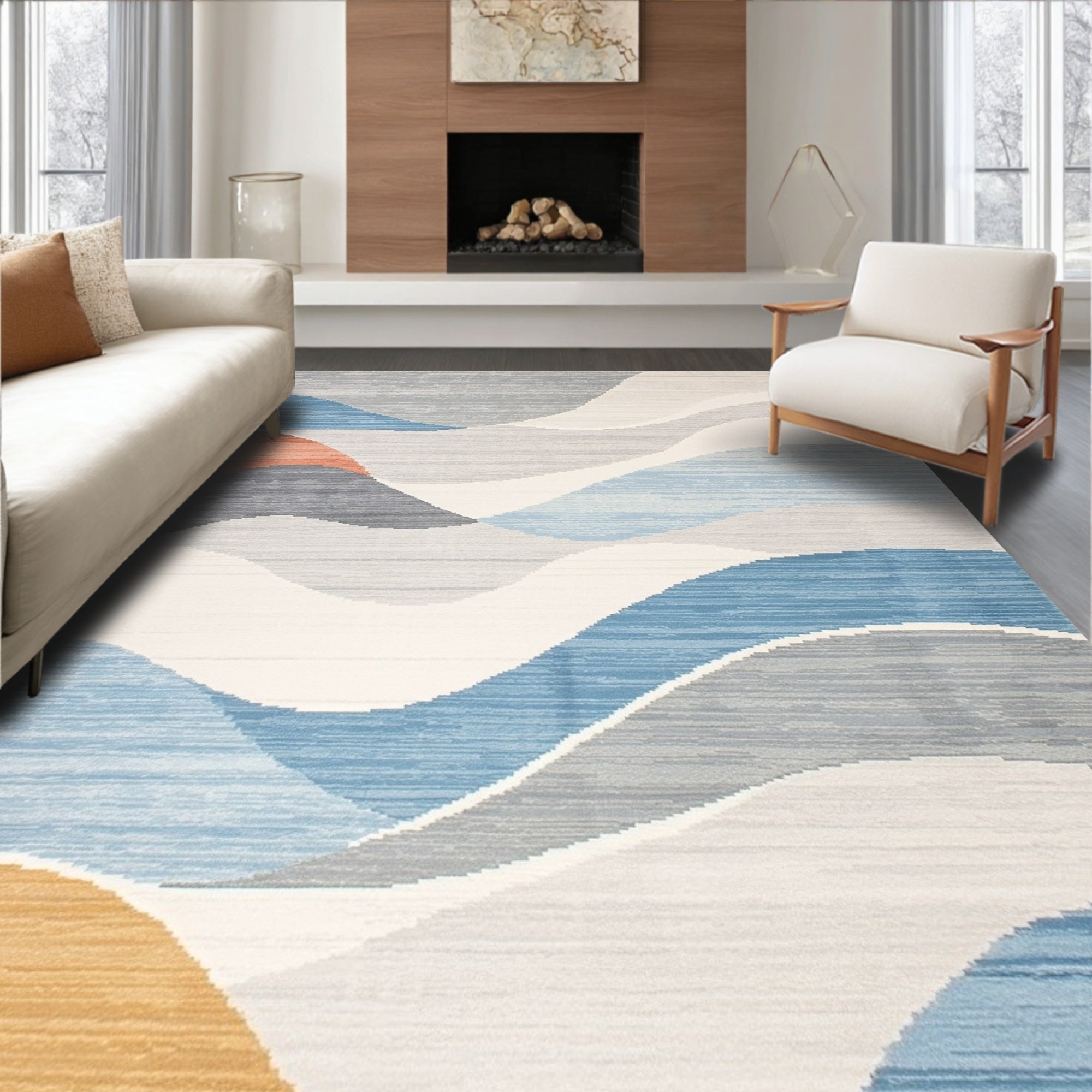 Ultra Soft Area Rug, Non Slip, Stain Resistant, Washable Area Rugs for Living Room, Bedroom, Dynamic Curved Stripes Combining Light Gray Blue and Warm Beige Tones(Gray) Overview: