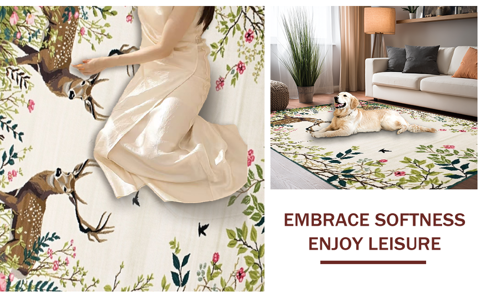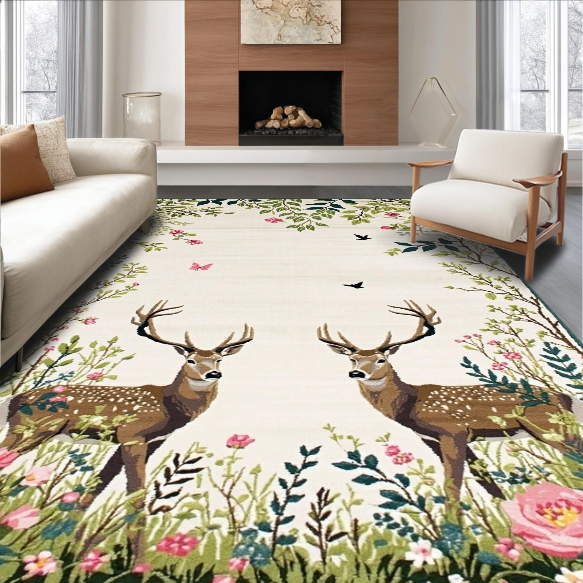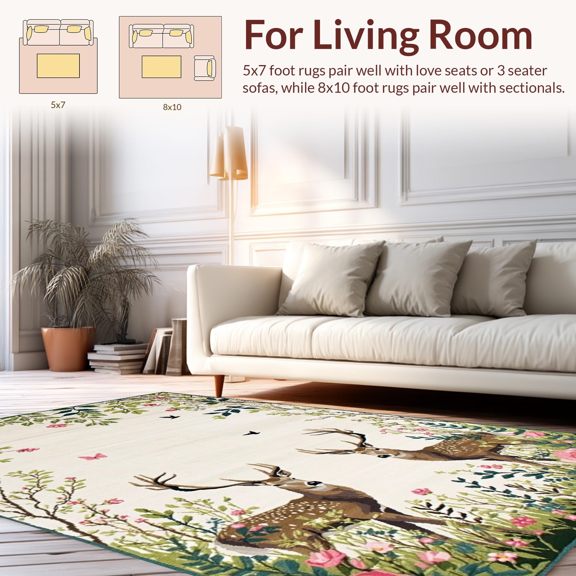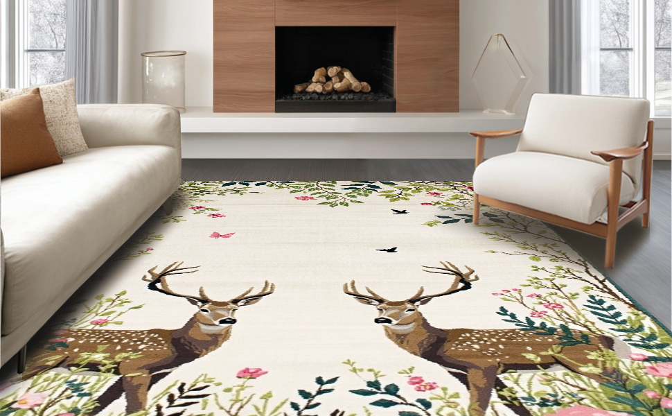 Ultra Soft Area Rug, Non Slip, Stain Resistant, Washable Area Rugs for Living Room, Bedroom, Dynamic Deer Print Fusion(Beige) Overview: