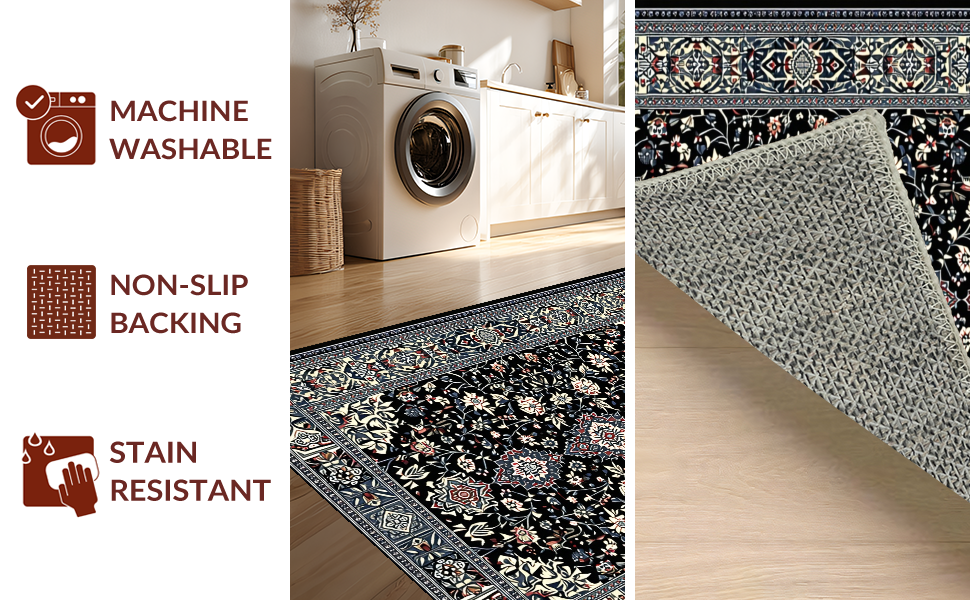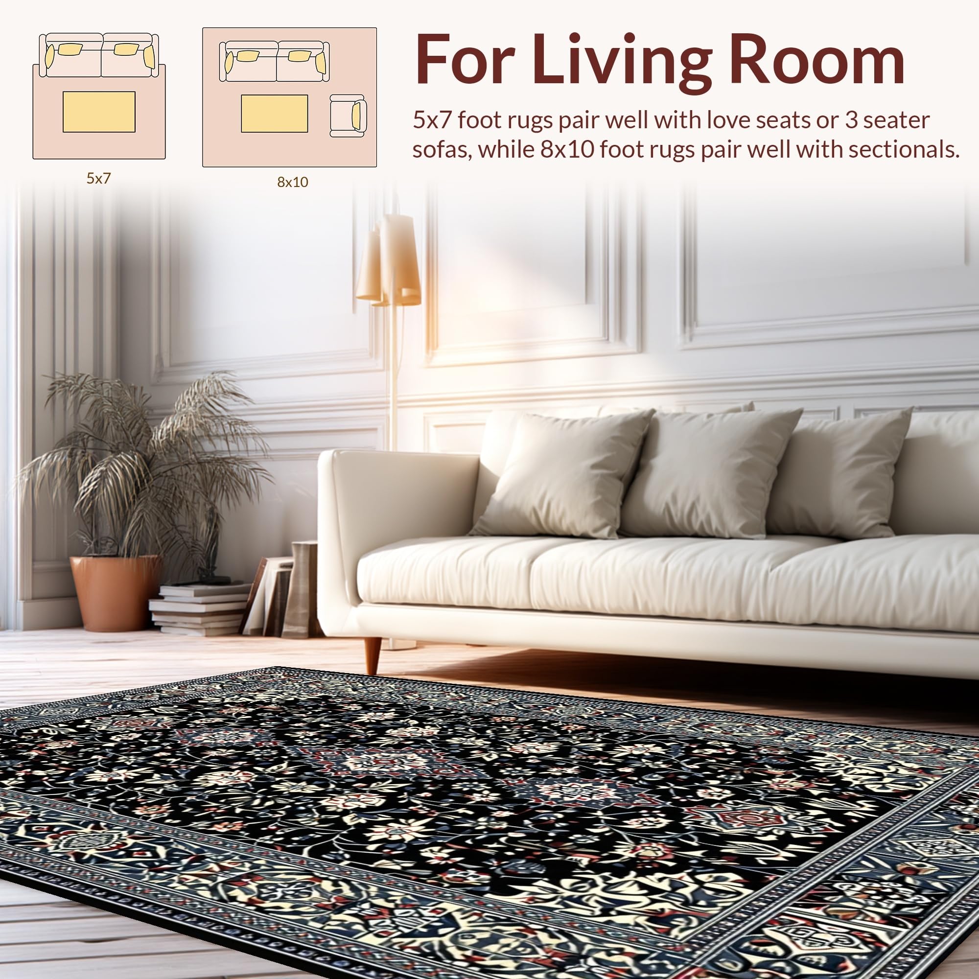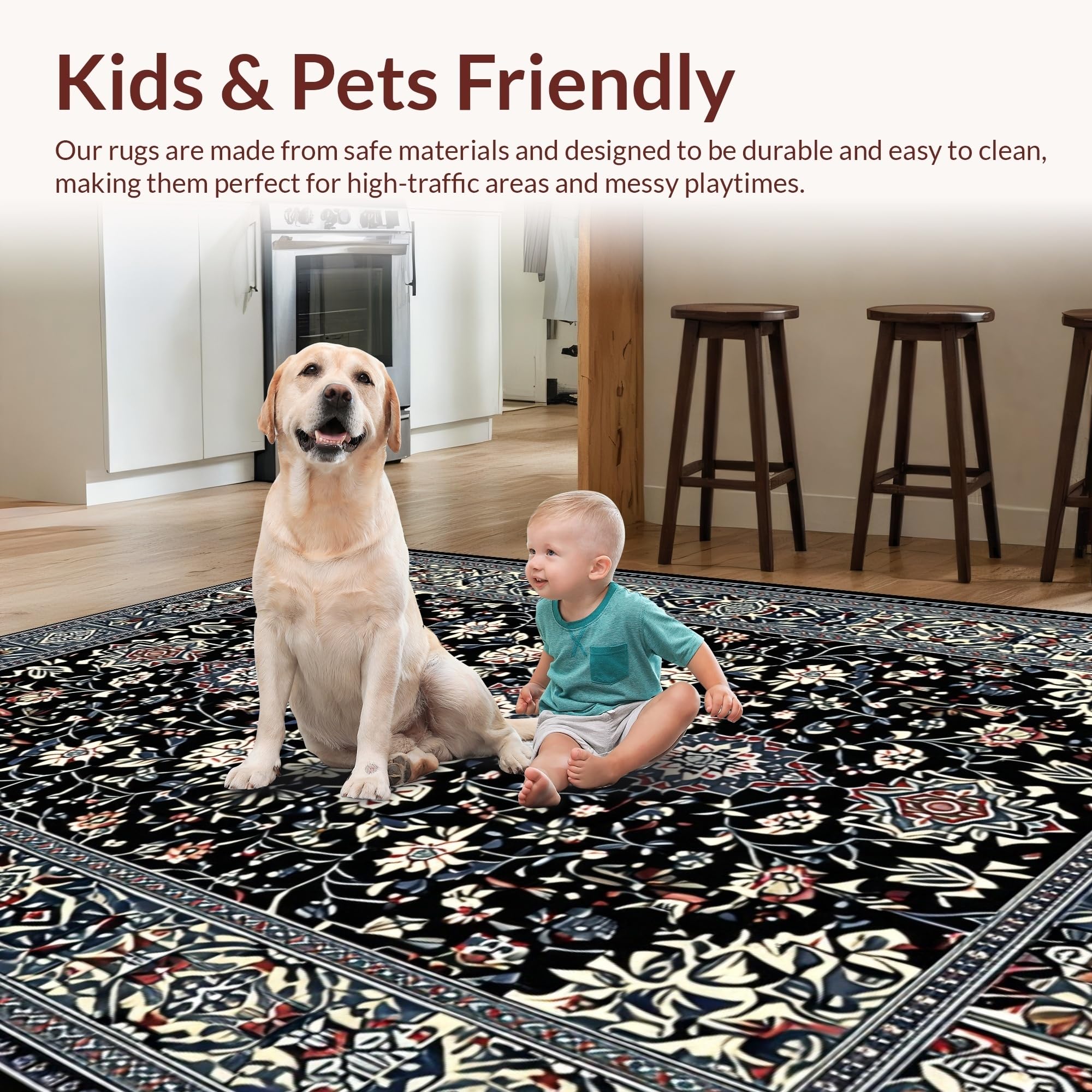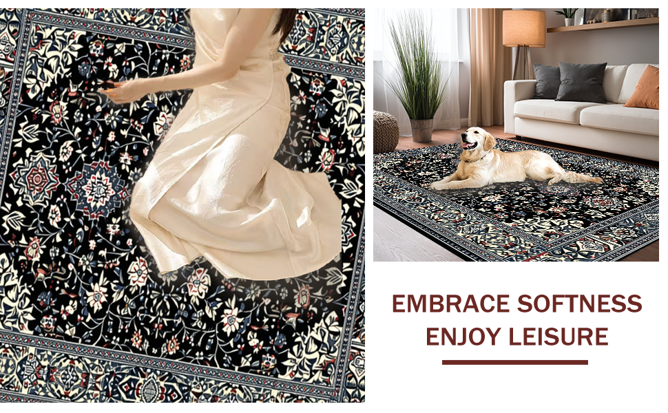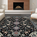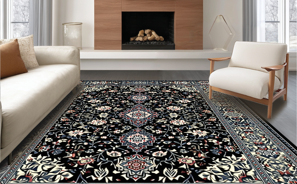 Ultra Soft Area Rug, Non Slip, Stain Resistant, Washable Area Rugs for Living Room, Bedroom, Dynamic Vintage-Inspired Floral Scheme(Black) Overview: