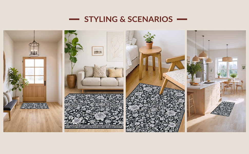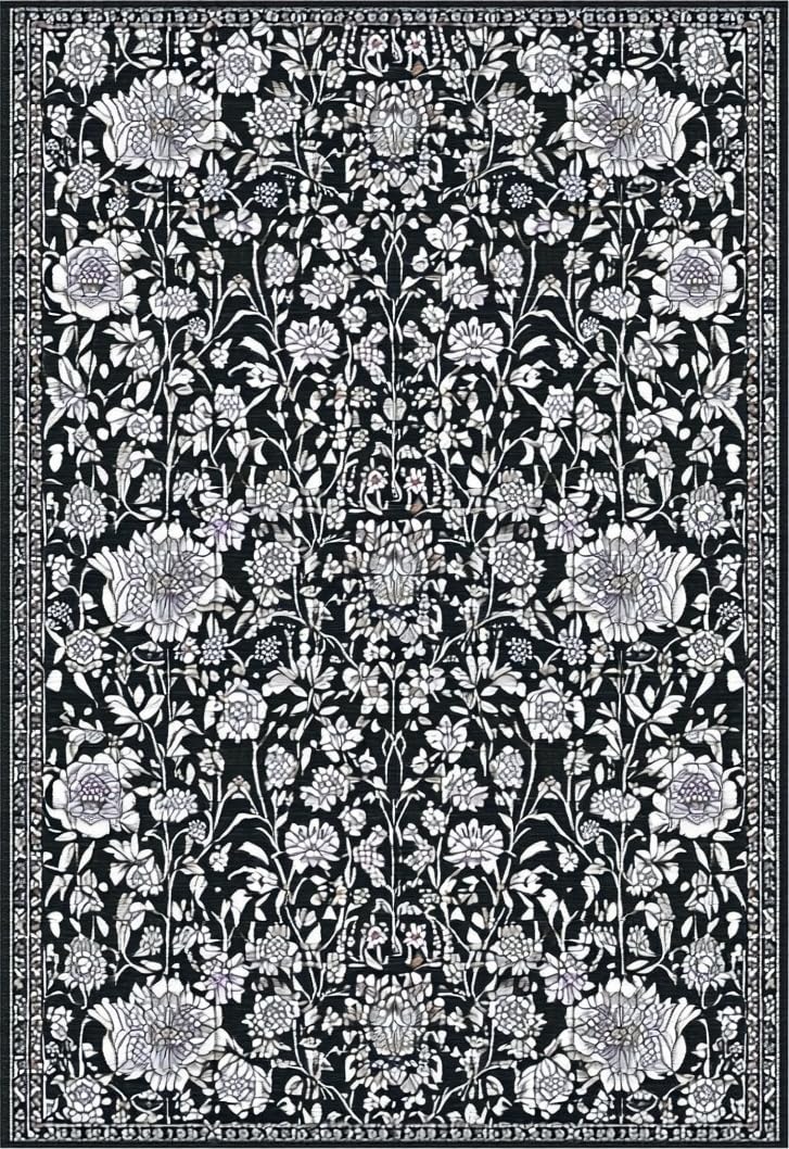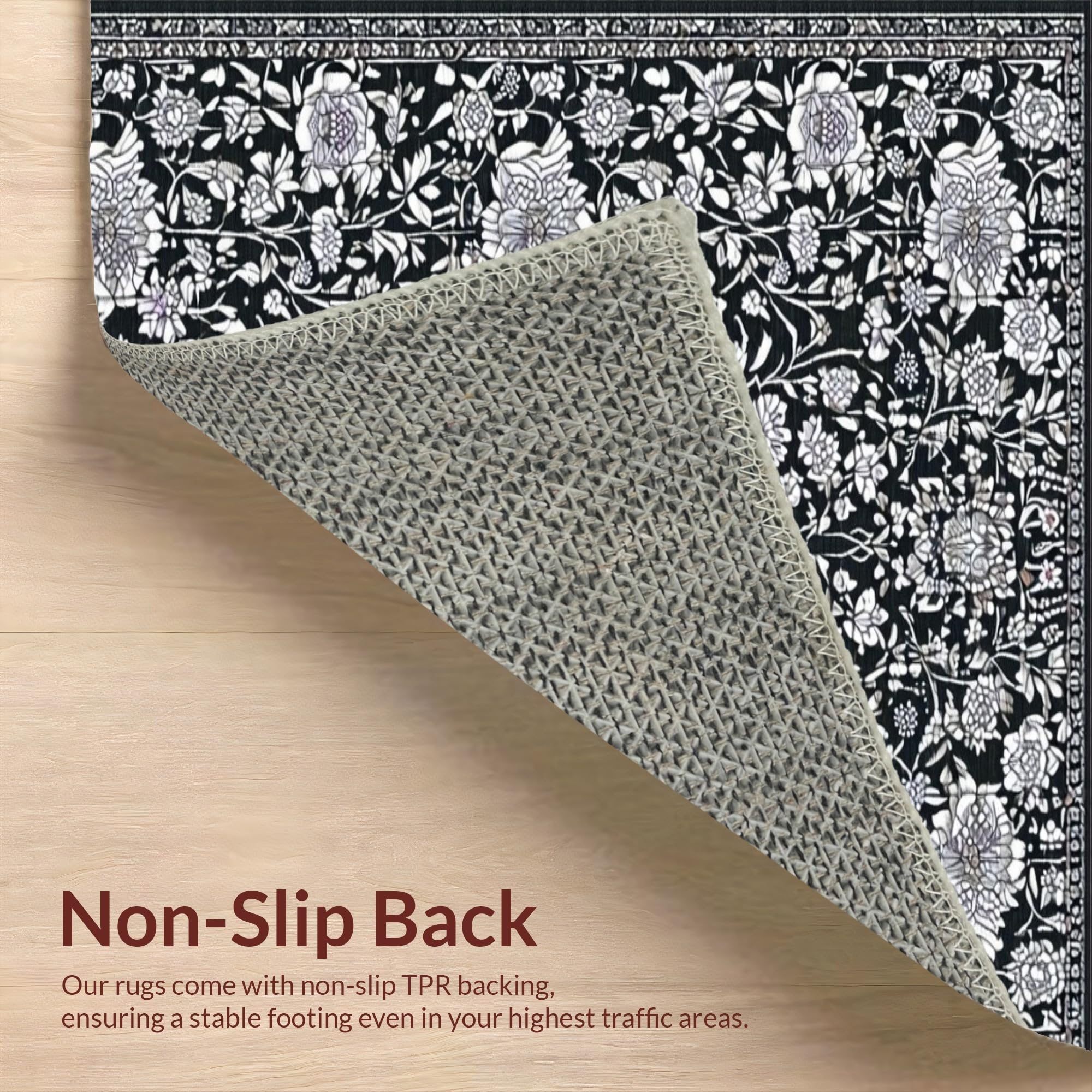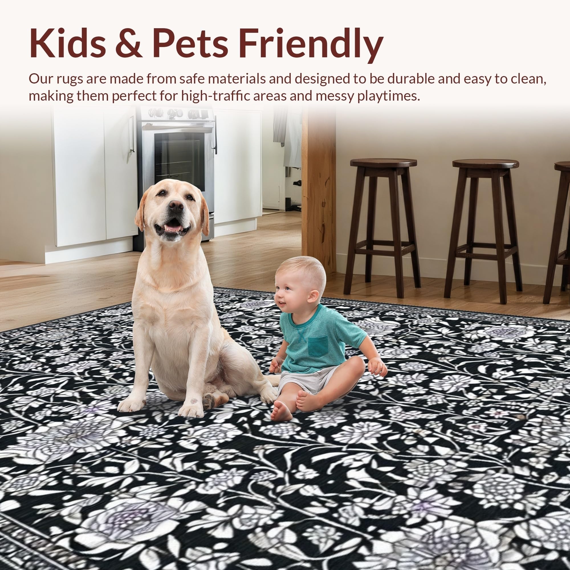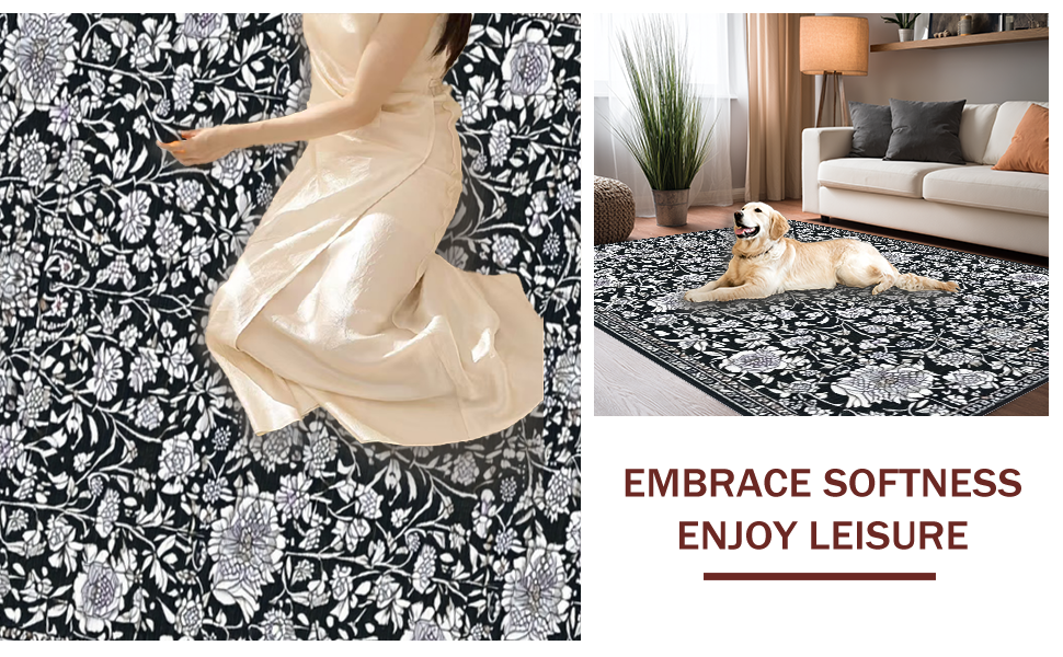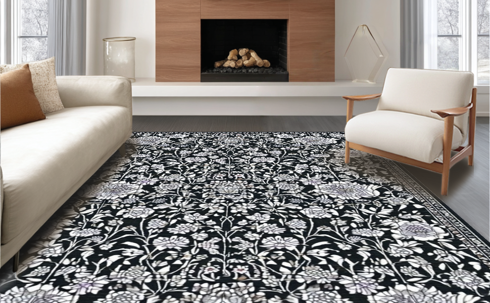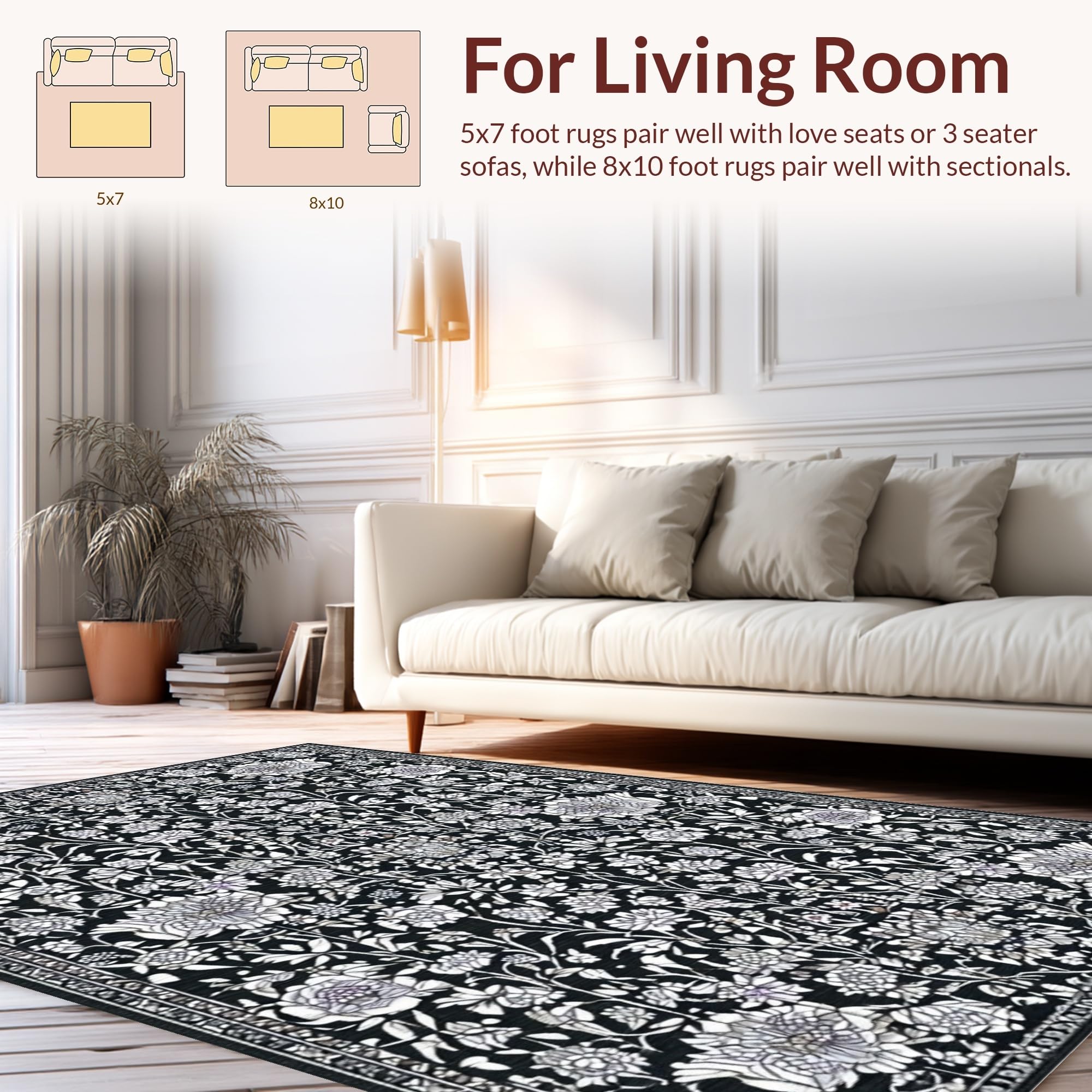 Ultra Soft Area Rug, Non Slip, Stain Resistant, Washable Area Rugs for Living Room, Bedroom, Earthy Vintage Petal Patterns(Black) Overview: