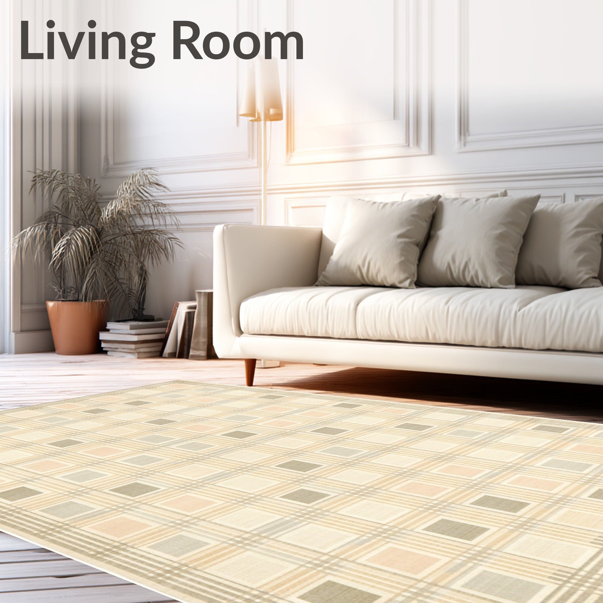 Ultra Soft Area Rug, Non Slip, Stain Resistant, Washable Area Rugs for Living Room, Bedroom, Eclectic Checkered Area with Vintage Beige Squares and Subtle Accent Shapes(Beige) Overview: