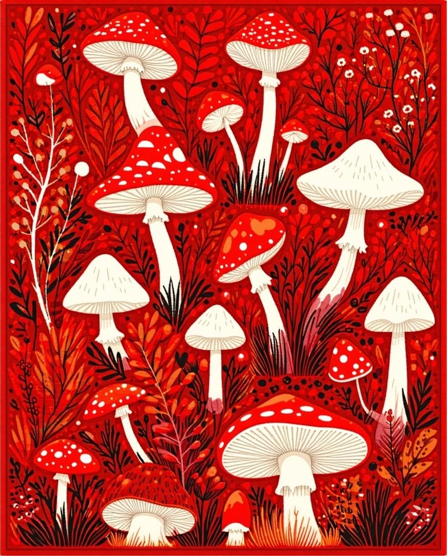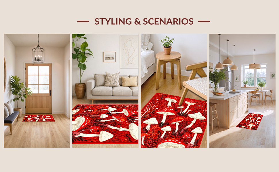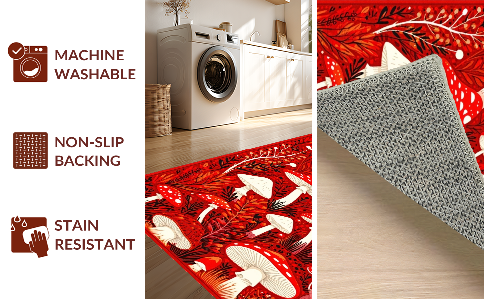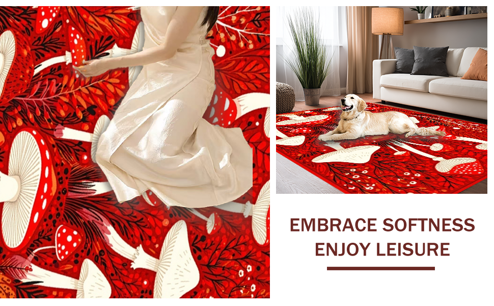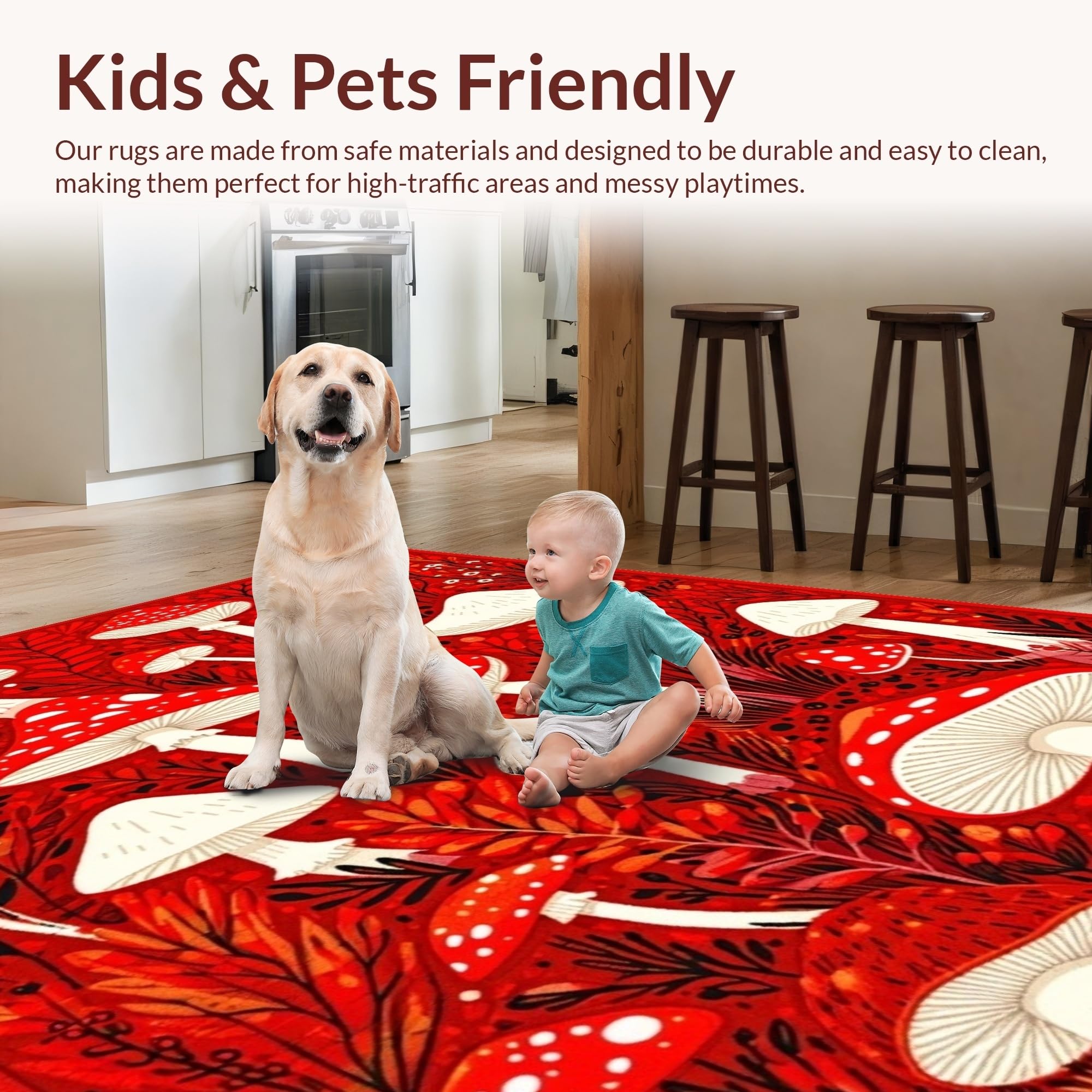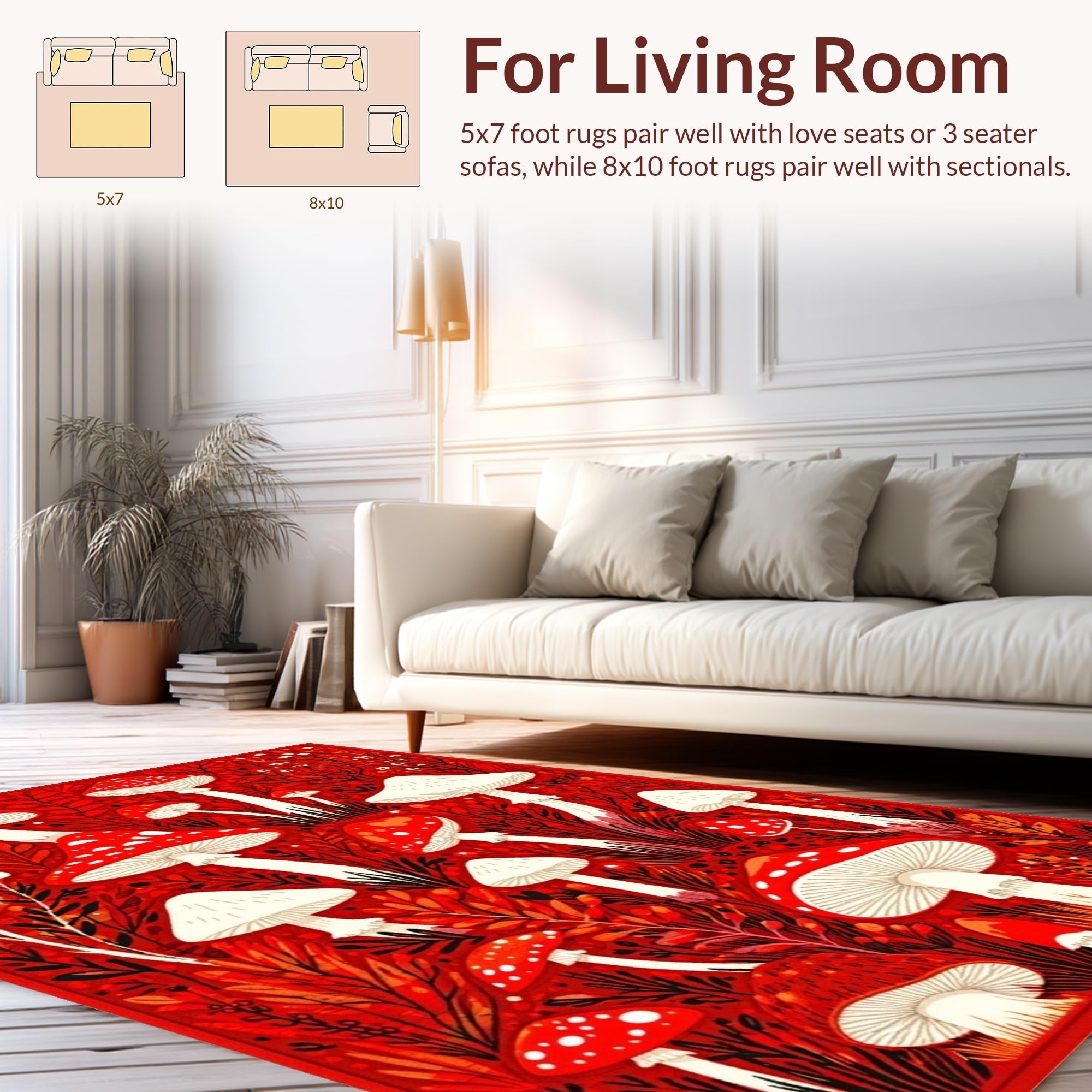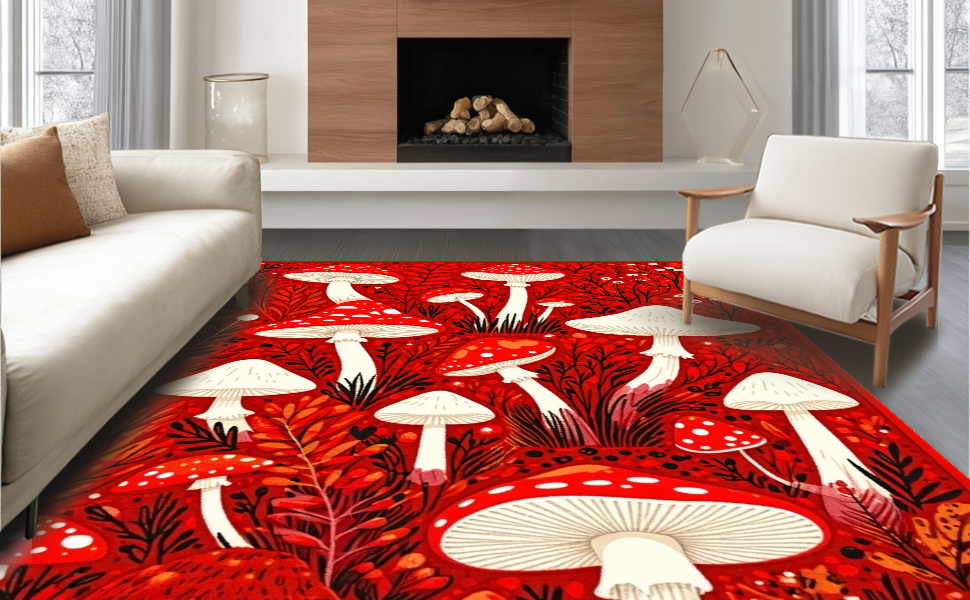 Ultra Soft Area Rug, Non Slip, Stain Resistant, Washable Area Rugs for Living Room, Bedroom, Eclectic Cozy Mushroom Design(Red) Overview:
